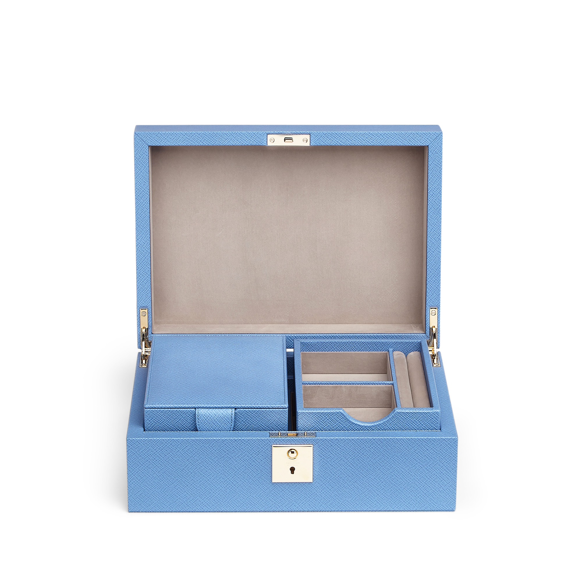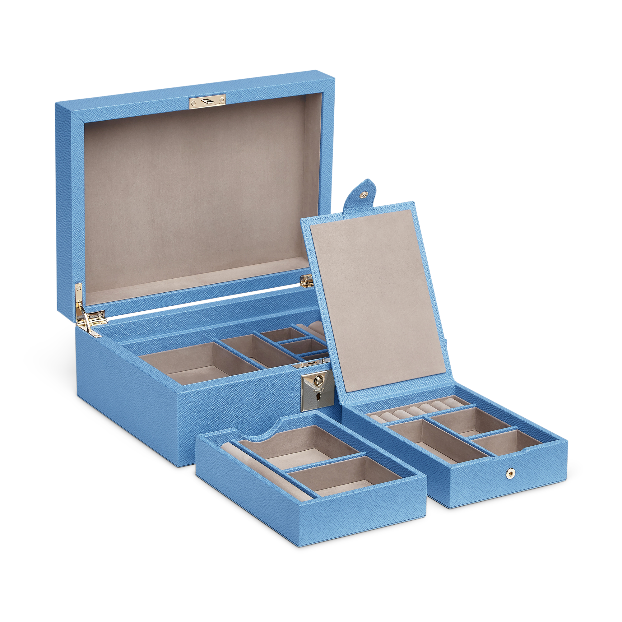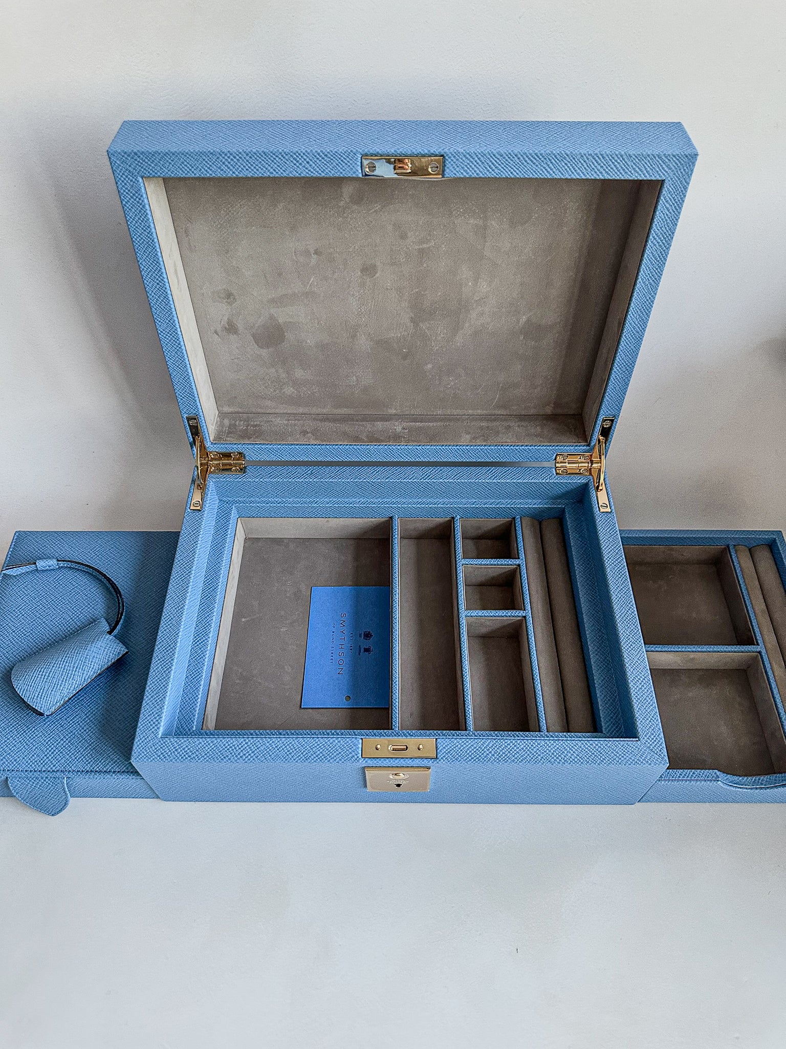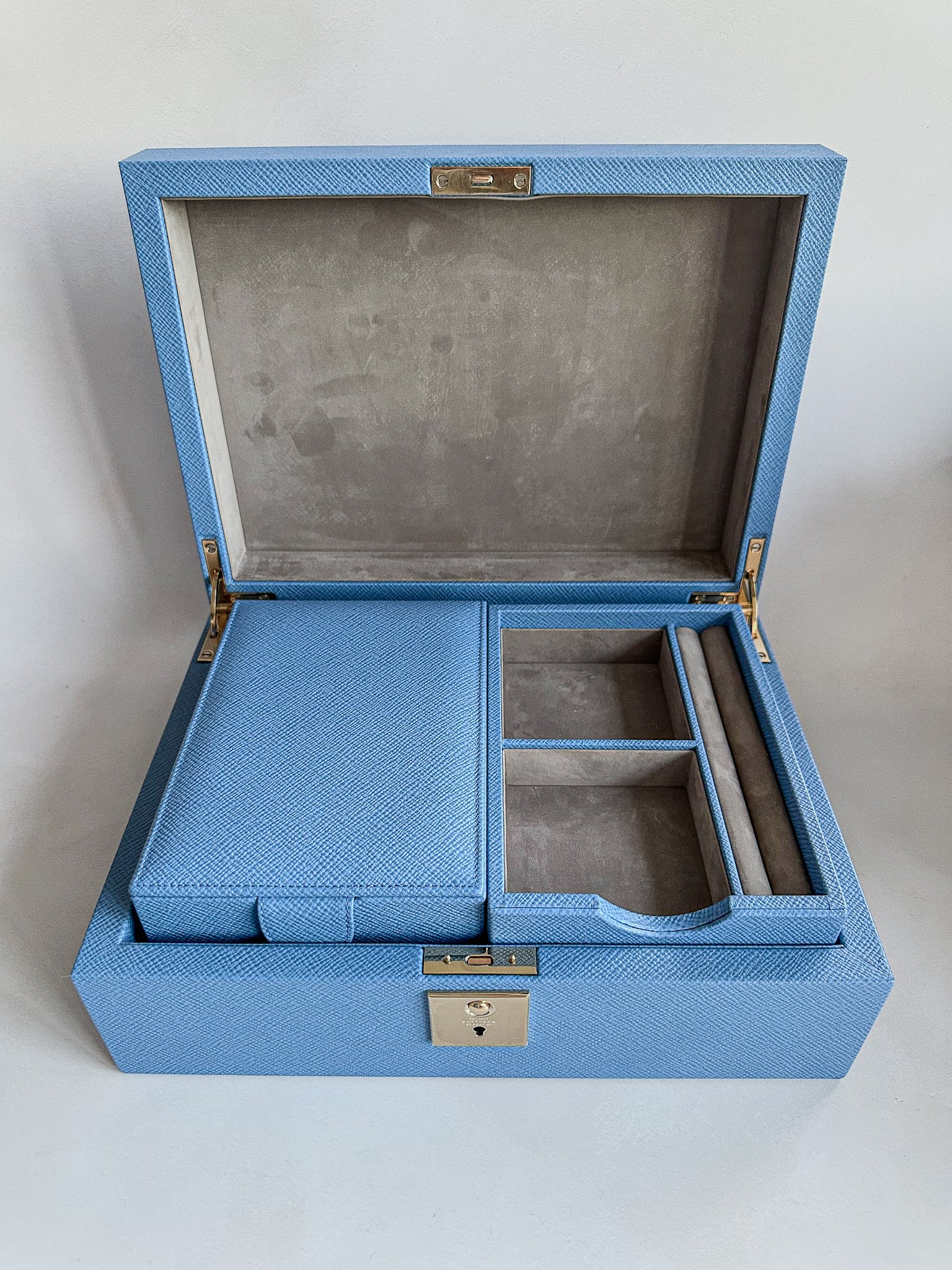 - Nile blue jewellery box with travel tray in cross grain calf leather