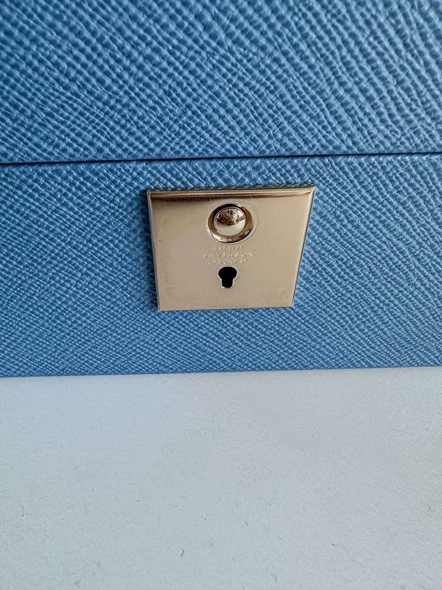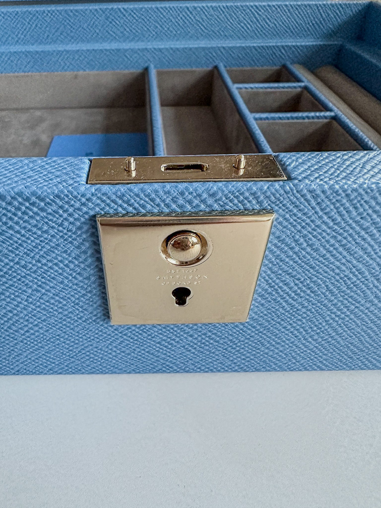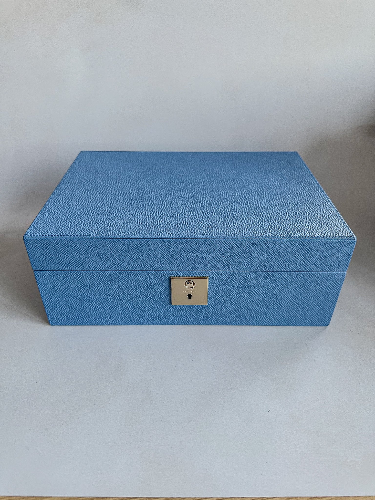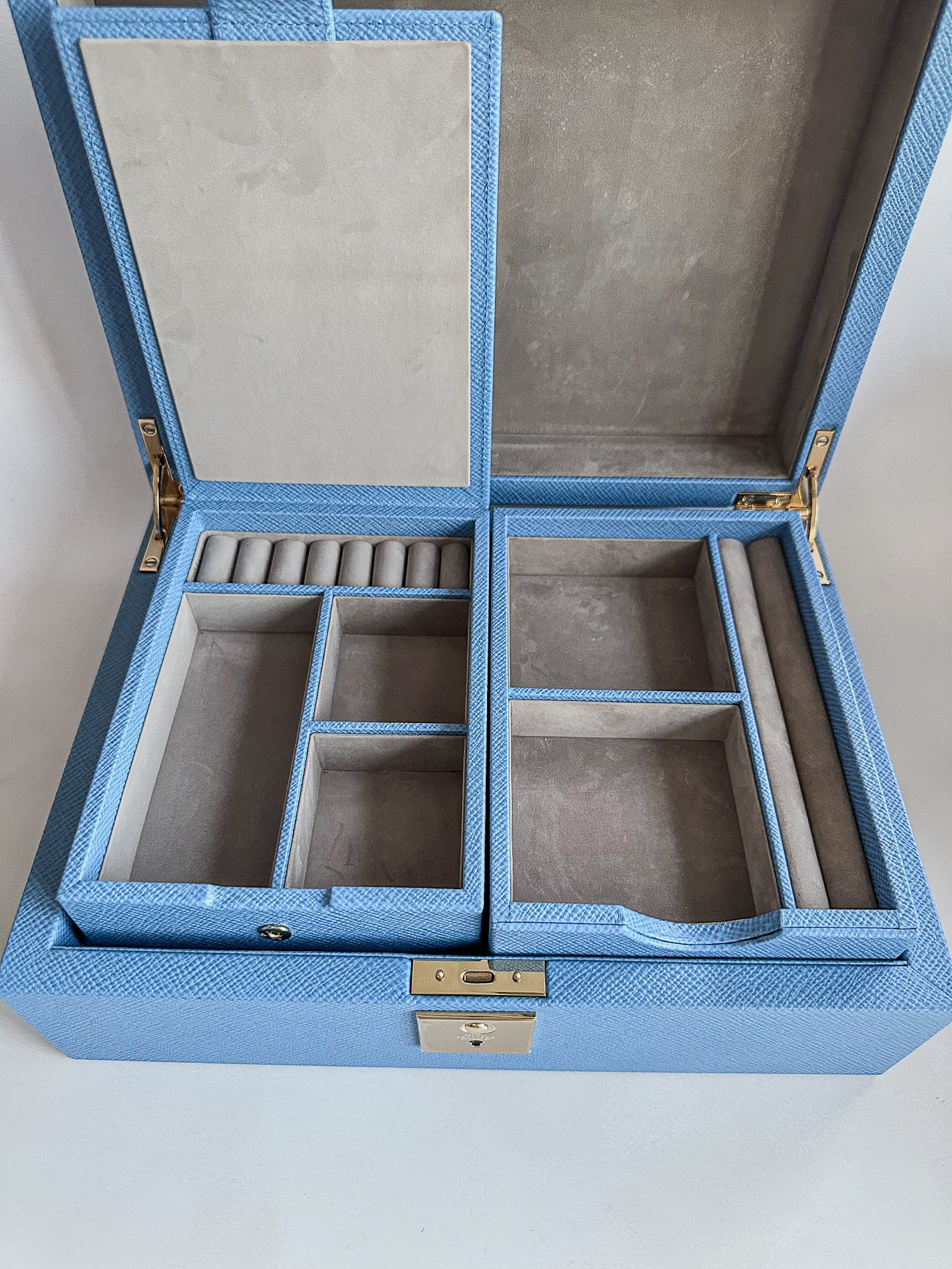 - Nile blue jewellery box with travel tray in cross grain calf leather