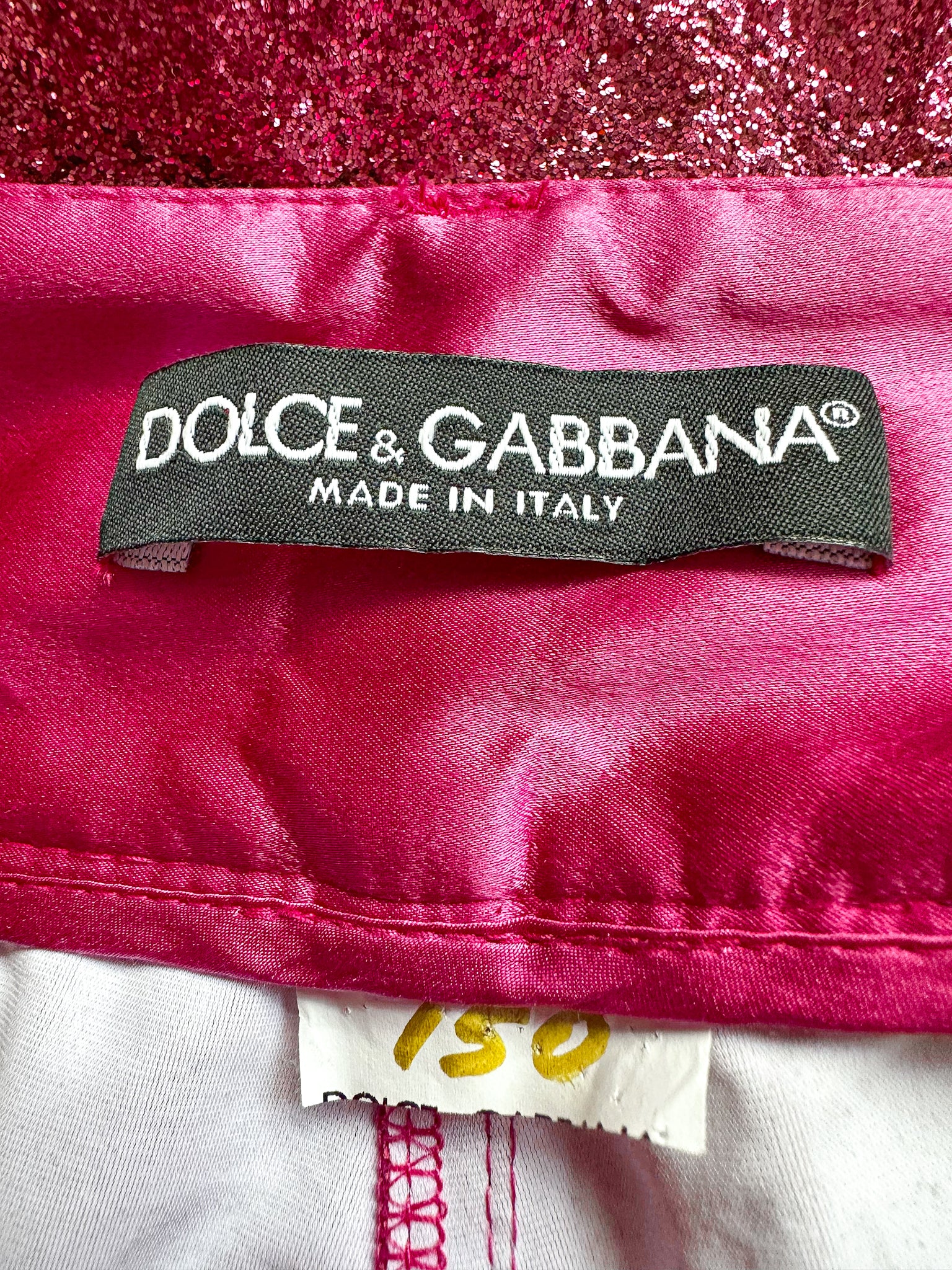 Elevate your evening wardrobe with these stunning Dolce & Gabbana trousers, crafted from a luxurious fabric infused with delicate pink glitter and shimmering accents. The refined silhouette offers a flattering fit that transitions seamlessly from cocktail events to upscale celebrations. Impeccable tailoring and premium construction ensure these statement trousers become a treasured piece in your collection. Perfect for those who appreciate understated glamour with an unmistakable touch of sparkle. Warning: It leaves glitter everywhere.
