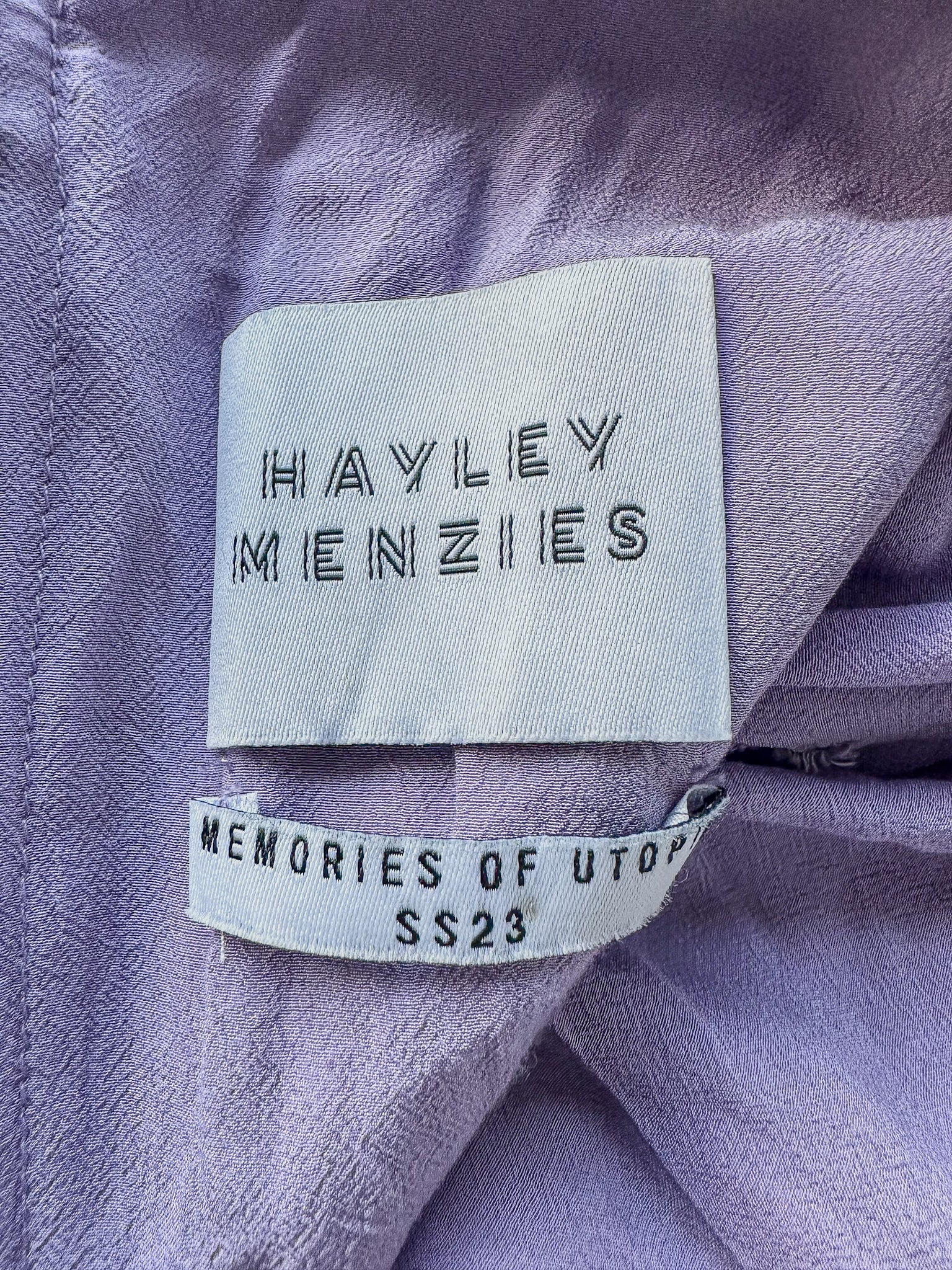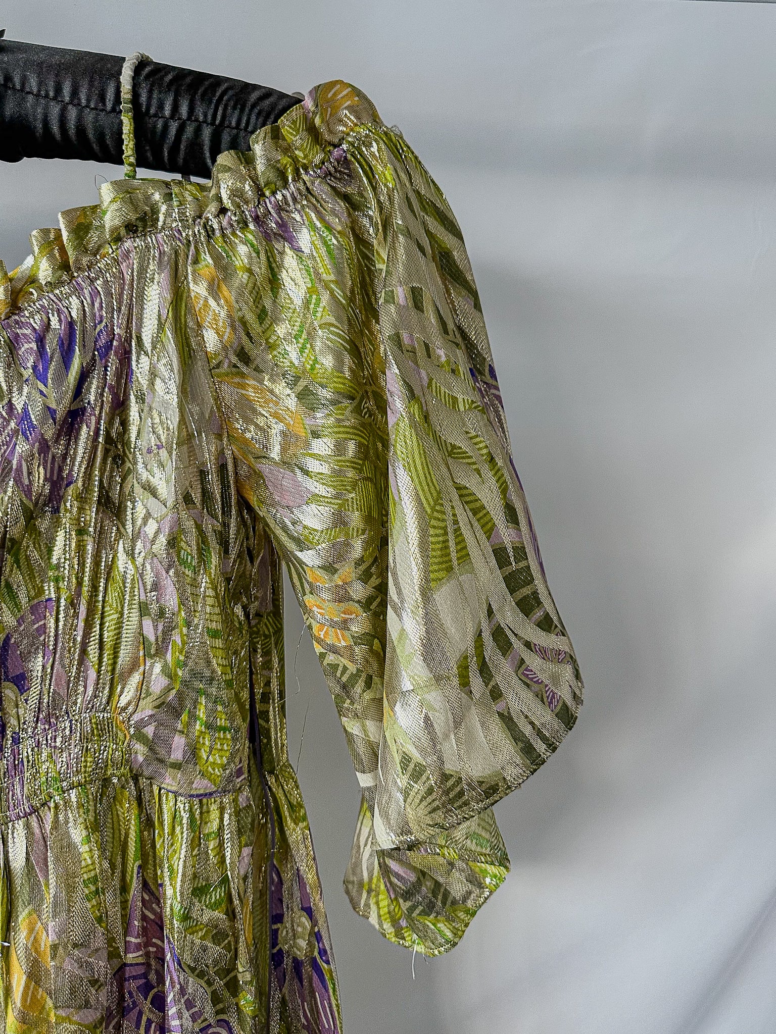 Hayley Menzies Tropical Hibiscus Shimmering Gold Off Shoulder Silk Dress