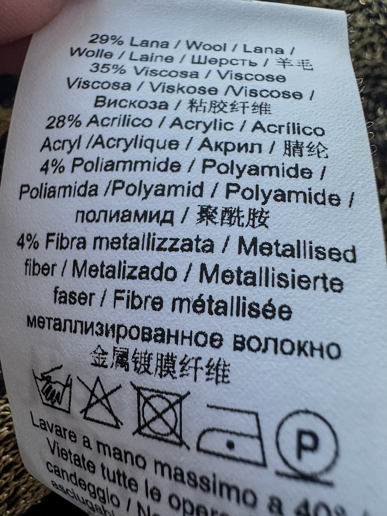 - 35% viscose, 29% wool, 28% acrylic, 4% metallic fibres, 4% polyamide