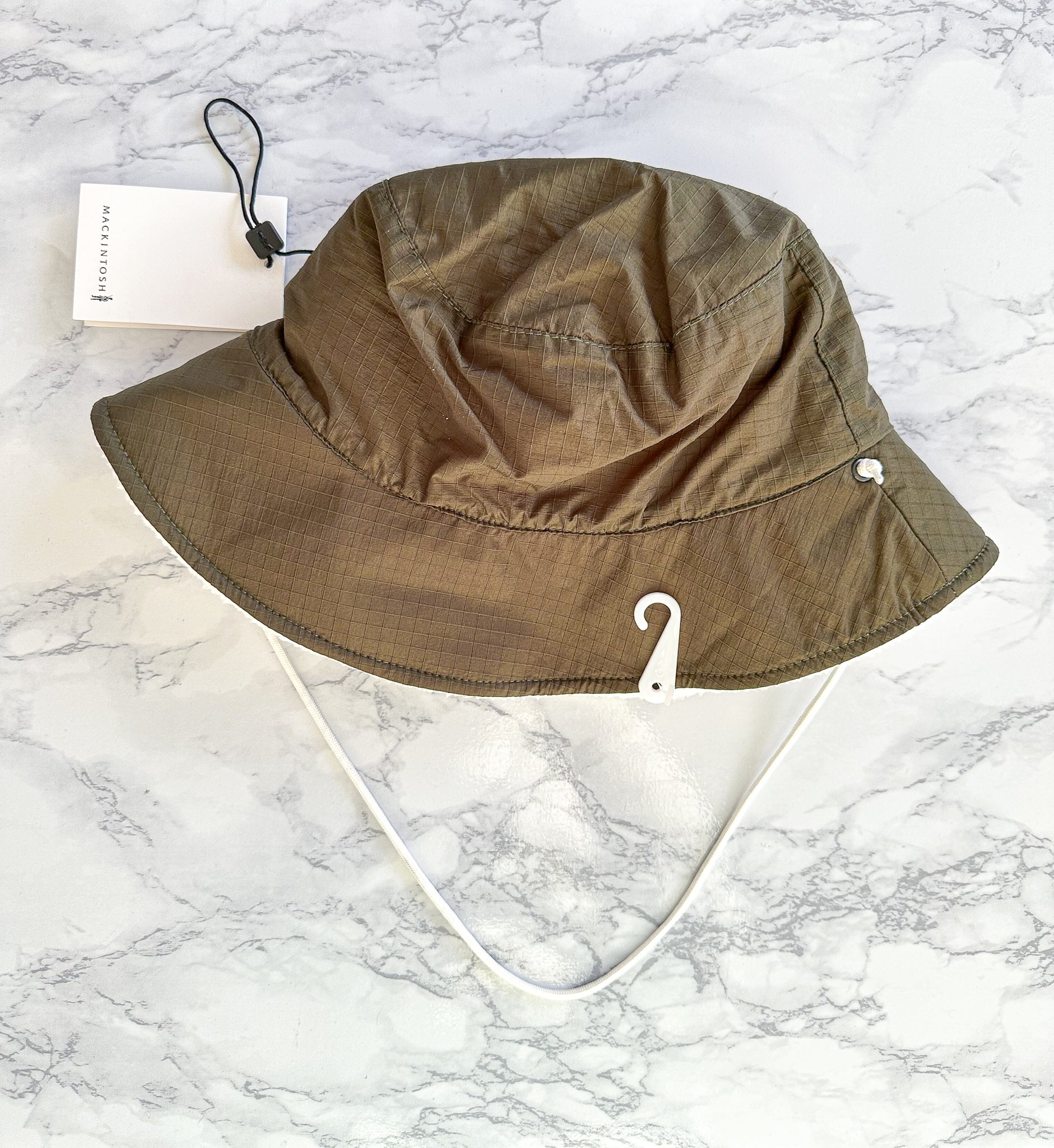 The Chillin bucket hat in khaki captures Mackintosh's emphasis on functional design. It's assembled from durable nylon and lined in fleece to provide protection in cold climates.