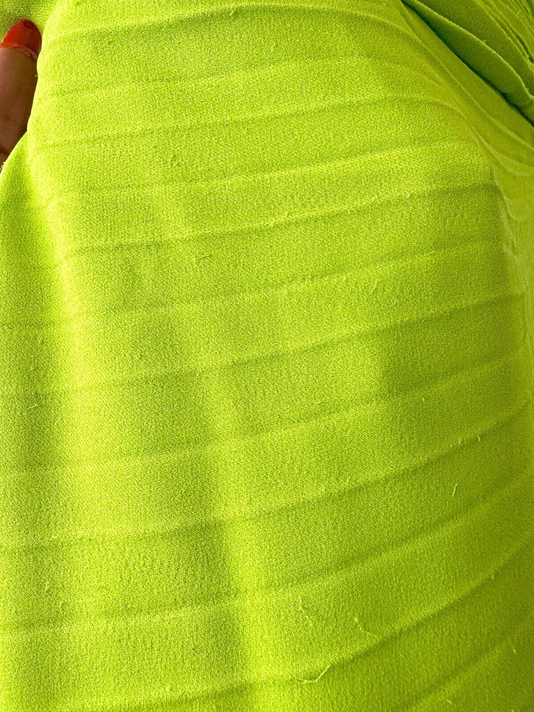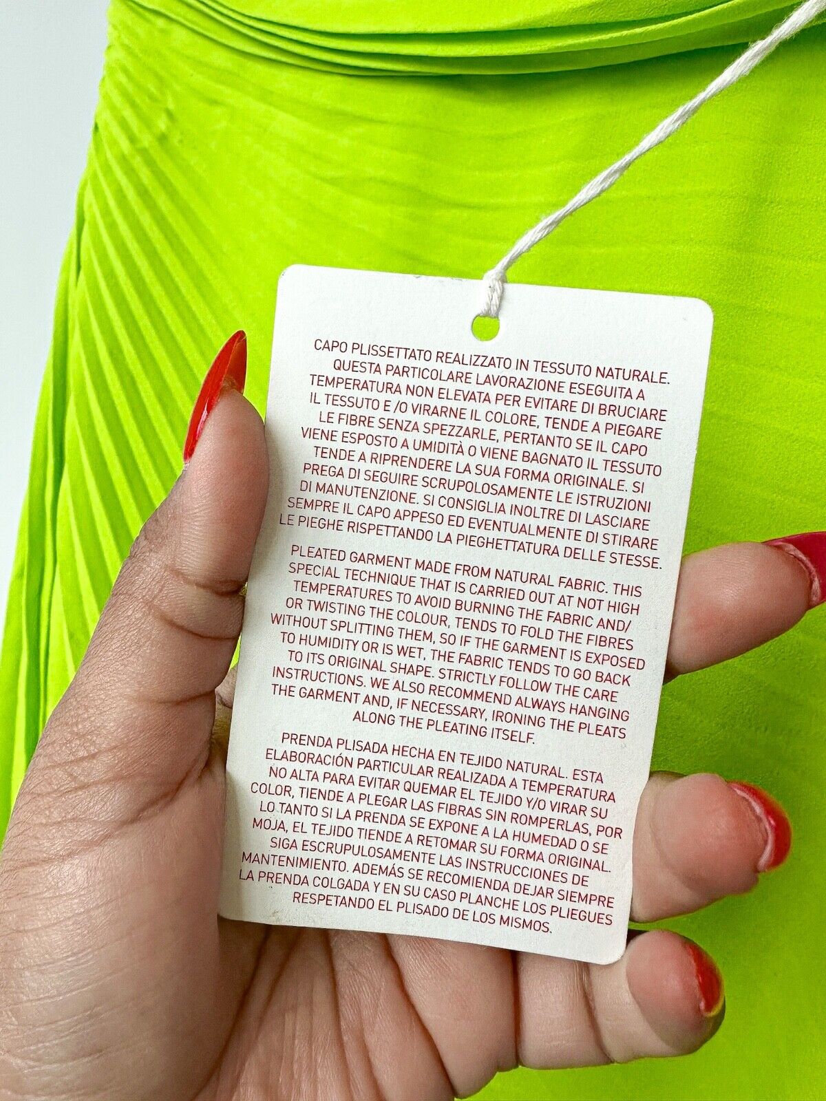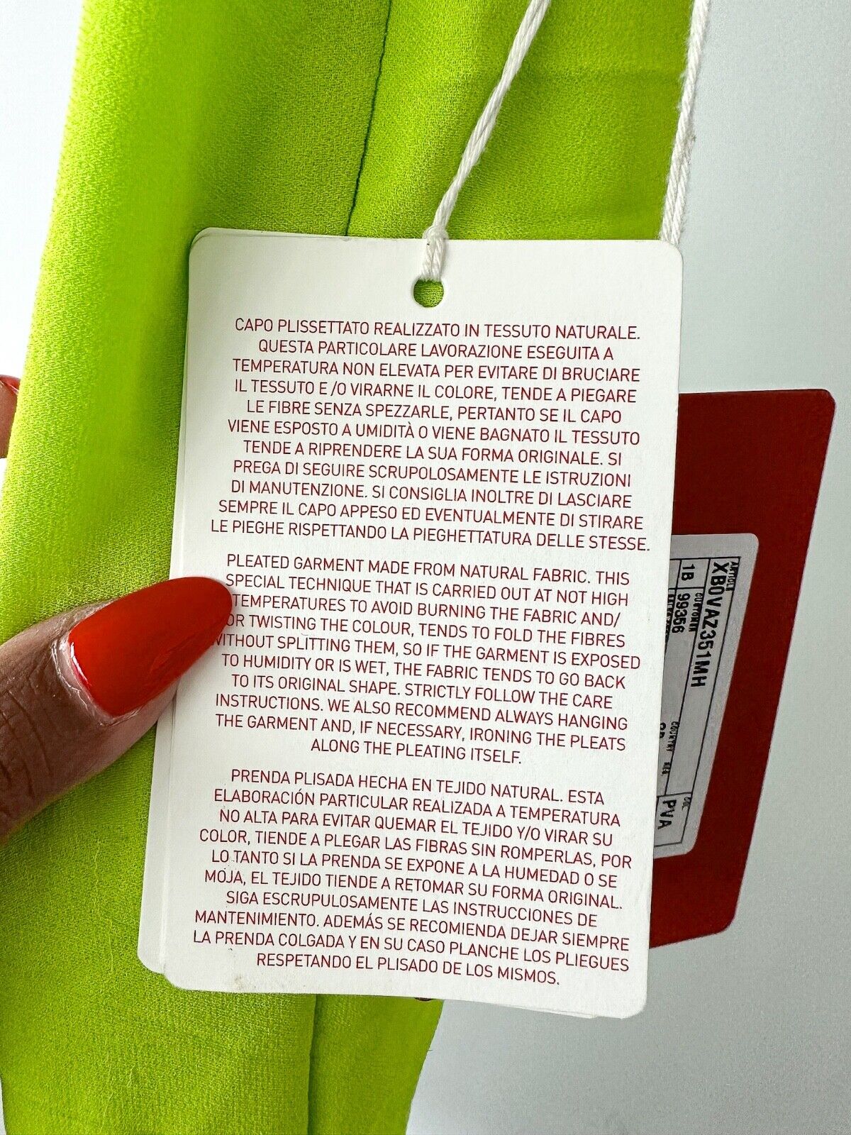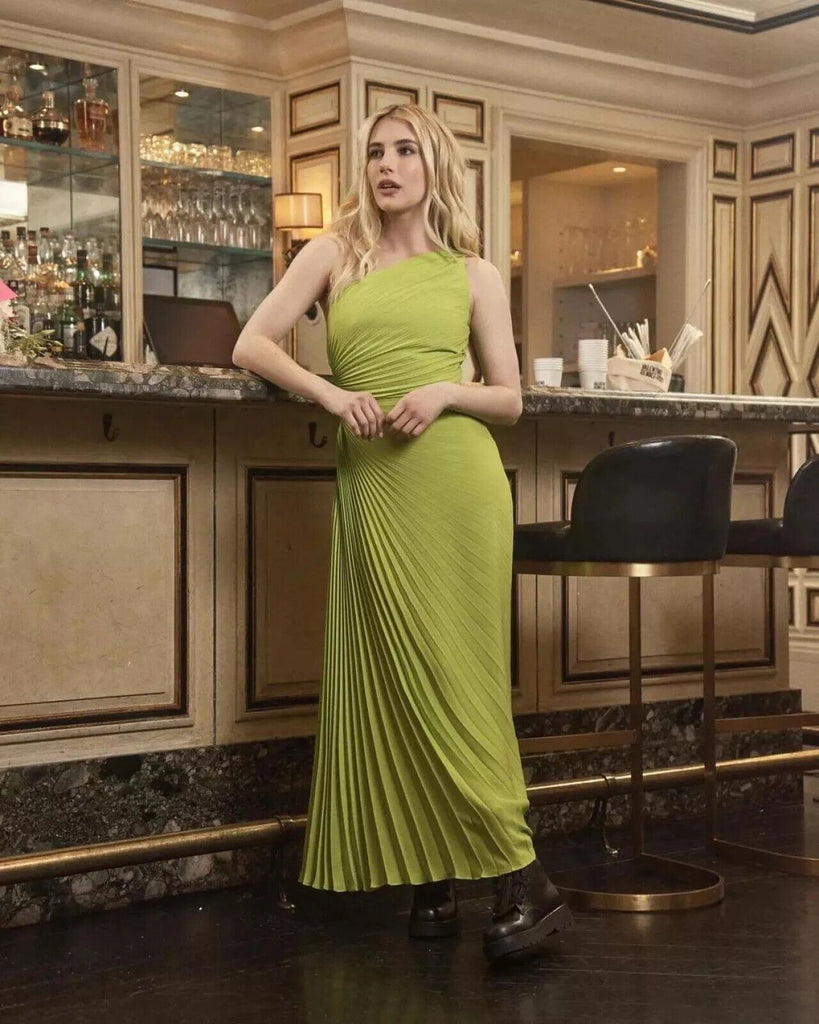 Valentino's lime-green dress is pressed with sharp pleats that gather at the hip and flare across the body. It's made from fluid silk-crepe and has a one-shoulder silhouette and cinched waist. Keep accessories on the minimal side.