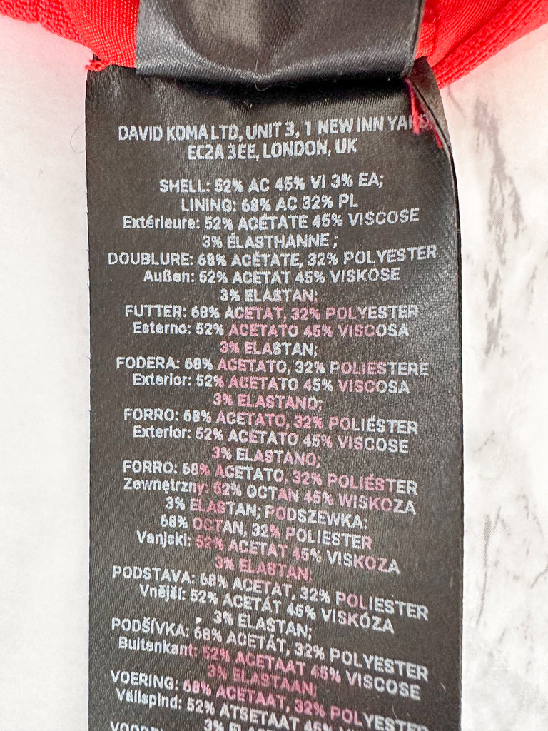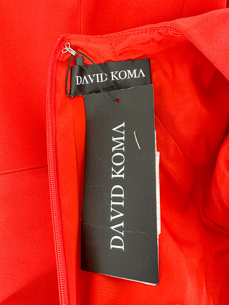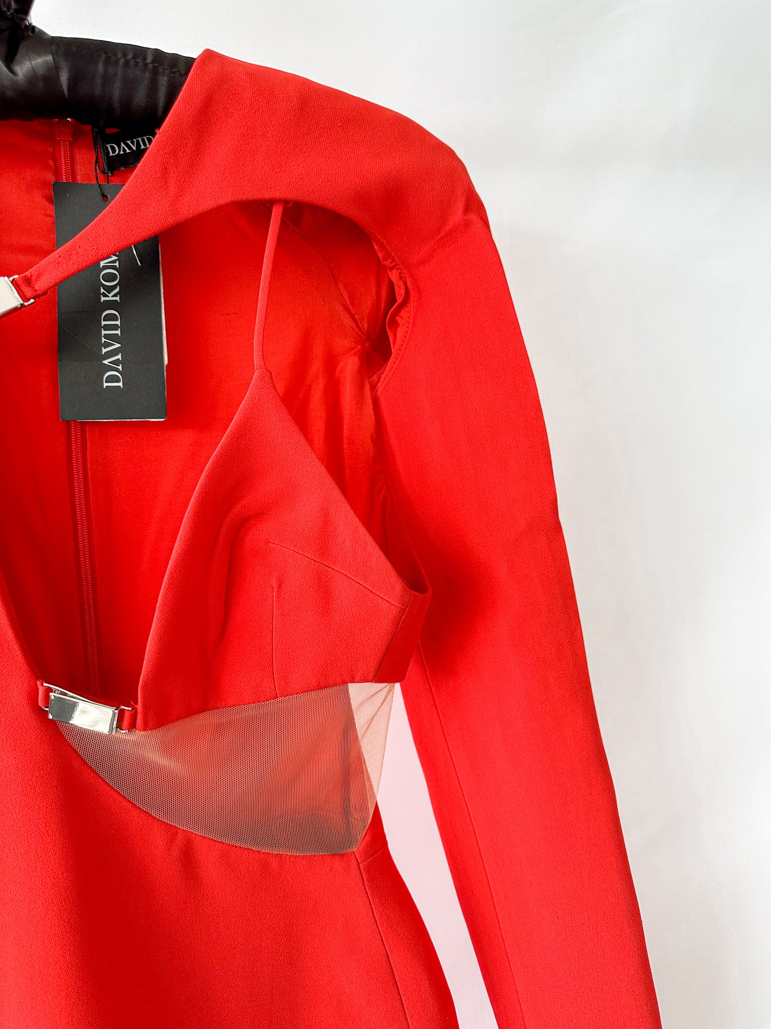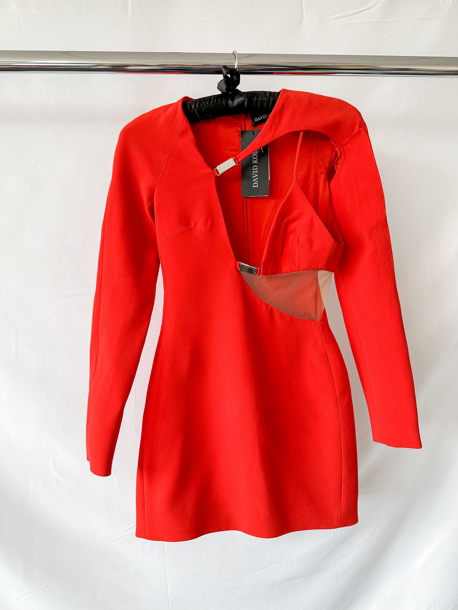 Turn heads with this daring David Koma mini dress, featuring bold red bra detailing and a striking cut-out mesh waist. The long sleeves balance the edgy design, creating a fierce silhouette that commands attention. Perfect for making a confident statement at any night out or special event.