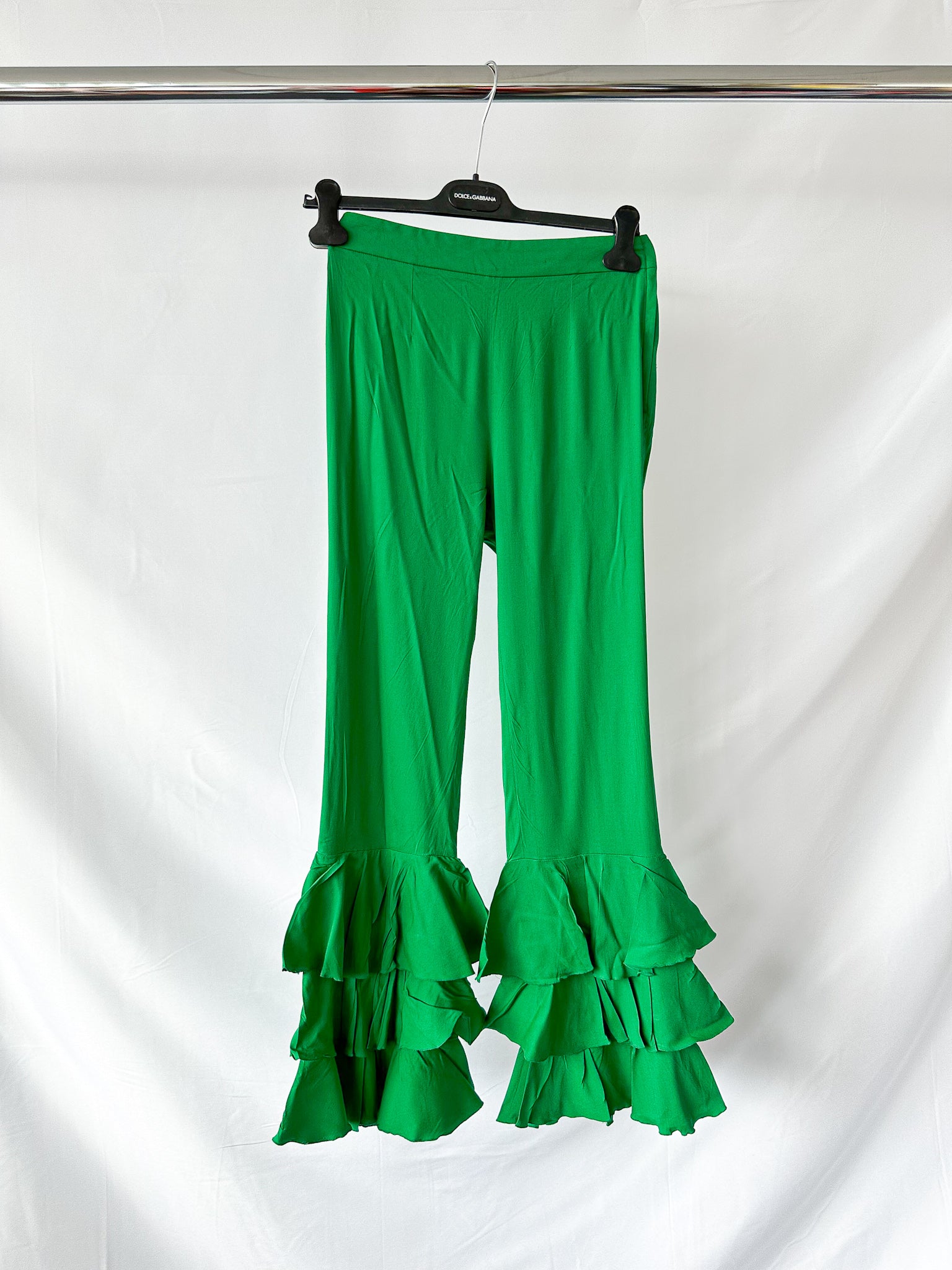 Dolce & Gabbana Green Frilly Flounce Layered Bell Bottom Trousers