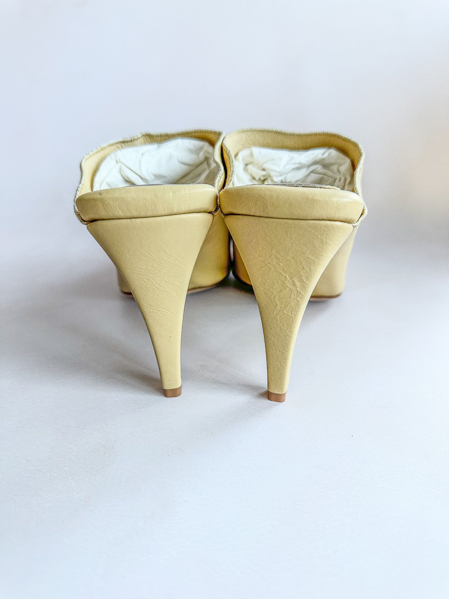 Bottega Veneta yellow crushed leather stretchy heel mules with heels It's like walking on sunshine with these butter-smooth yellow mules! They'll stretch to fit your feet and keep you stylishly grounded with their high heels.