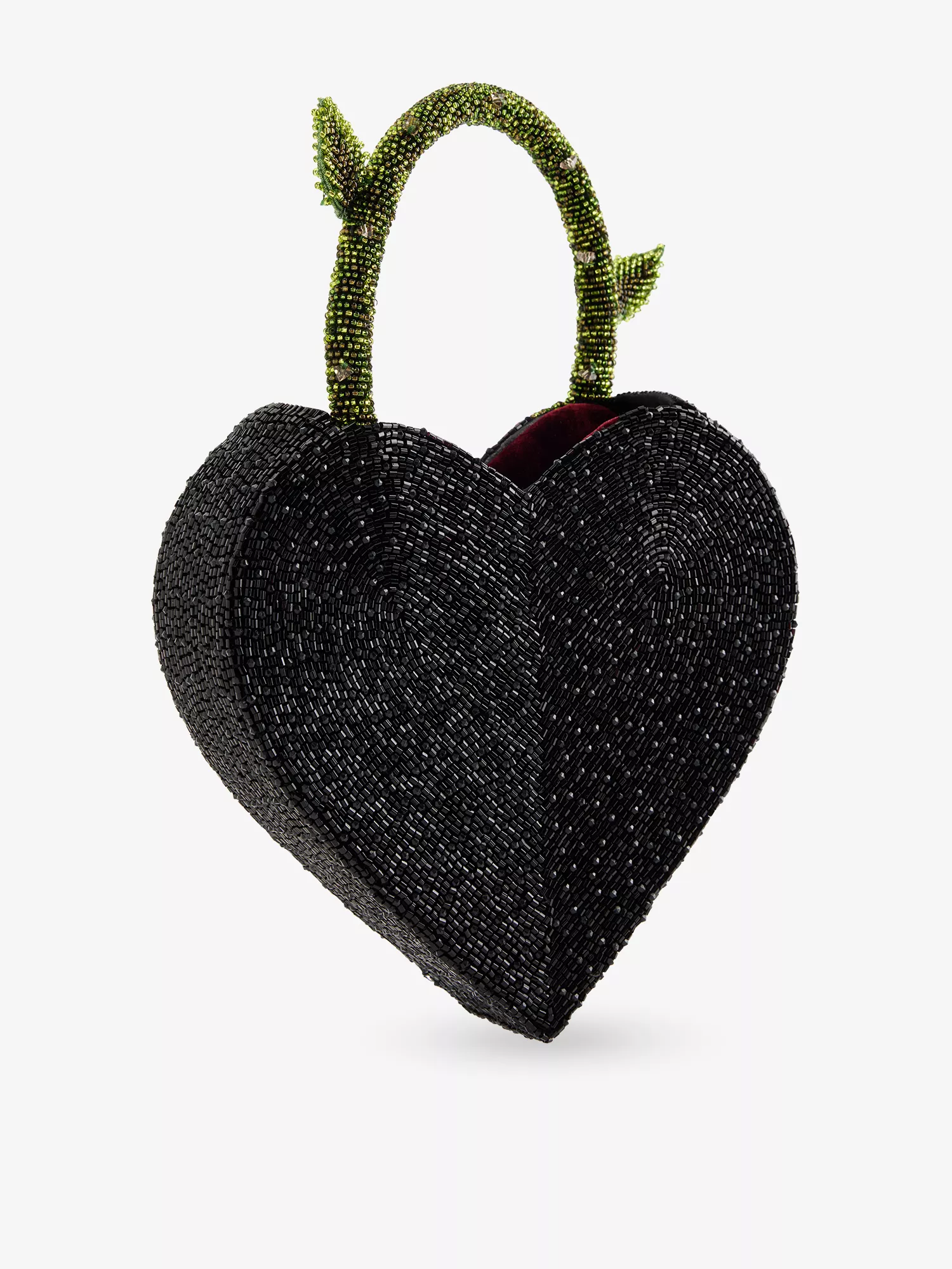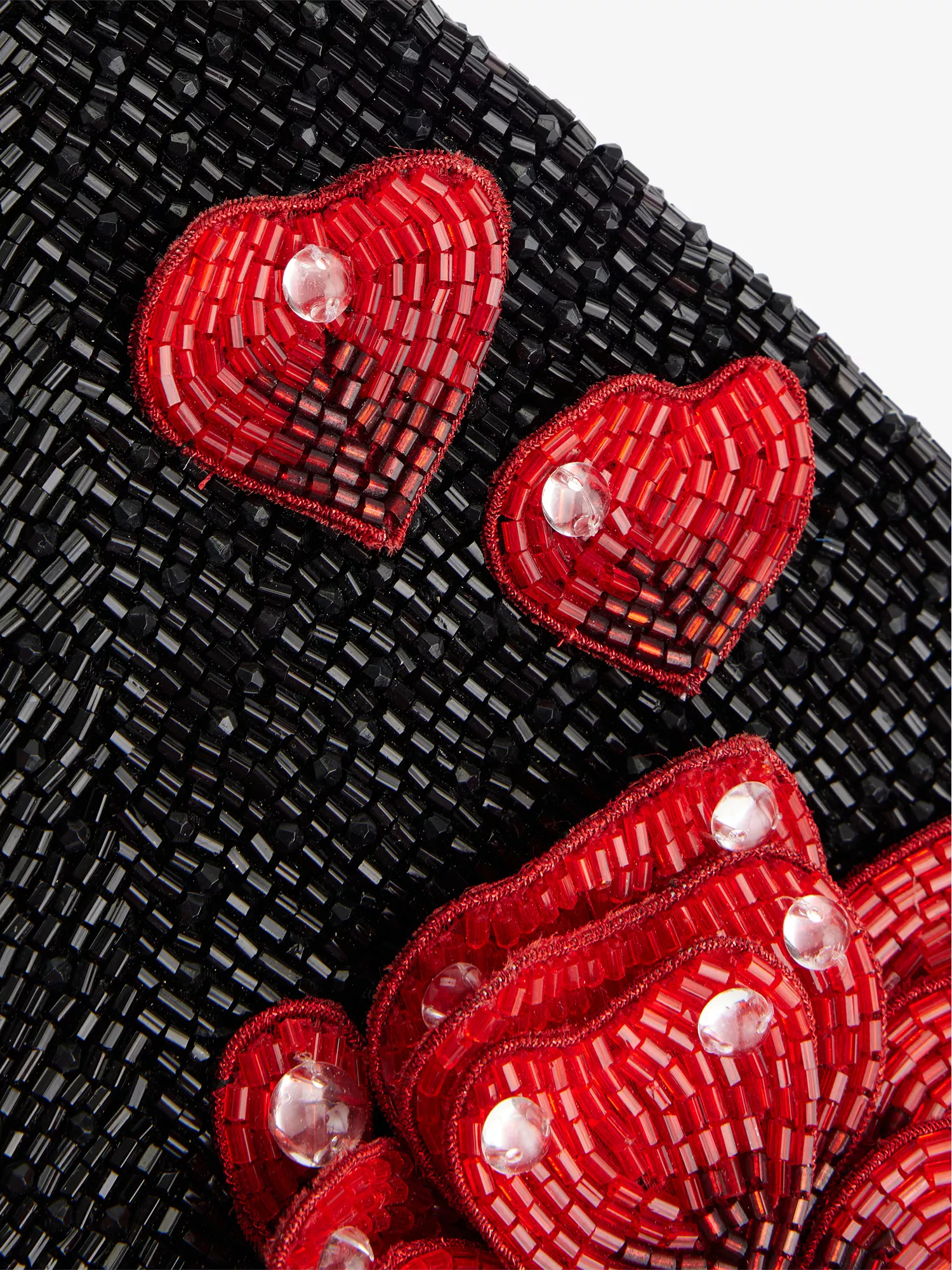 • Structured heart shape, top handle, one main compartment, all-over bead embellishment