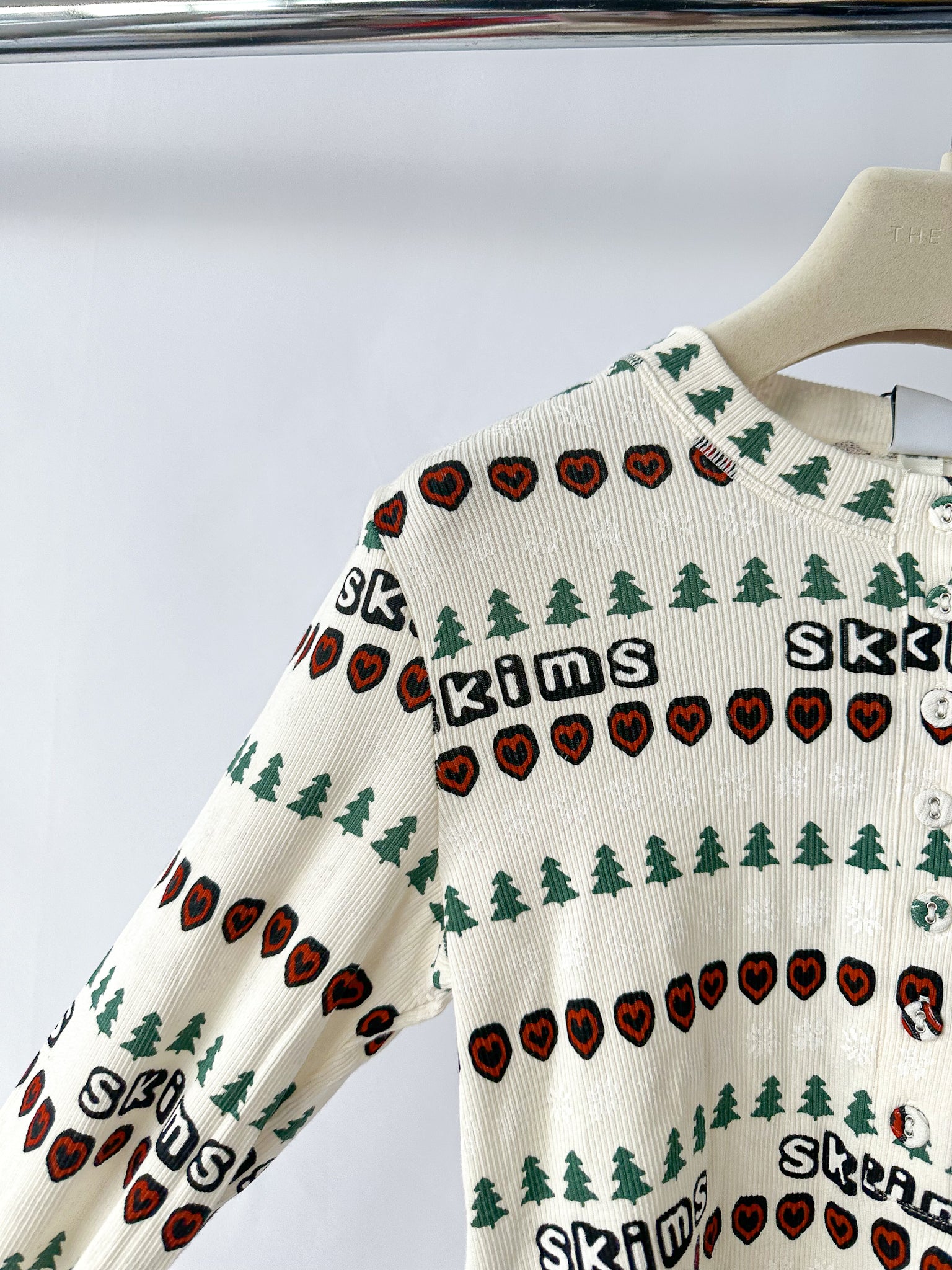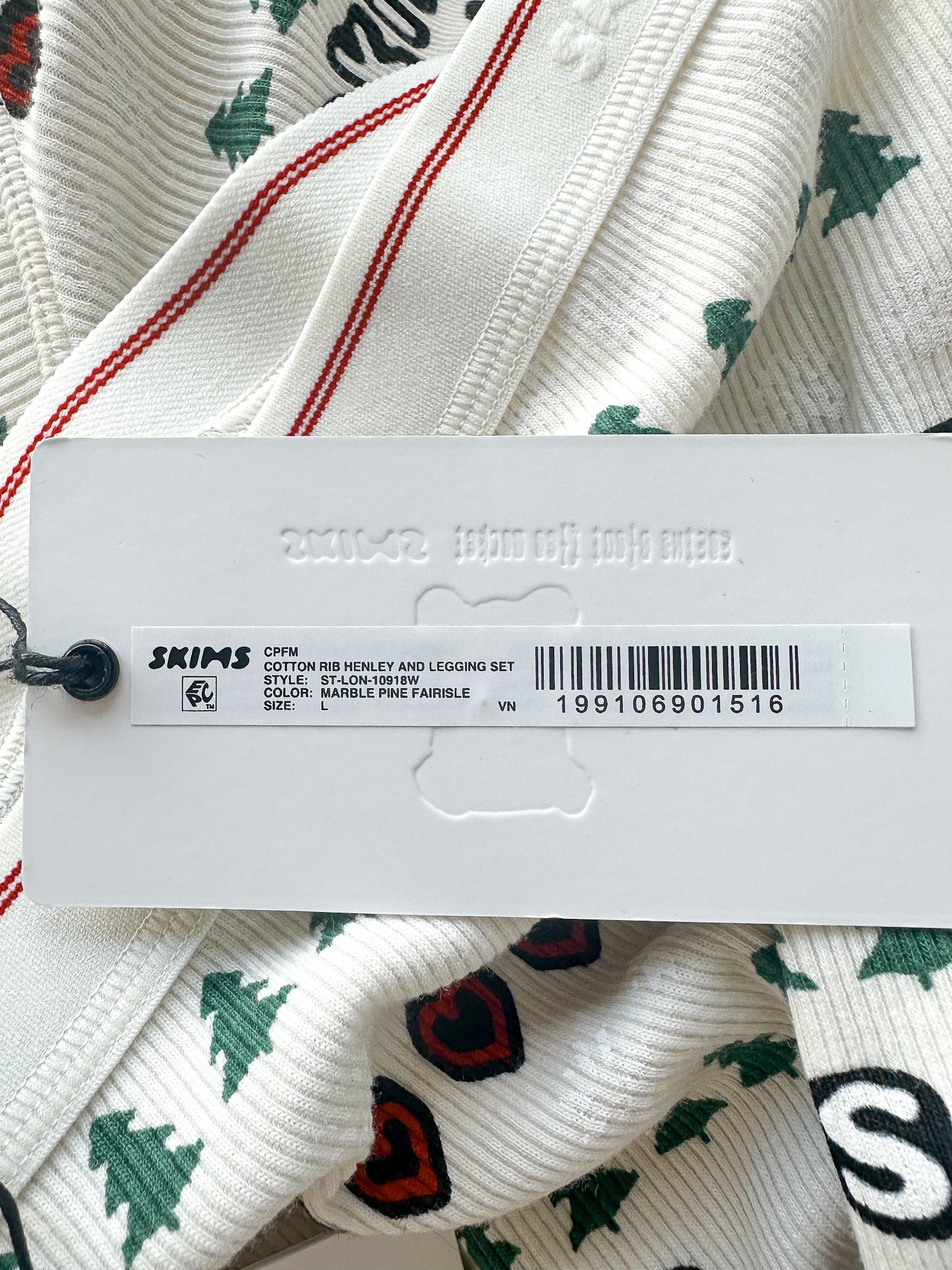 Elevate your loungewear game with this exclusive SKIMS x Cactus Plant Flea Market collaboration. Crafted from soft ribbed cotton, this henley lounge set combines comfort with bold, artistic flair. It features a fair isle print of pine trees and the "Skims" name allover. The relaxed fit makes it perfect for lazy days at home or casual outings, while the designer partnership brings a unique edge to everyday basics. Layer it, style it, or simply sink into pure comfort—this set does it all with personality to spare.