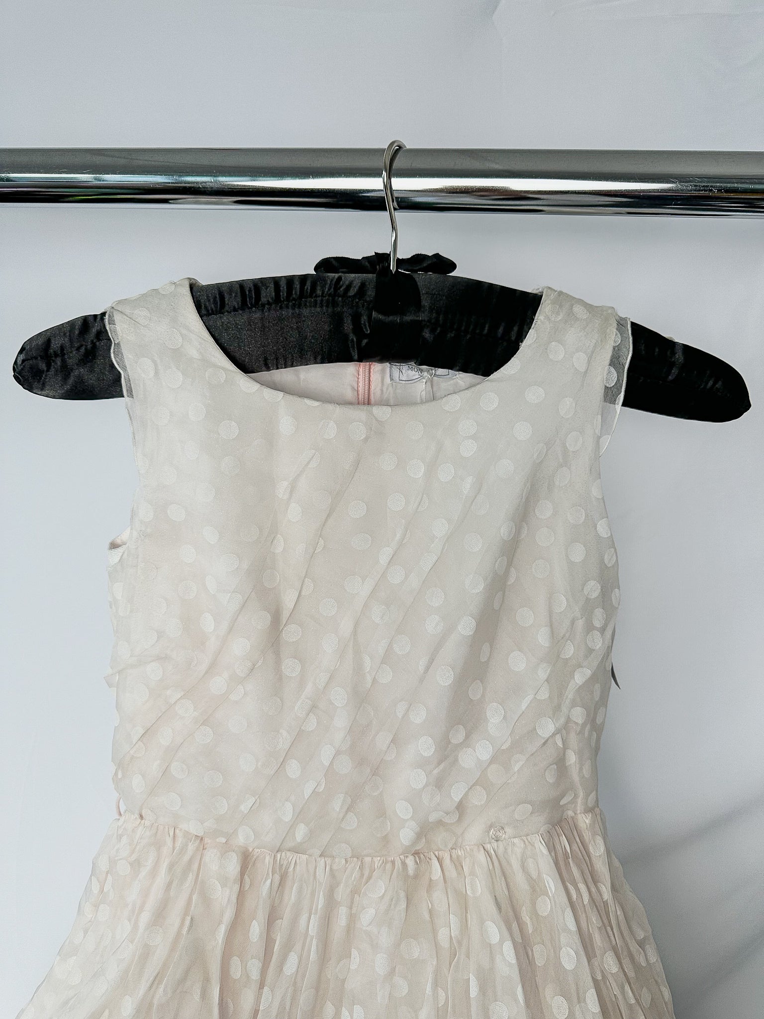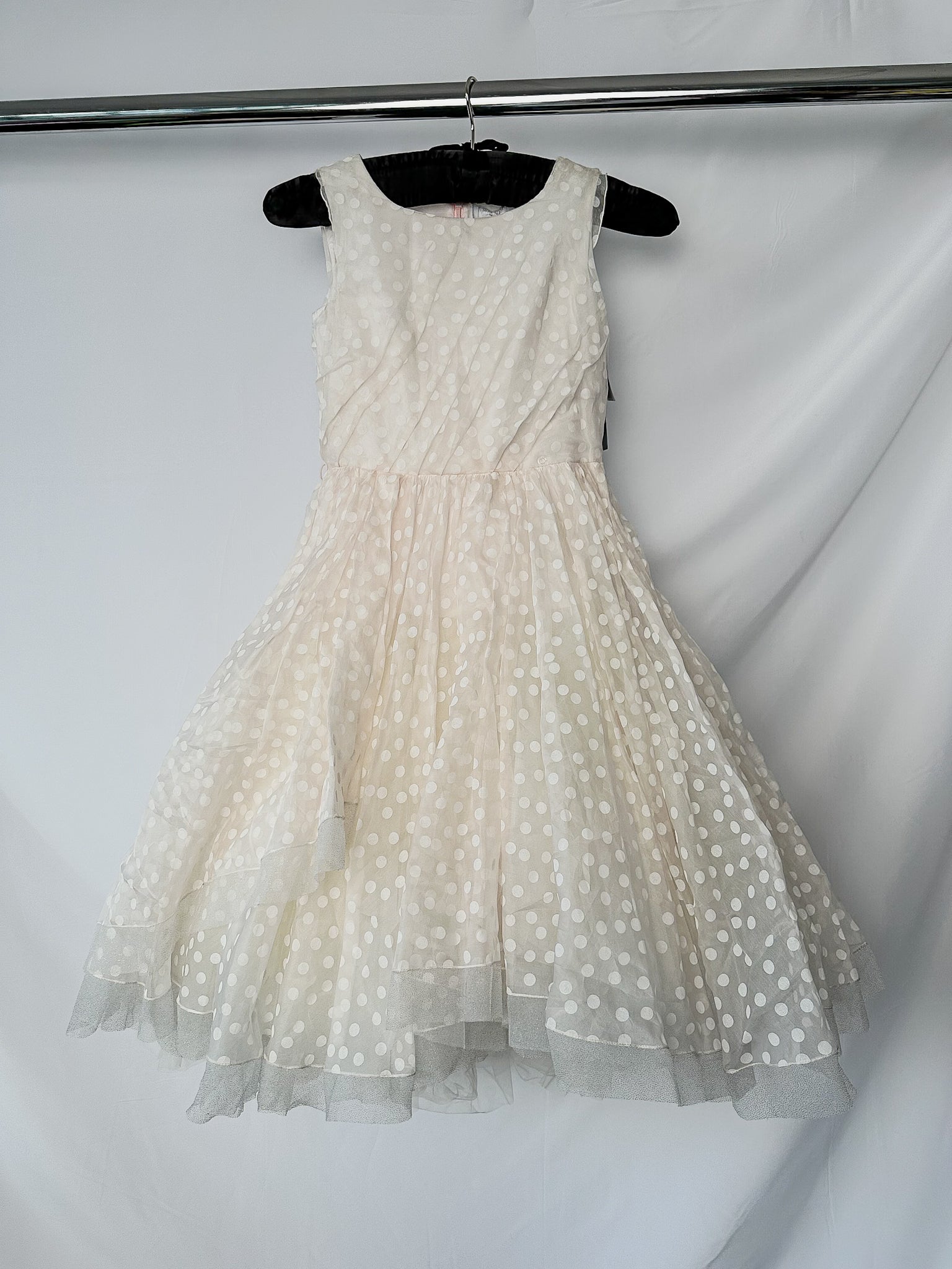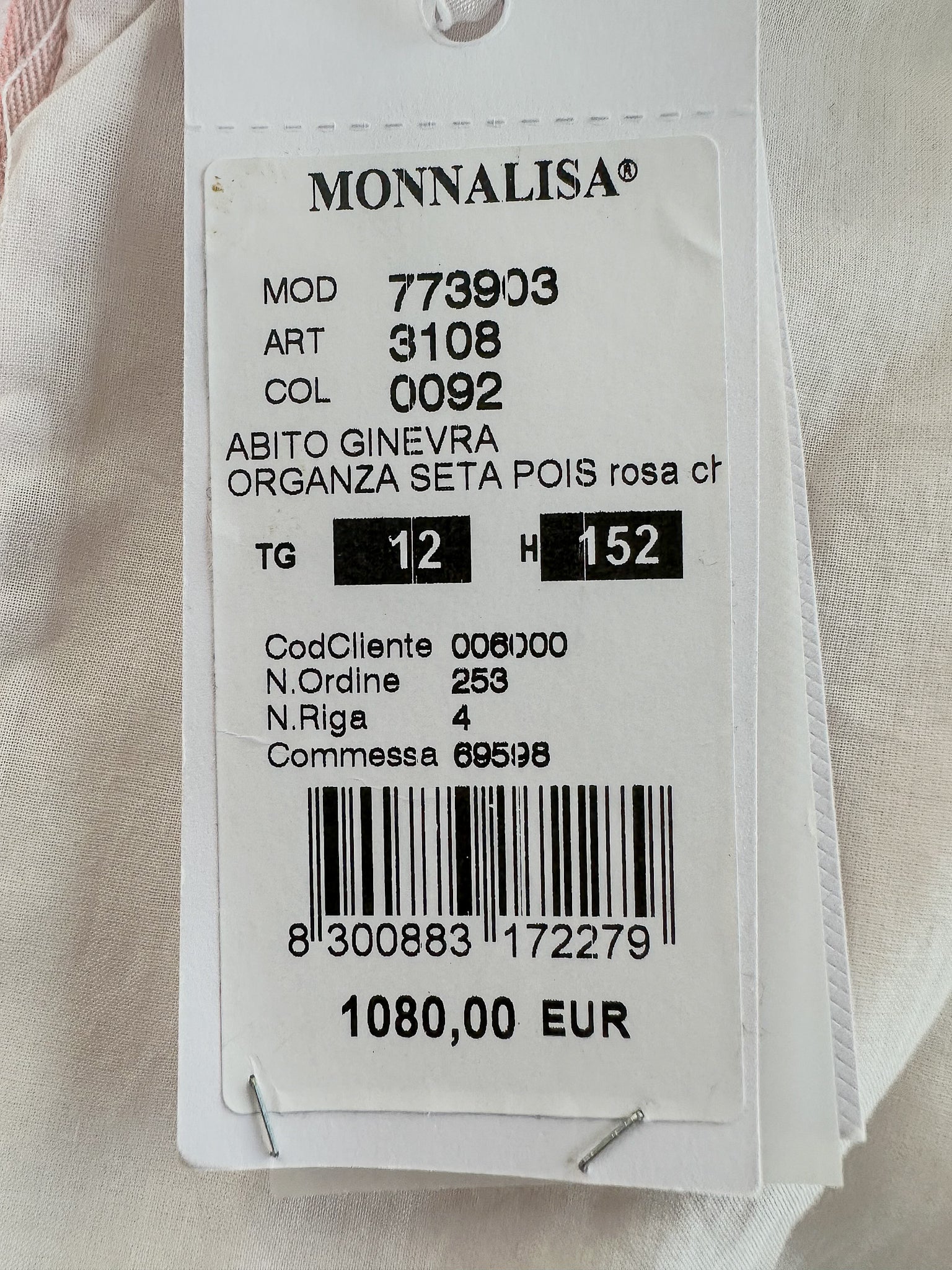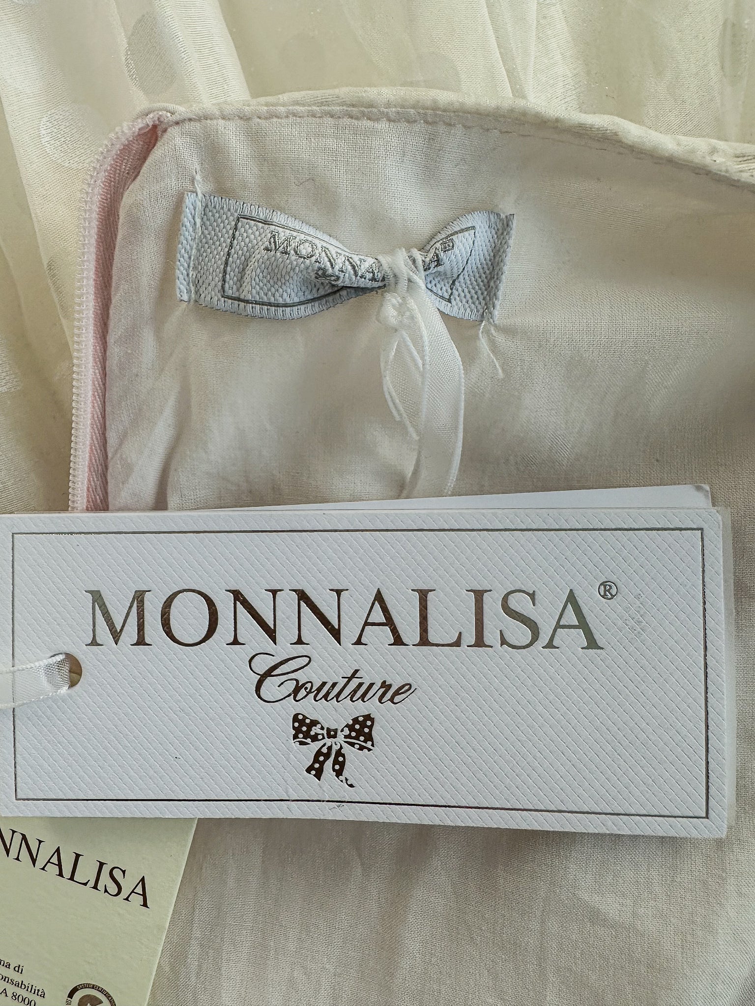 Discover timeless elegance with this Monnalisa Kids polka dot organza dress in soft rosy pink and white. The voluminous tulle skirt creates a graceful, twirling silhouette perfect for special occasions. Brand new with minor storage marks easily remedied by dry cleaning—we've priced it accessibly to accommodate this. Complete the look with your own statement belt for added charm and personality.