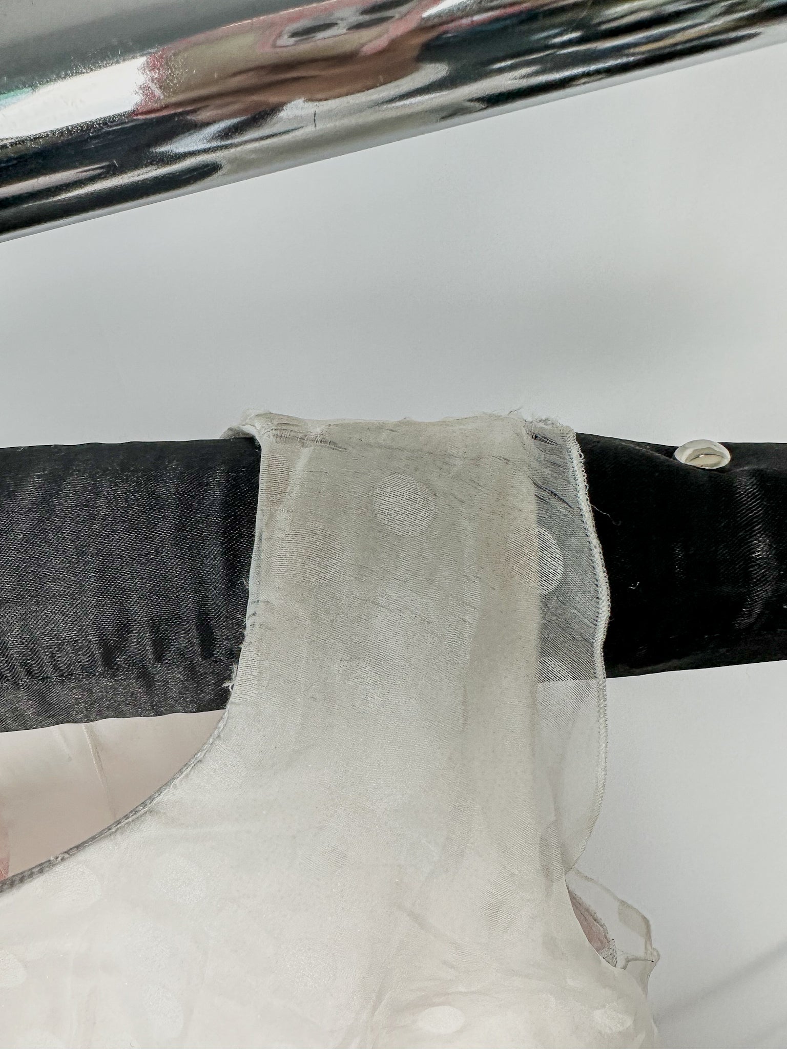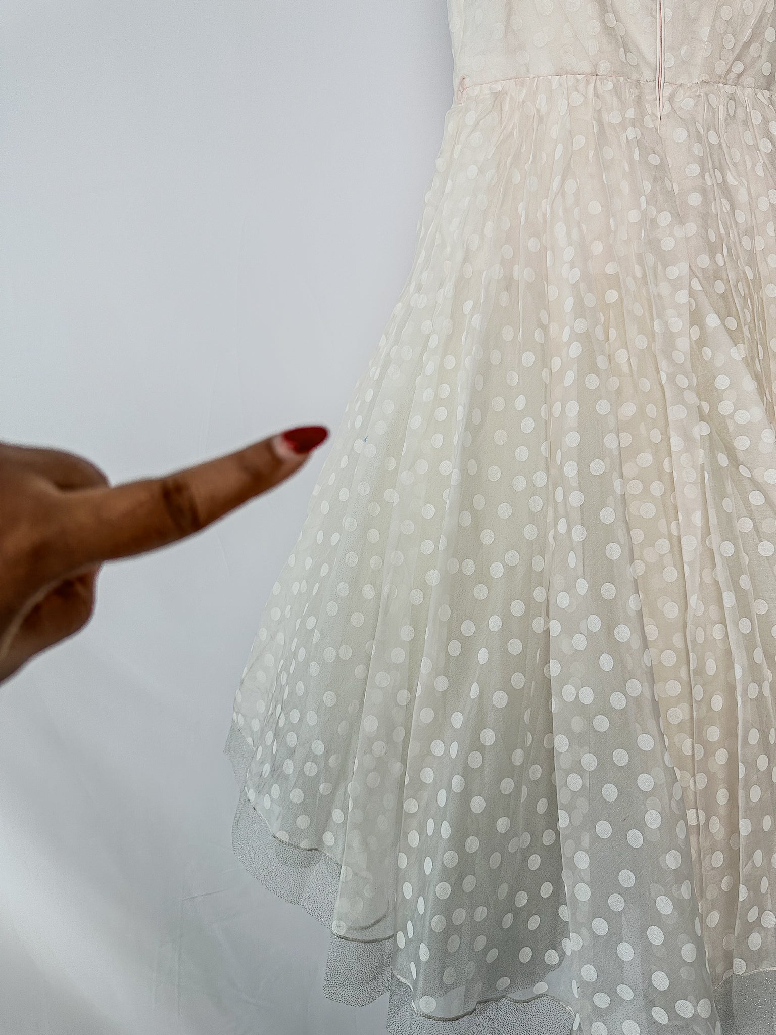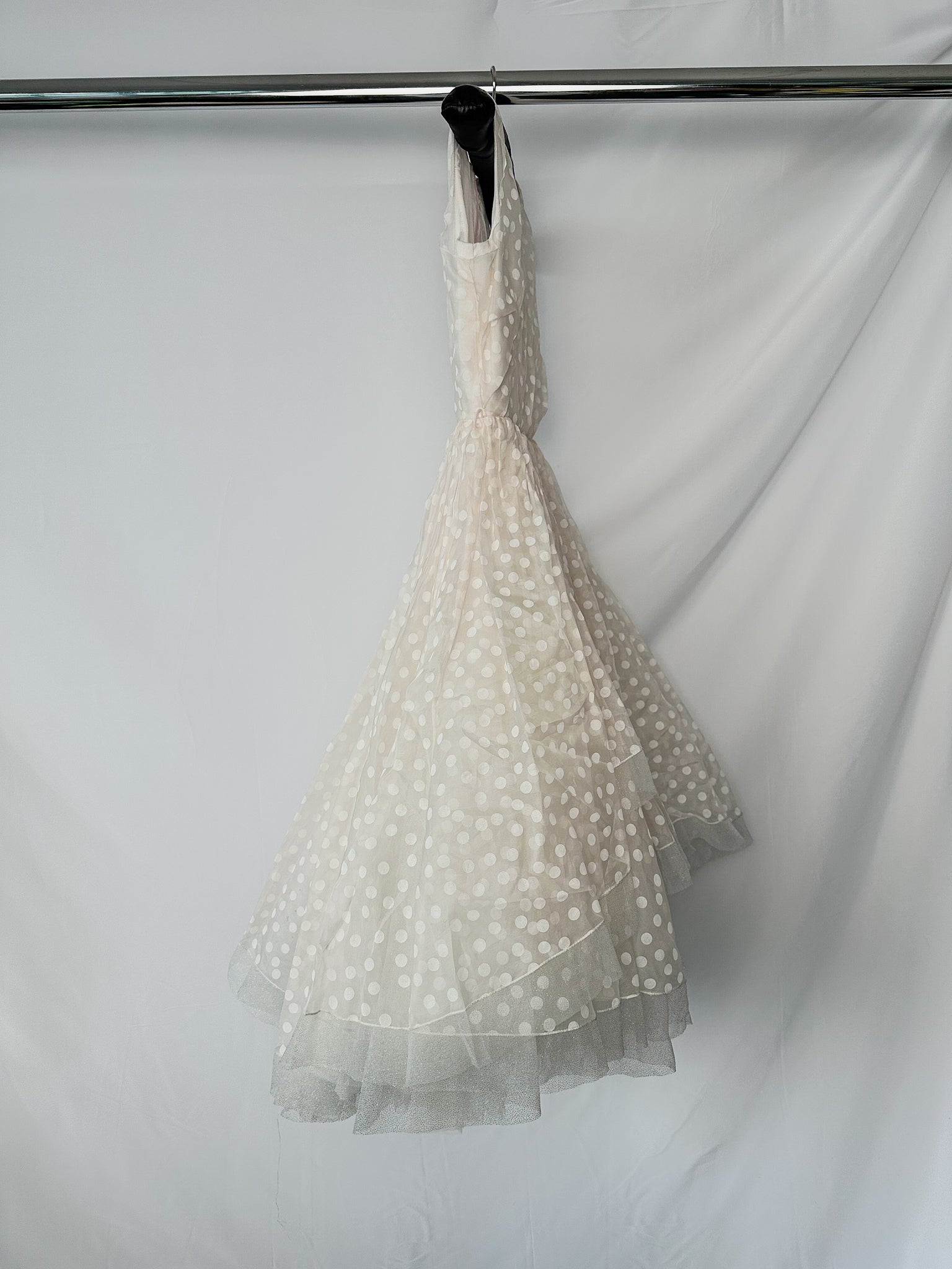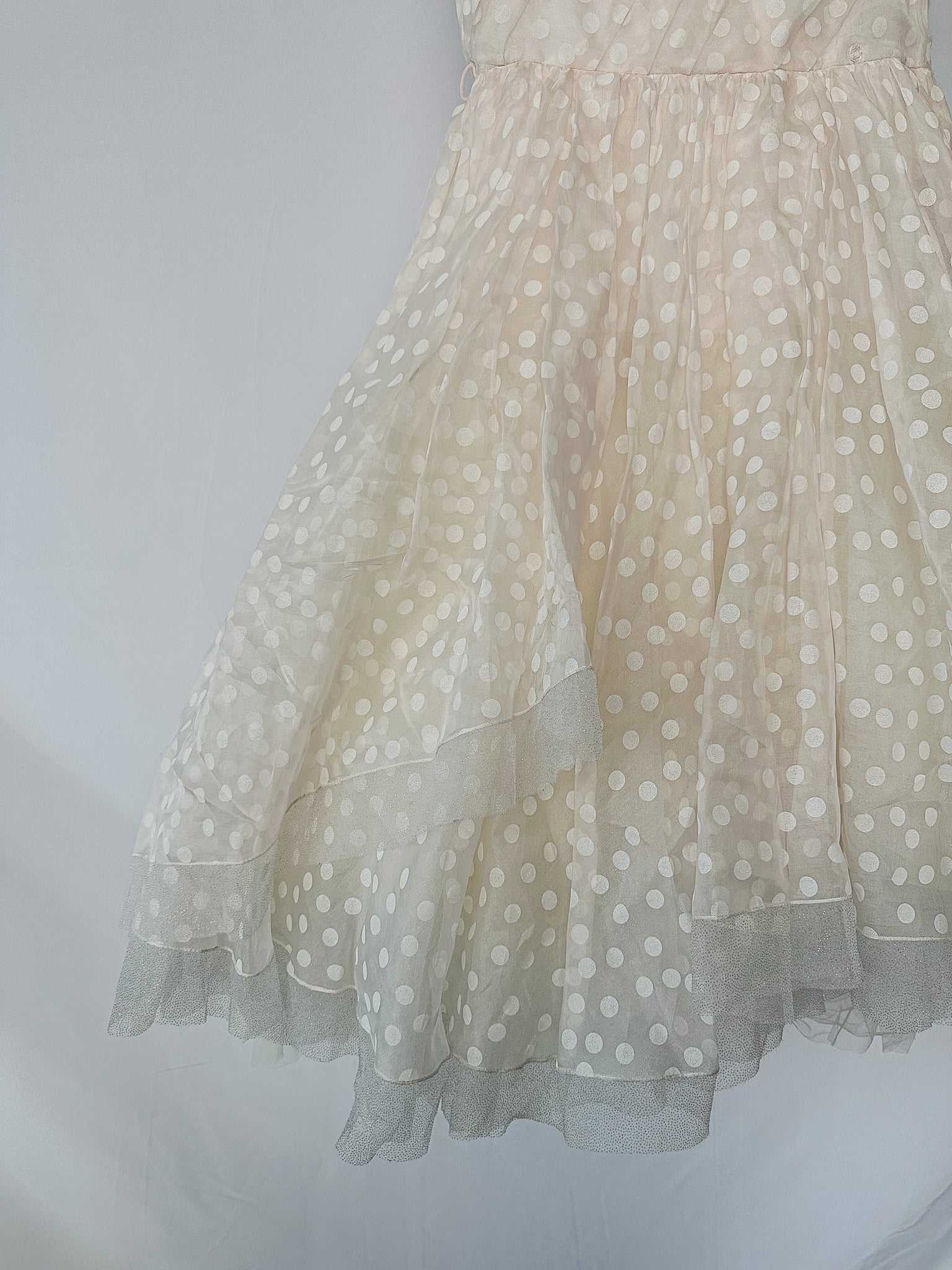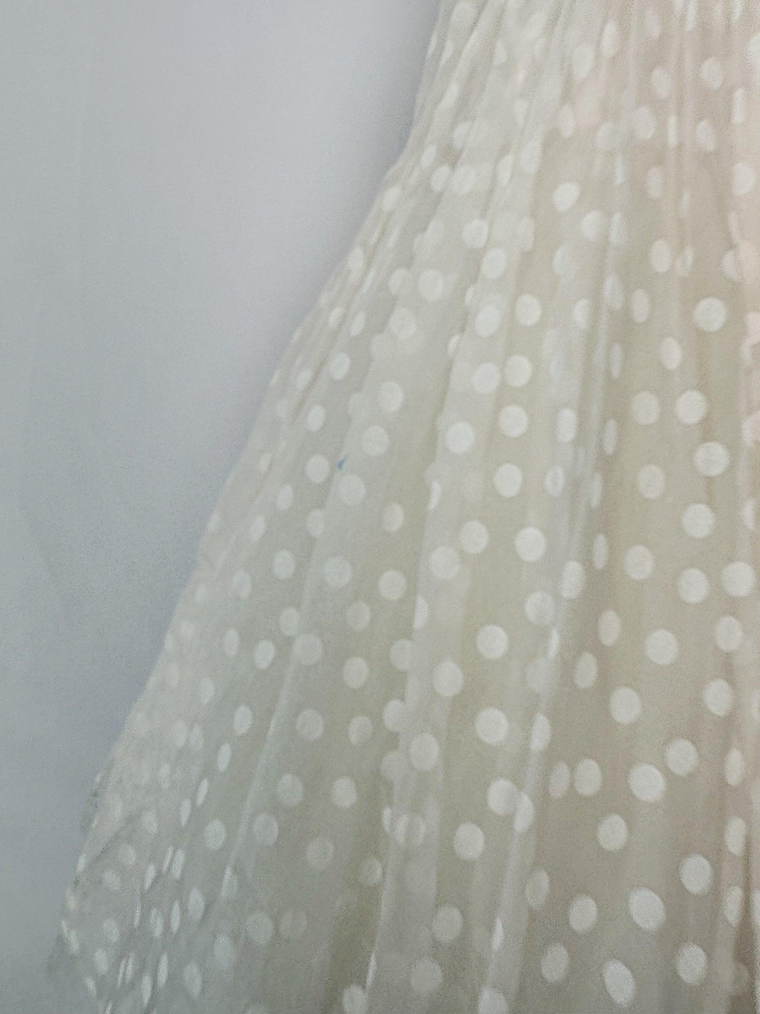 Discover timeless elegance with this Monnalisa Kids polka dot organza dress in soft rosy pink and white. The voluminous tulle skirt creates a graceful, twirling silhouette perfect for special occasions. Brand new with minor storage marks easily remedied by dry cleaning—we've priced it accessibly to accommodate this. Complete the look with your own statement belt for added charm and personality.