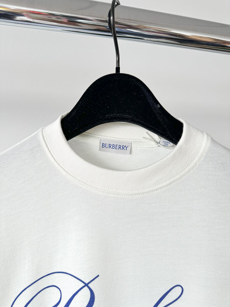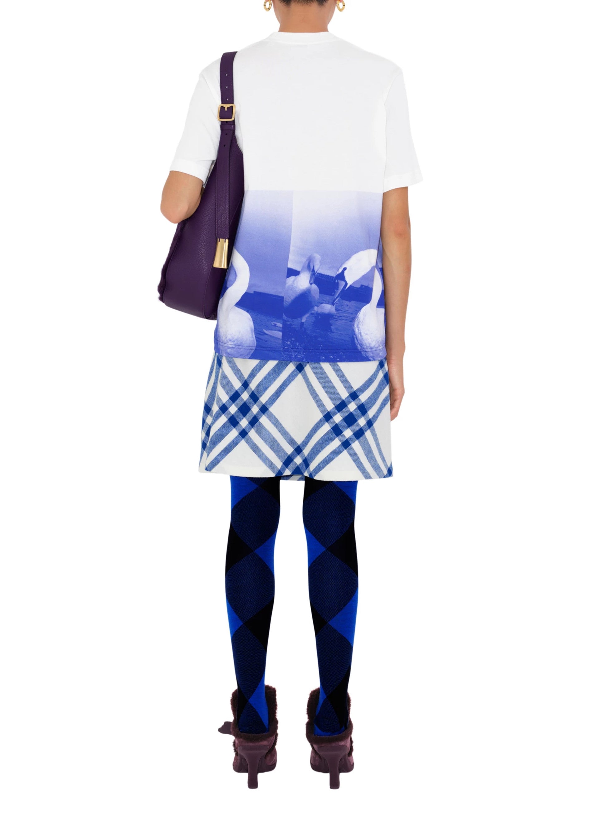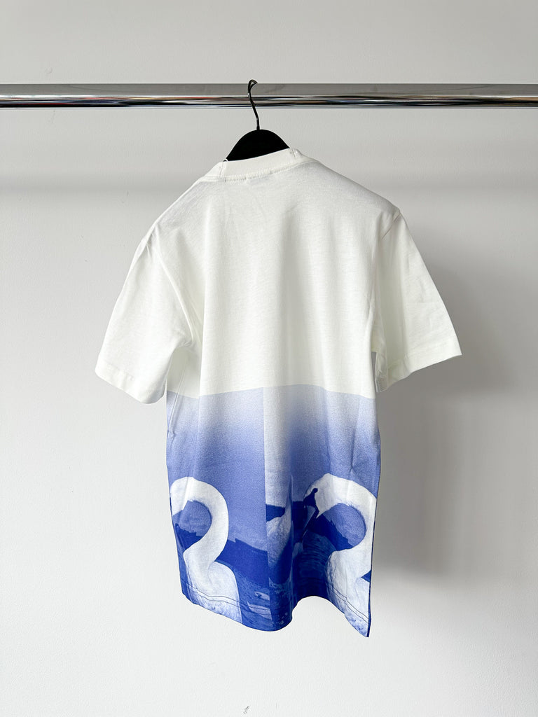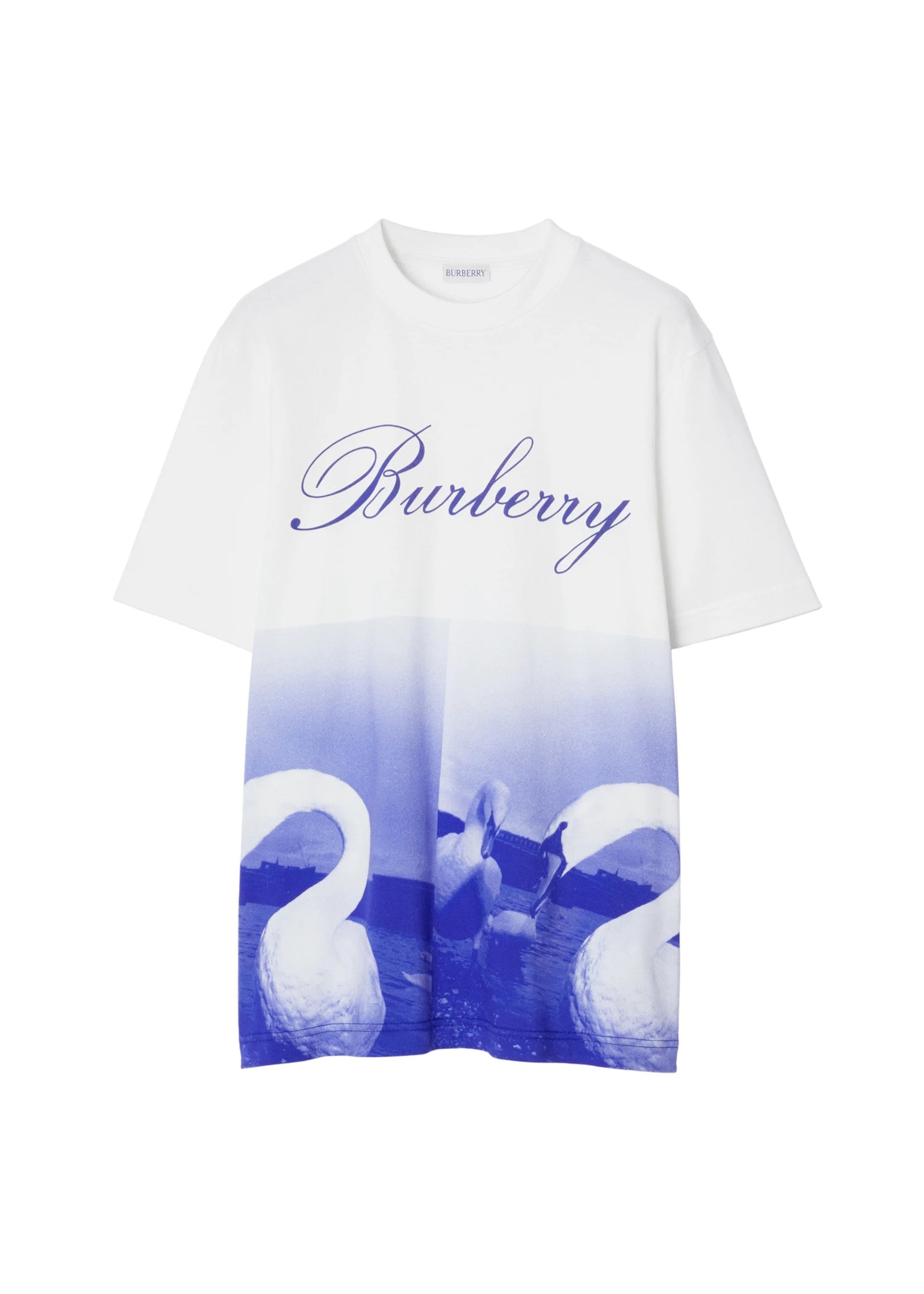 Get ready to make a splash with this Burberry Swan Spell Out White T Shirt. Made in Italy with soft cotton jersey, it features a playful swan and logo print. Designed with a relaxed fit and rib-knit neckline, this tee brings both comfort and style to any outfit. Dive in and make a statement today!
