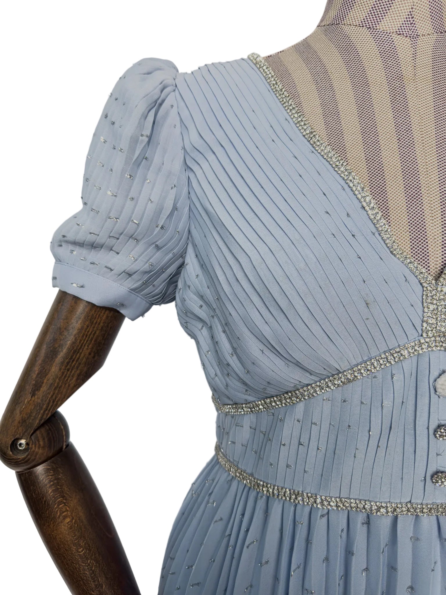 Self-Portrait Light Blue Crystal Embellished Metallic Fil Coupé Plissé-Chiffon Midi Dress