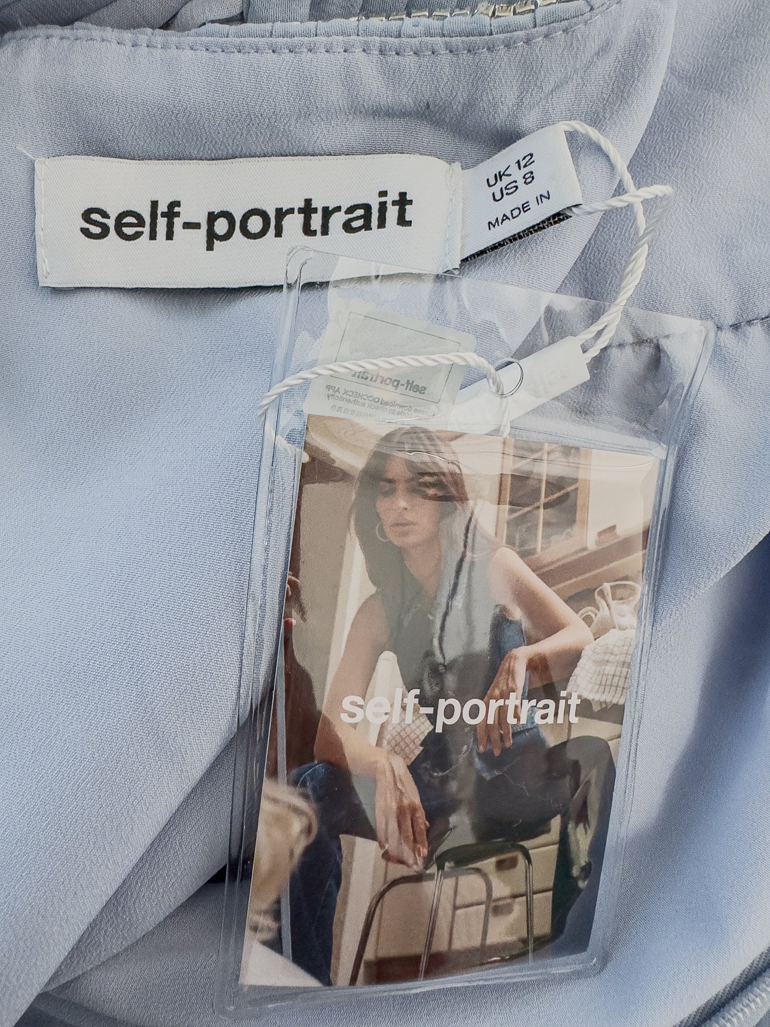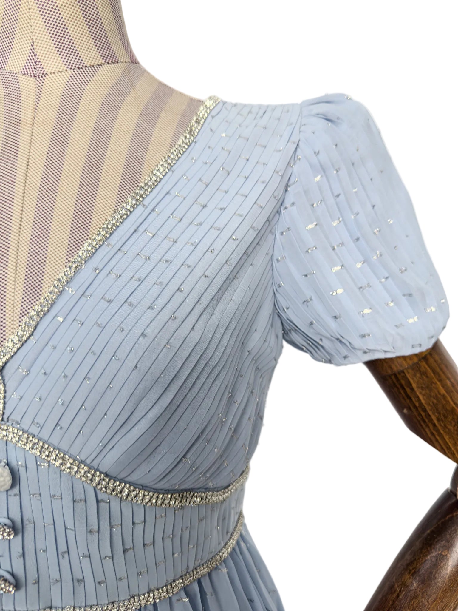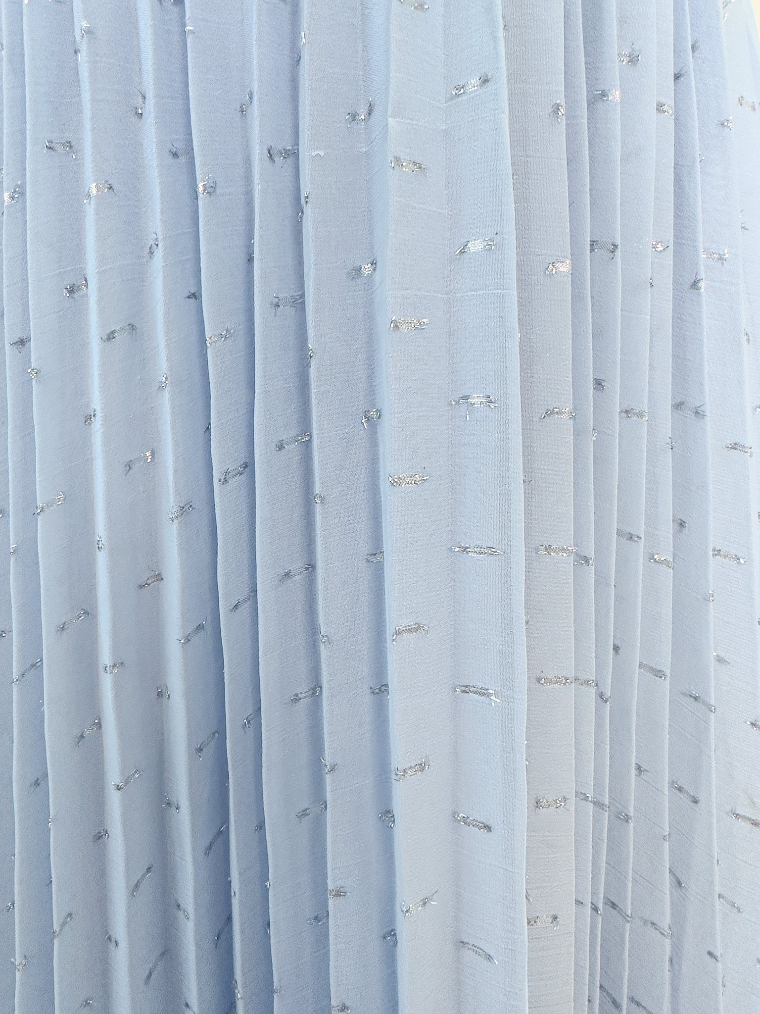 Self-Portrait's signature elegance shines through this sky-blue chiffon midi dress, adorned with delicate crystal embellishments that frame the bodice with refined detail. The plissé skirt features shimmering silver fil coupé threads that catch the light with every movement, creating an ethereal, sophisticated silhouette. A timeless piece that balances feminine grace with modern glamour.