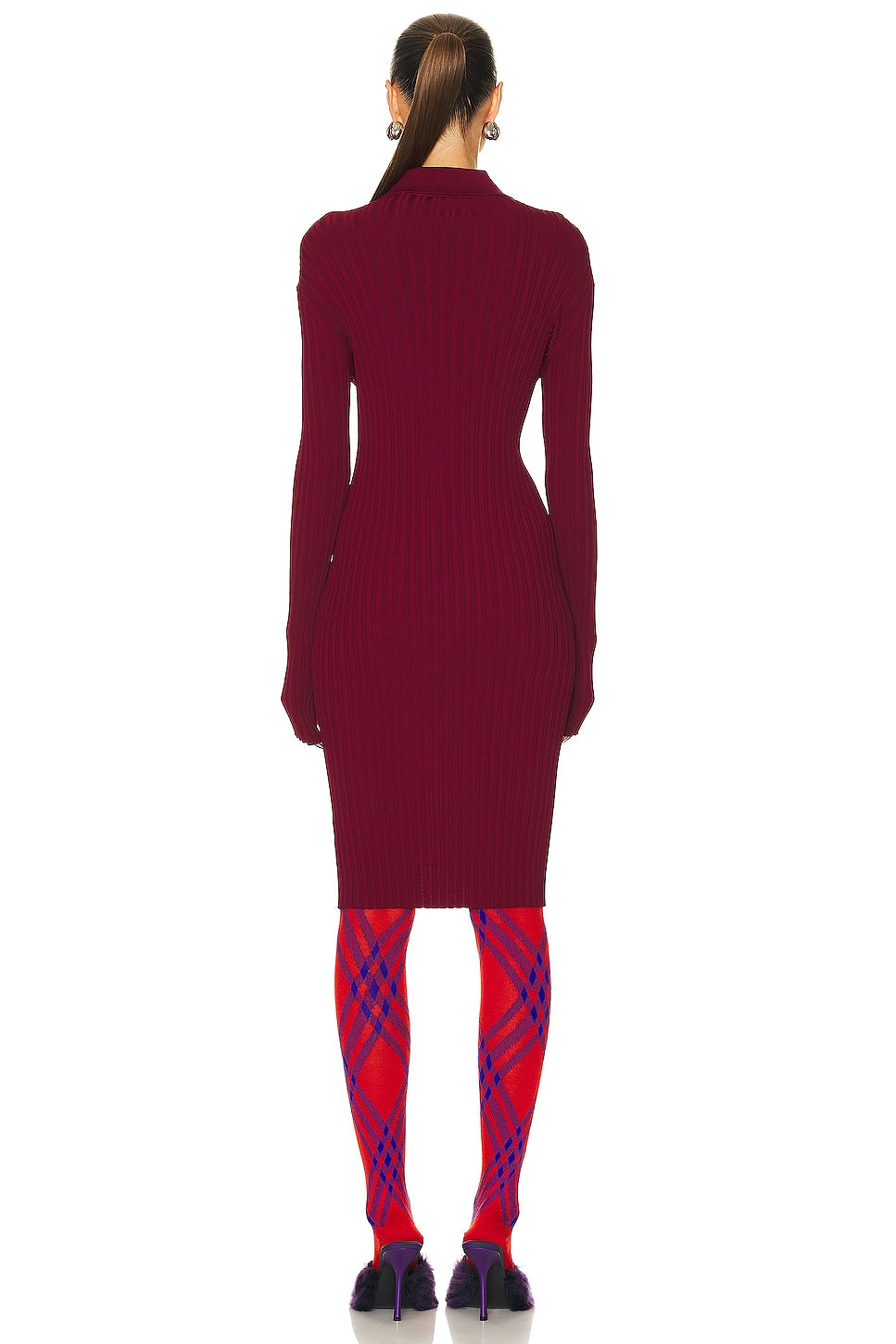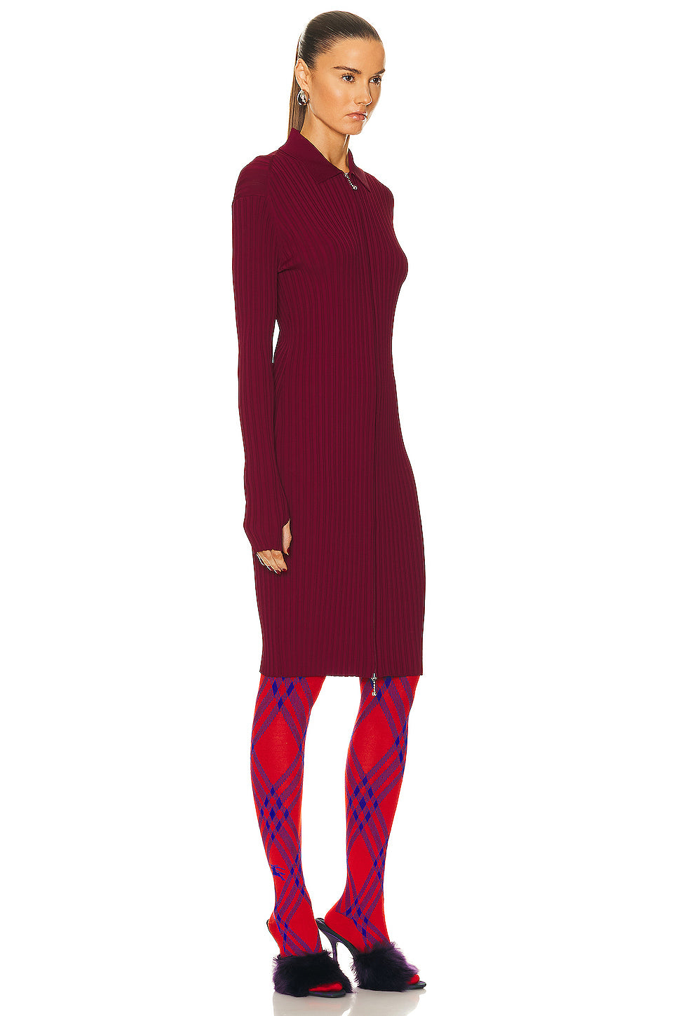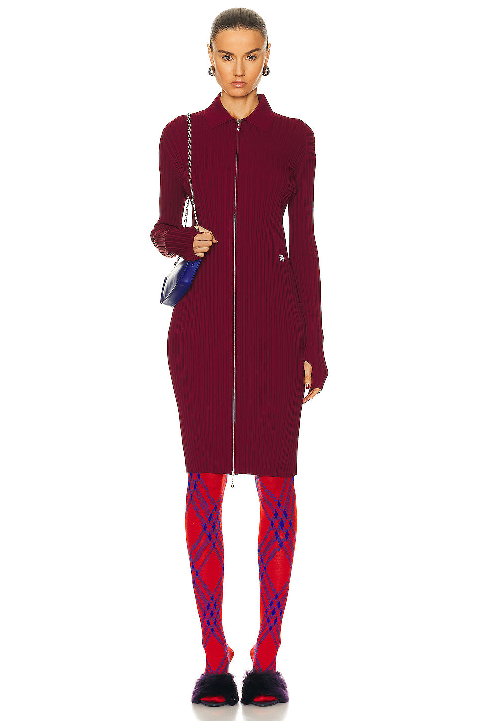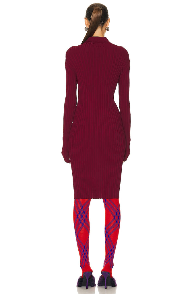 Stilvoll und gemütlich im dunkelroten, gerippten Langarmkleid von Burberry. Das Kleid besticht durch seinen bequemen Rippenstrick, einen einzigartigen Zweiwege-Frontreißverschluss und einen verspielten Kentkragen. Die langen Ärmel haben Daumenlöcher für zusätzlichen Komfort, und die EKD-Stickerei an der Hüfte verleiht dem Kleid einen verspielten Touch. Perfekt für jeden Anlass, sitzt dieses Kleid perfekt an den richtigen Stellen und endet etwa am Knie für eine schmeichelhafte, figurbetonte Silhouette.