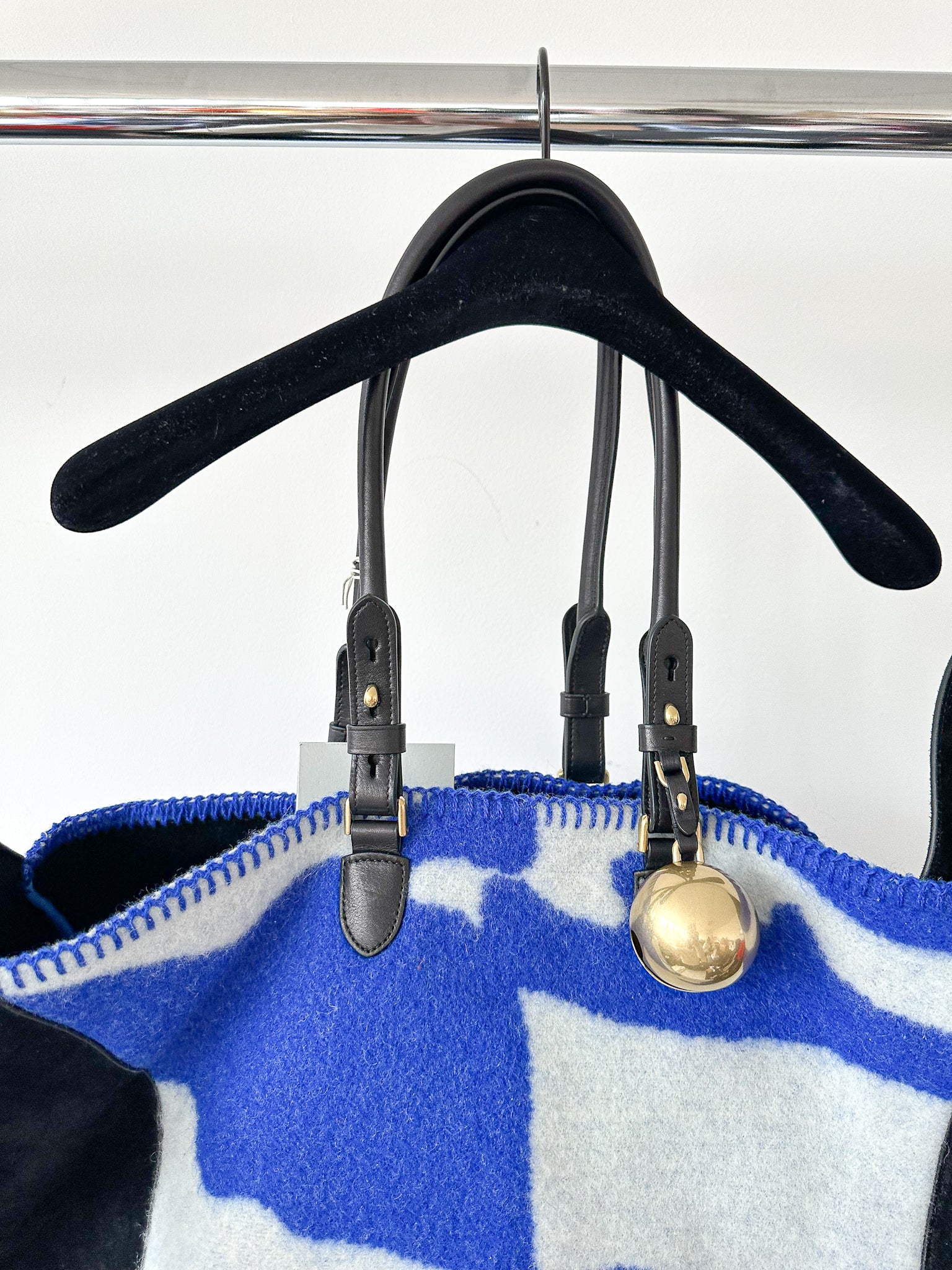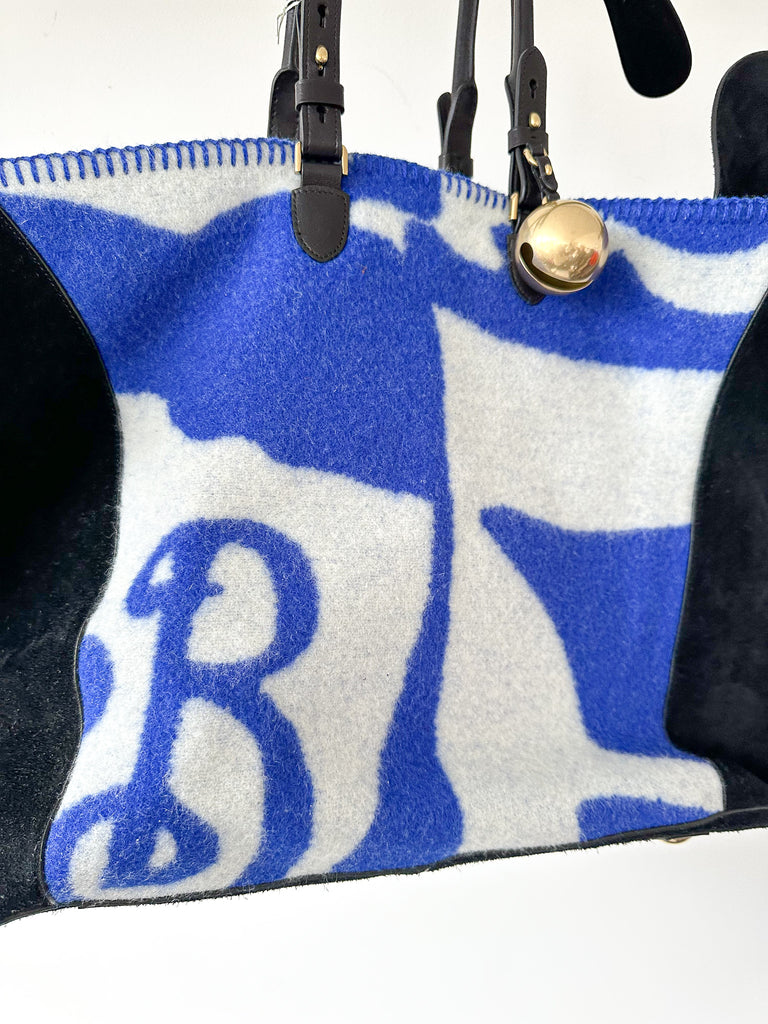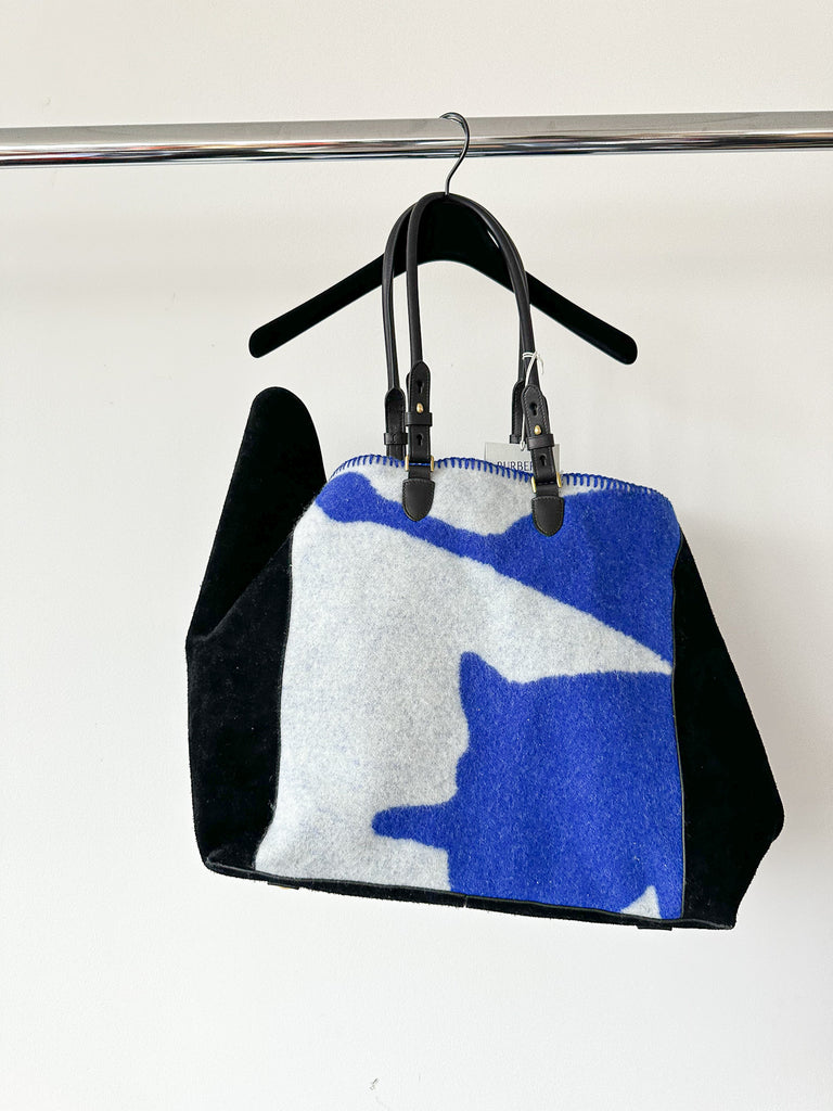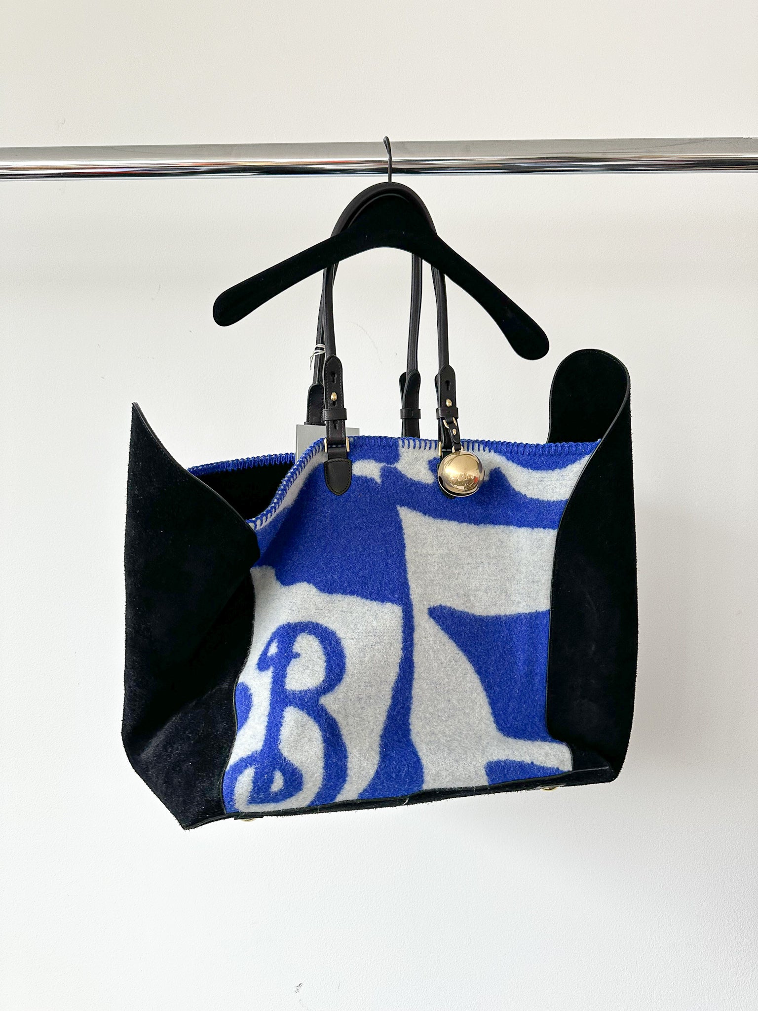 Starten Sie mit dem perfekten Accessoire in Ihr verlängertes Wochenende – der Burberry Extra Large Shield Tote Blue. Hergestellt in Italien aus Kalbswildleder und Wollgewebe im Schildmuster, verfügt diese Tasche über verstellbare Ledergriffe, eine abnehmbare Ledertasche mit Reißverschluss und einen abnehmbaren Glöckchenanhänger. Lassen Sie sich von ihrer Größe nicht abschrecken – sie ist die perfekte Tasche, um alles stilvoll zu transportieren.