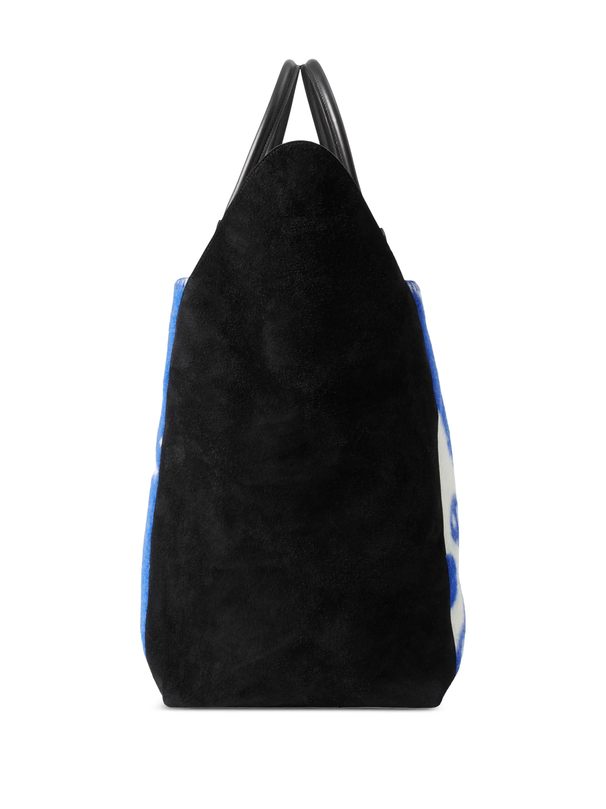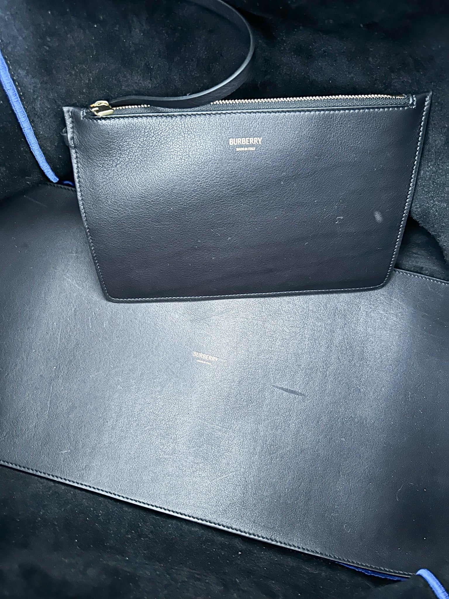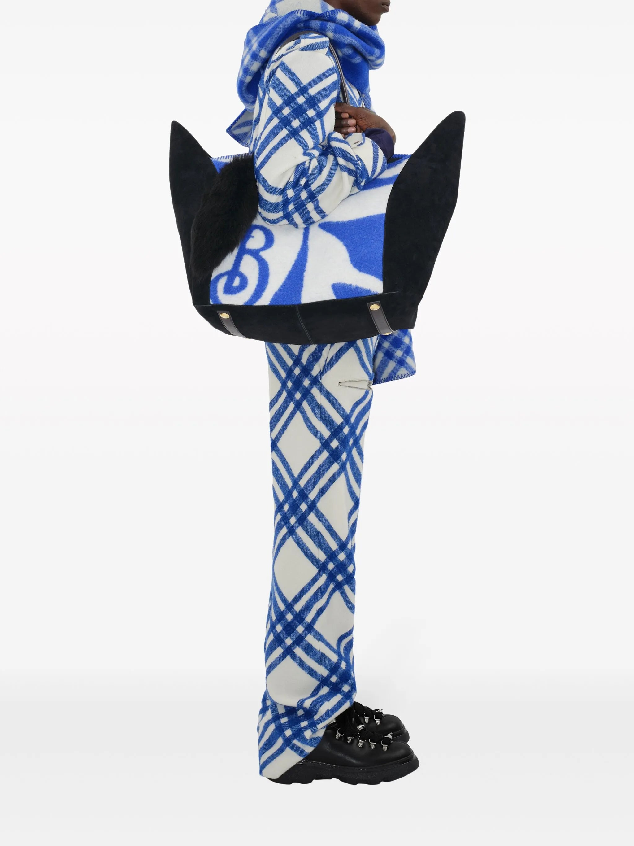 Starten Sie mit dem perfekten Accessoire in Ihr verlängertes Wochenende – der Burberry Extra Large Shield Tote Blue. Hergestellt in Italien aus Kalbswildleder und Wollgewebe im Schildmuster, verfügt diese Tasche über verstellbare Ledergriffe, eine abnehmbare Ledertasche mit Reißverschluss und einen abnehmbaren Glöckchenanhänger. Lassen Sie sich von ihrer Größe nicht abschrecken – sie ist die perfekte Tasche, um alles stilvoll zu transportieren.