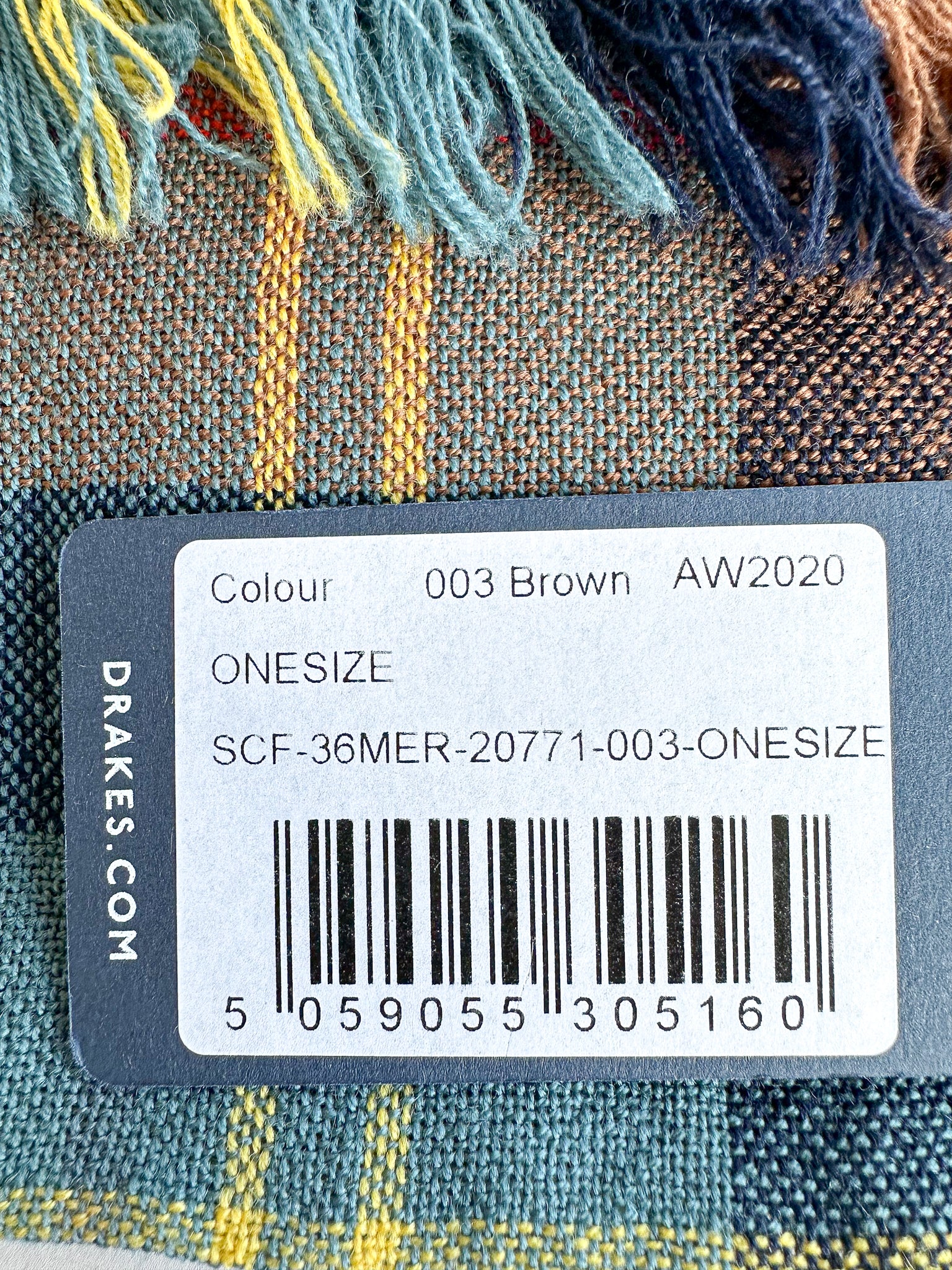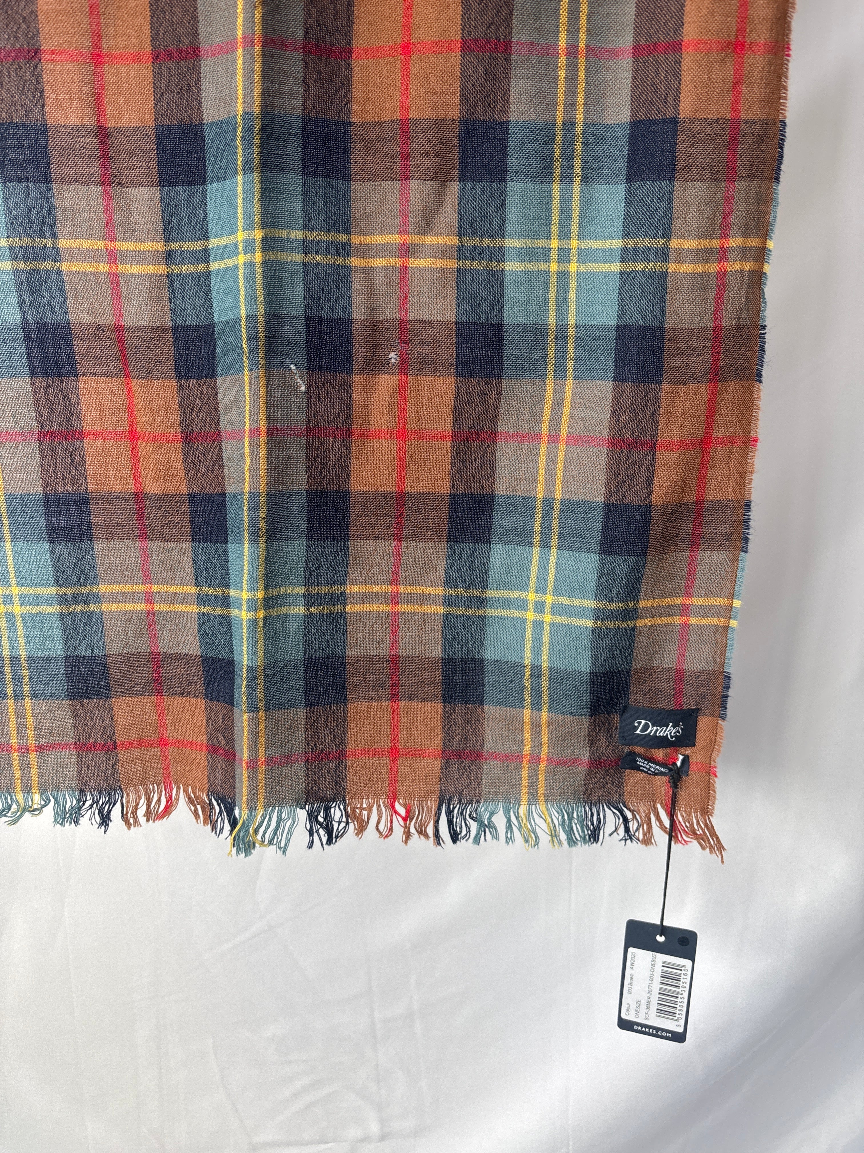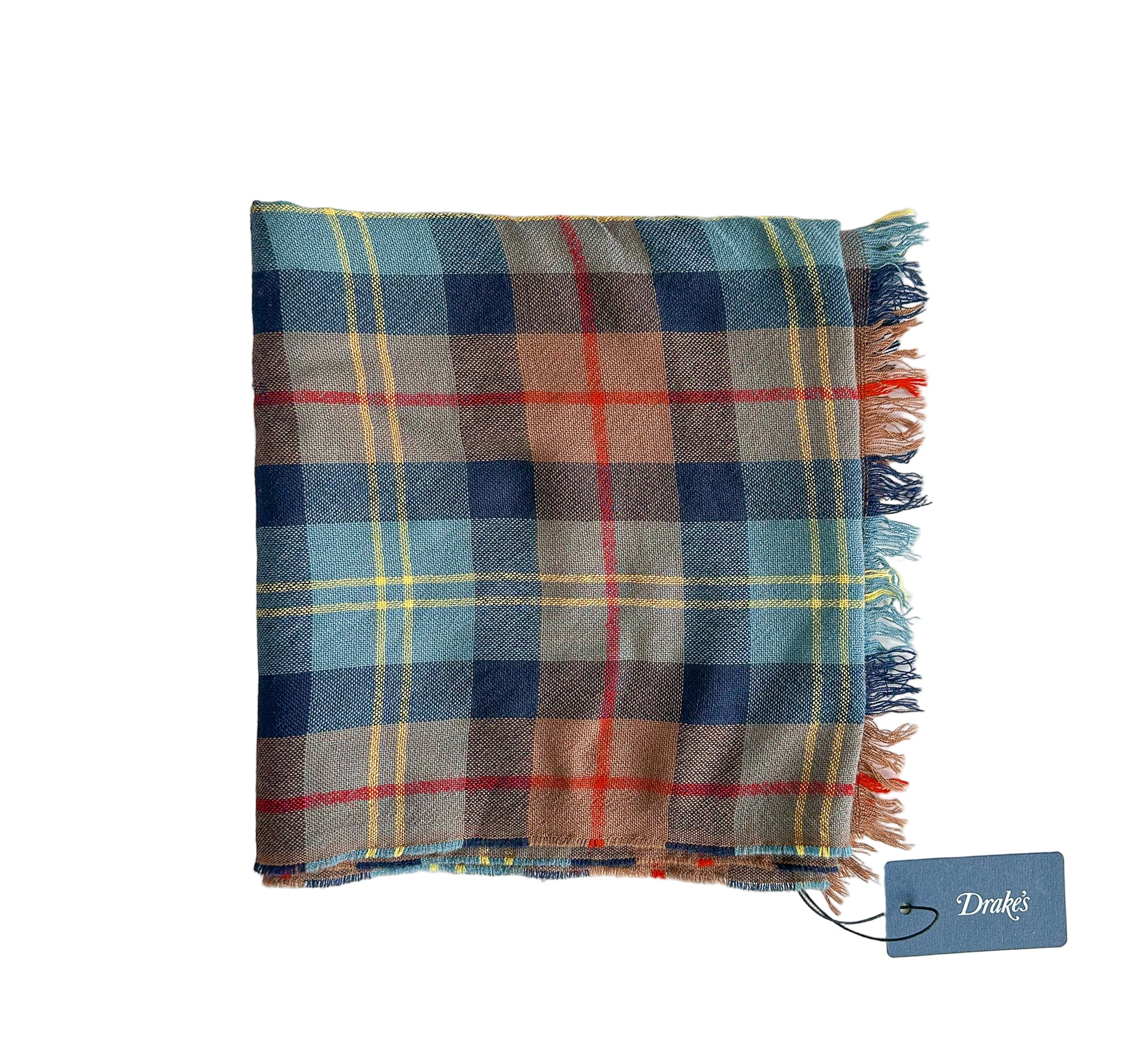 Écharpe en laine mérinos à carreaux marron et bleu de Drake ENDOMMAGÉE