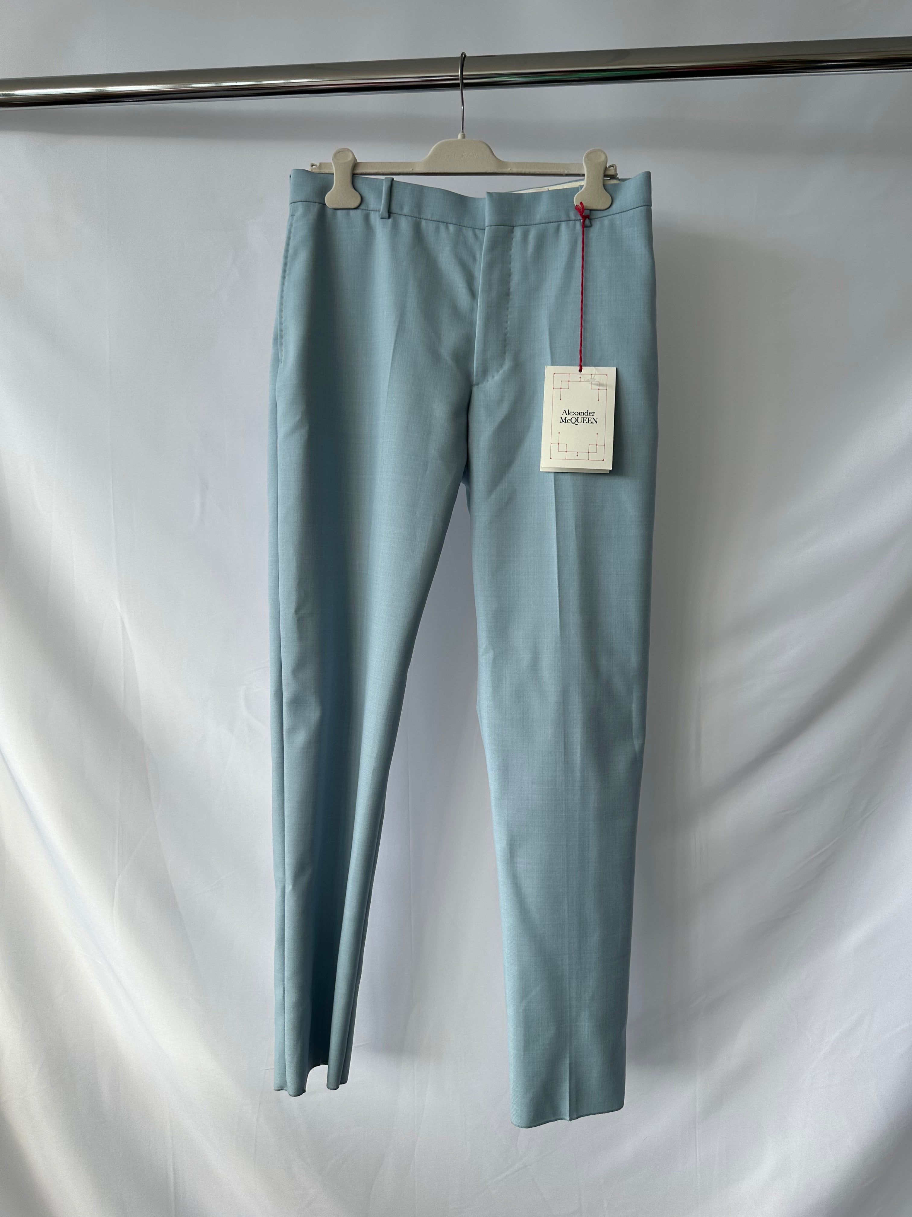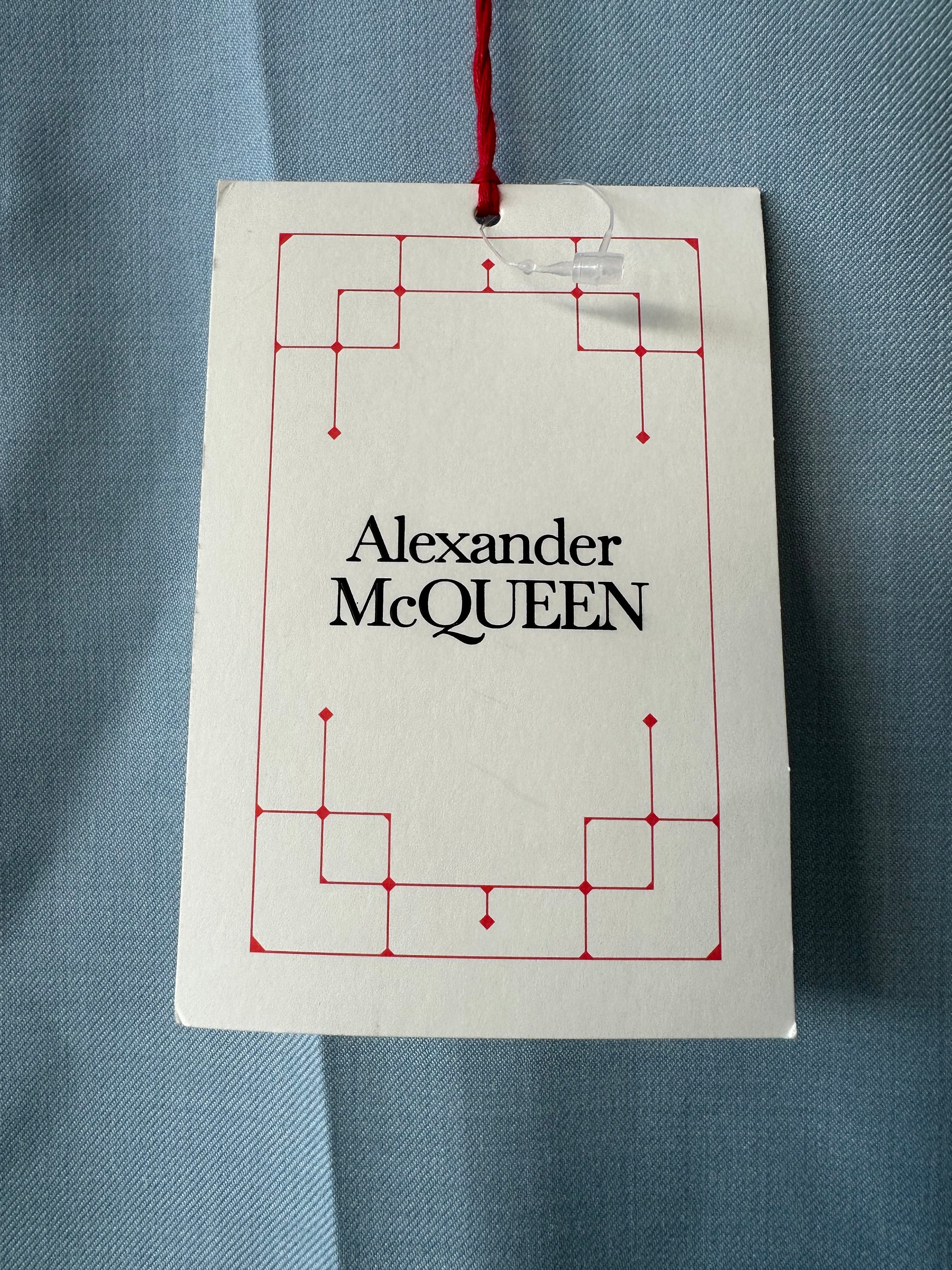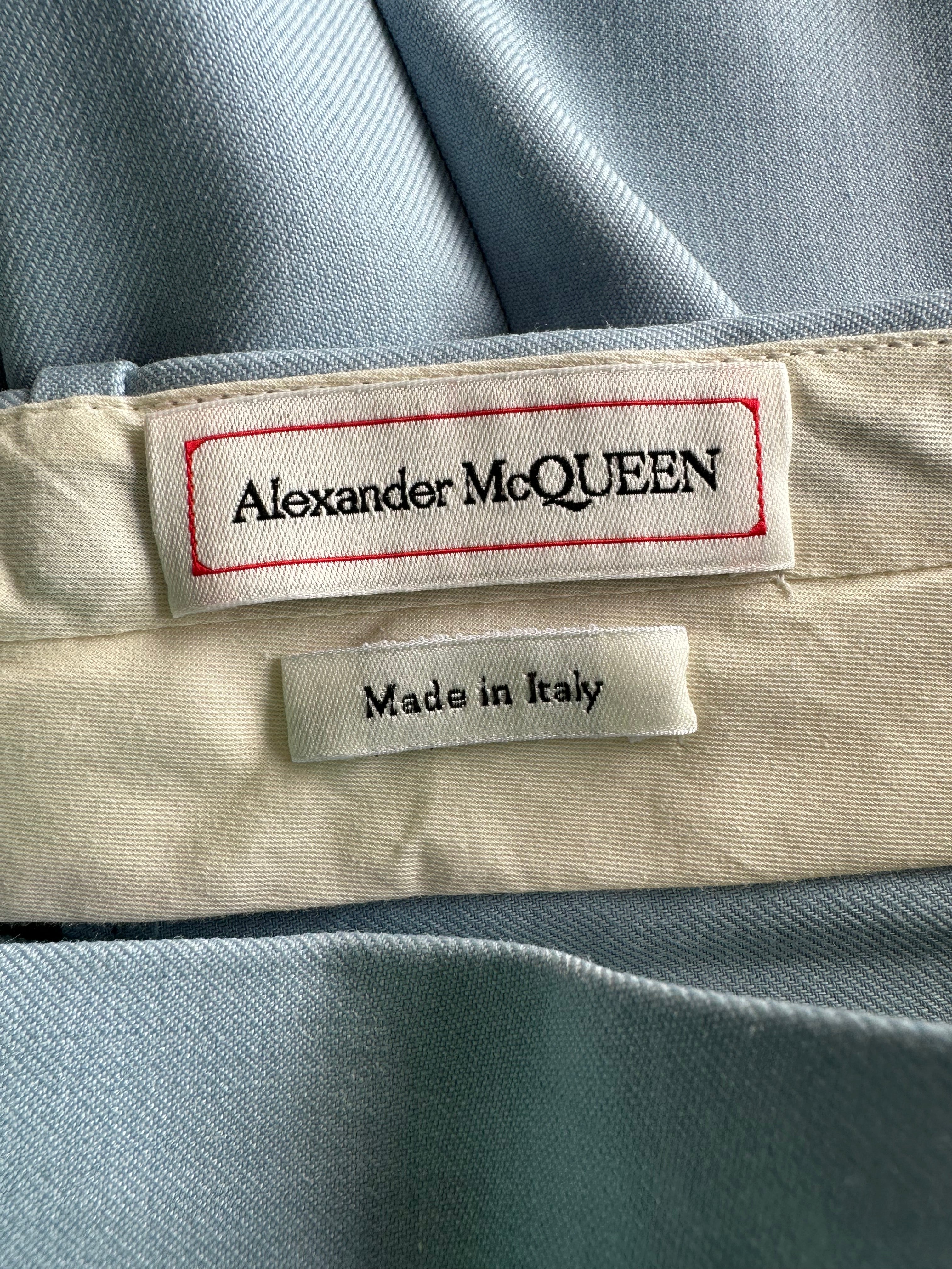 Sublimez votre garde-robe avec ce pantalon cigarette Alexander McQueen d'un bleu pâle raffiné. Confectionné dans un mélange équilibré de 50 % polyester et 50 % laine, il allie durabilité, douceur et confort. Sa coupe ajustée et sa couleur subtile en font un modèle idéal pour les occasions formelles comme pour un look élégant au quotidien, ajoutant une touche d'élégance discrète à votre collection.