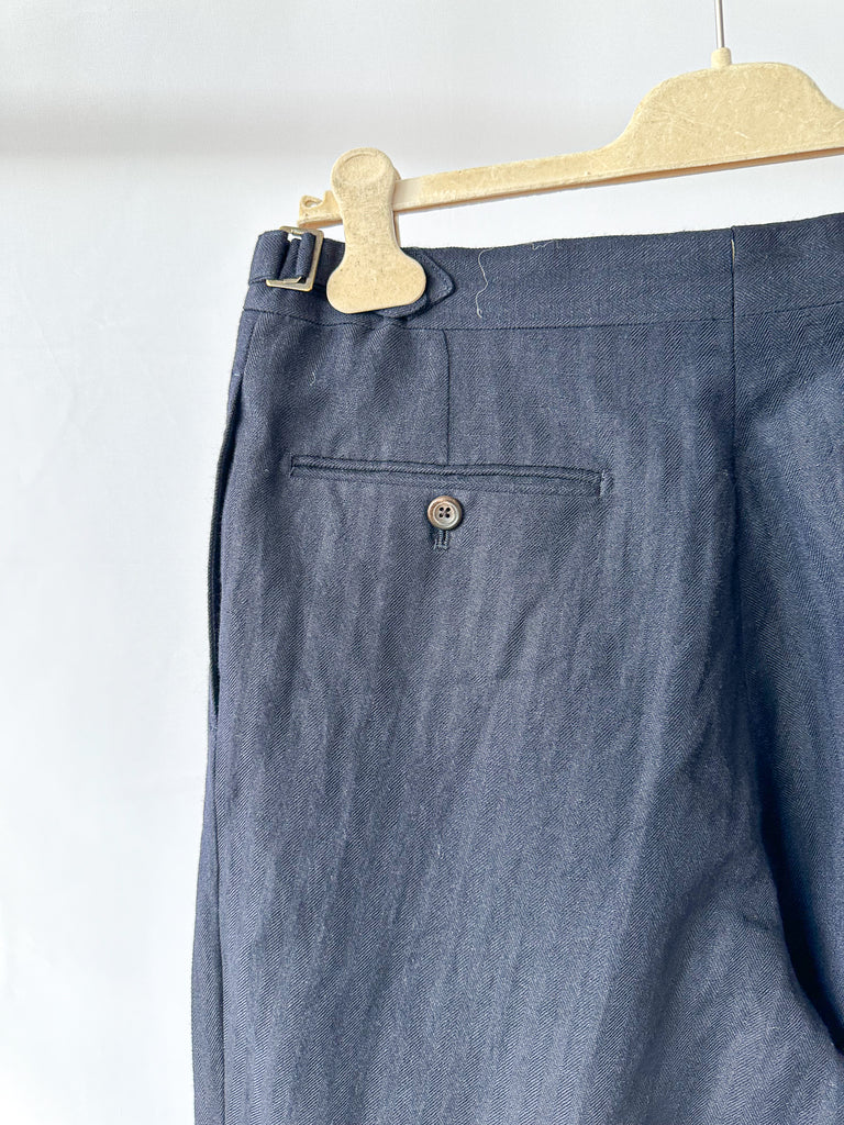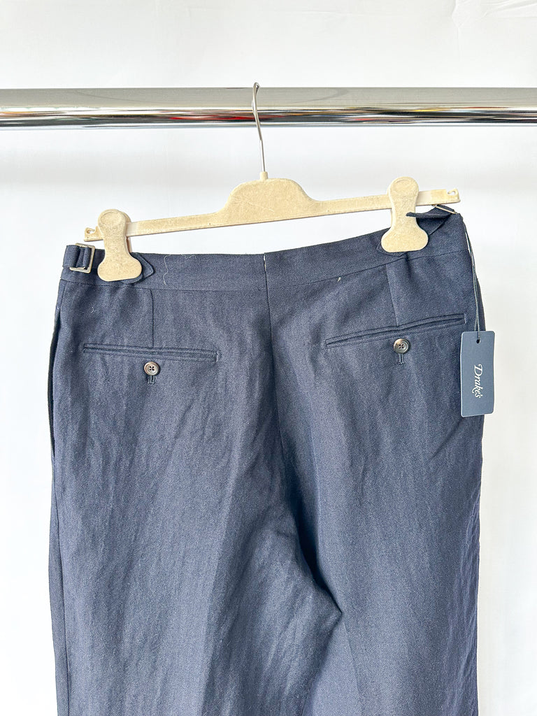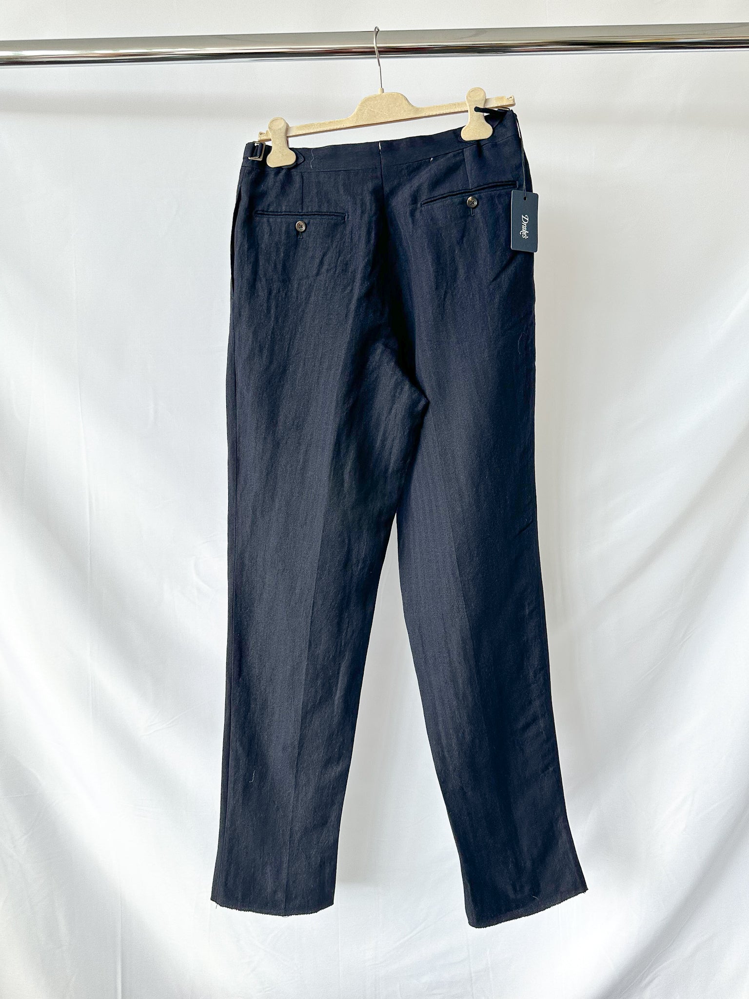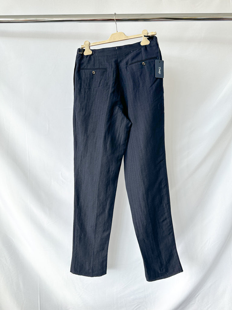 Affirmez votre style avec le pantalon Drake en mélange de laine et de lin bleu marine à chevrons. Confectionné dans un mélange unique de laine et de lin, ce pantalon offre une texture remarquable et un confort respirant. Son motif à chevrons bleu marine apporte une touche d'audace aux costumes classiques, idéal pour celles qui souhaitent afficher une allure affirmée tout en restant élégantes et décontractées.