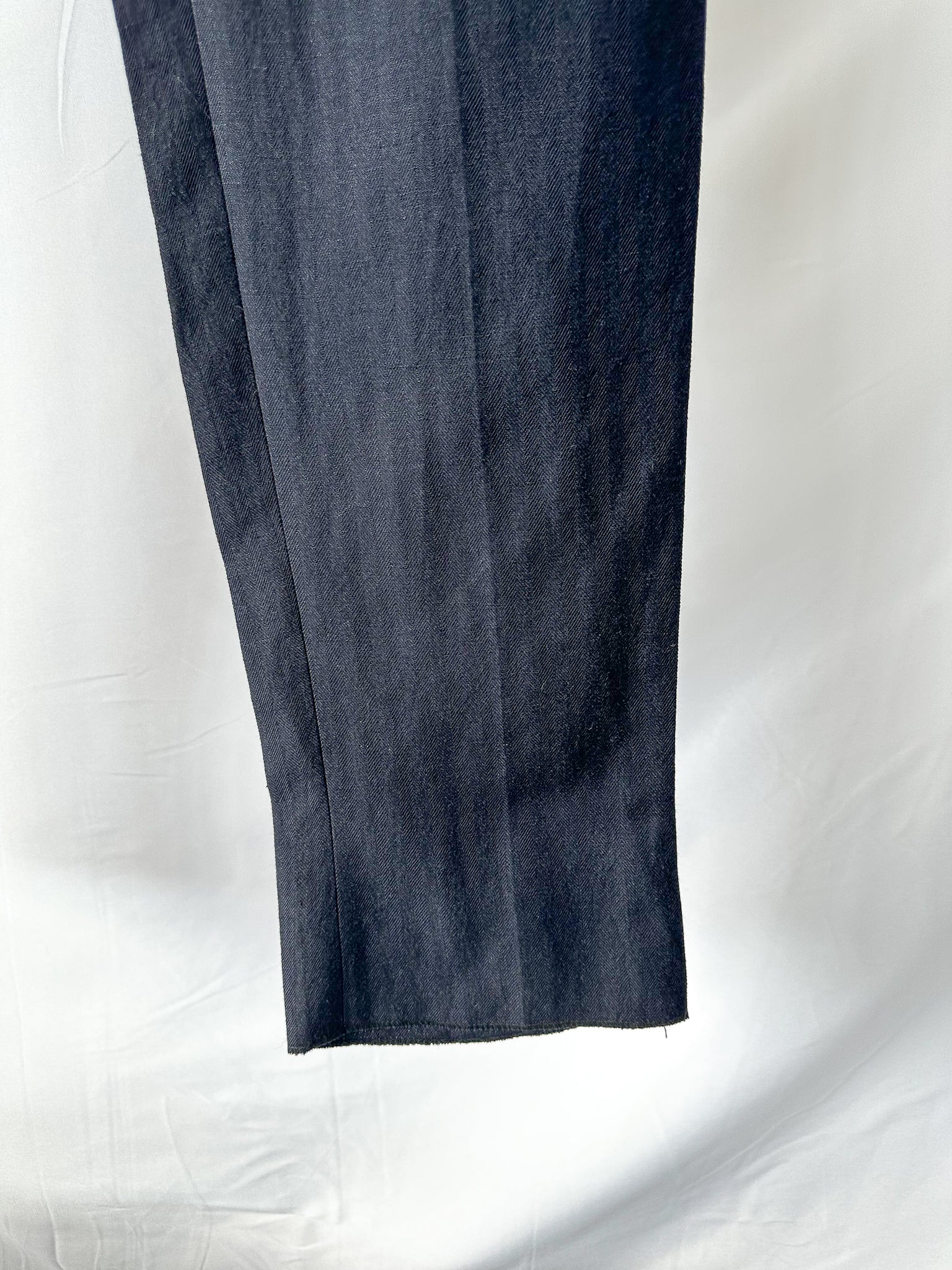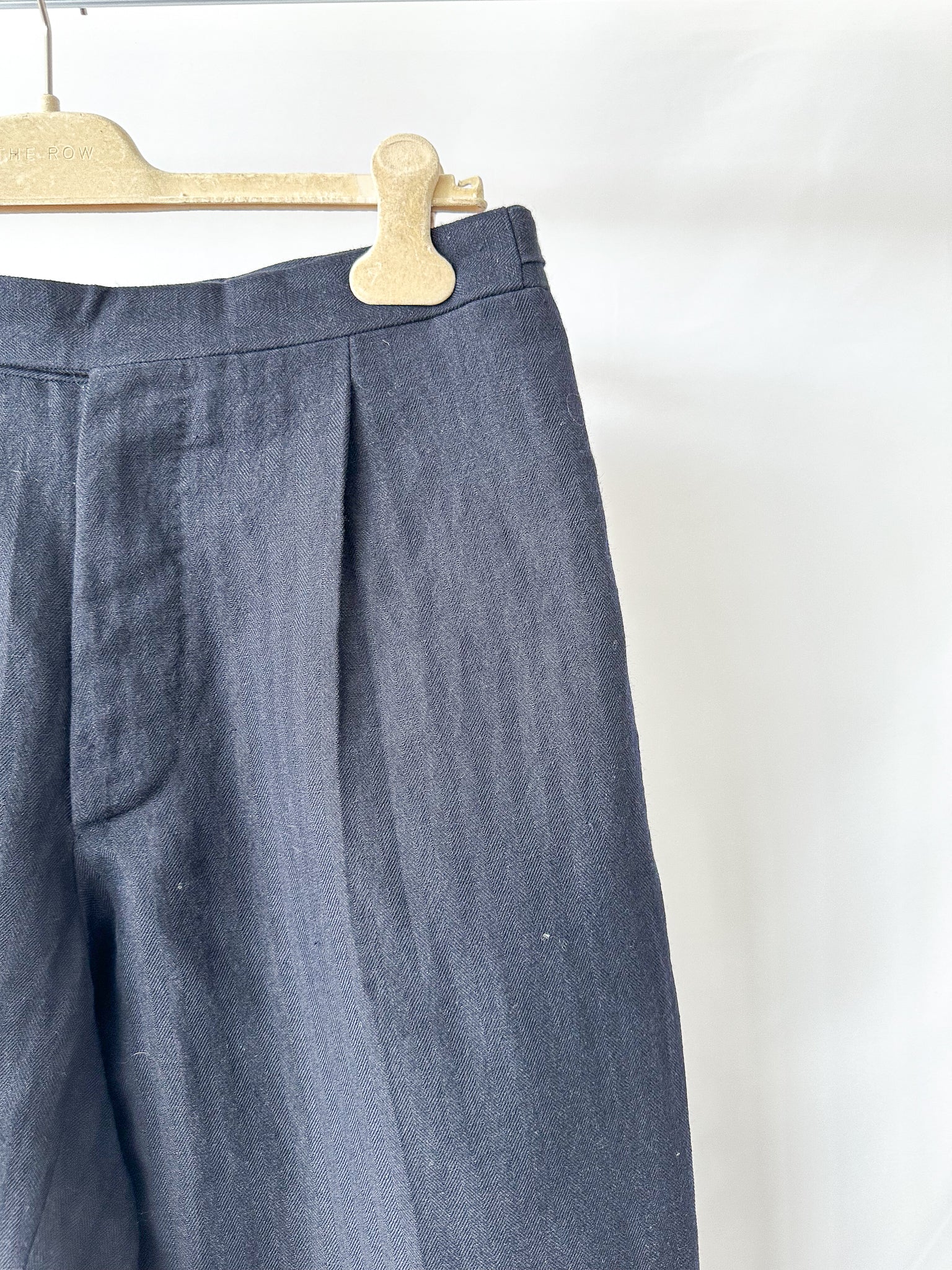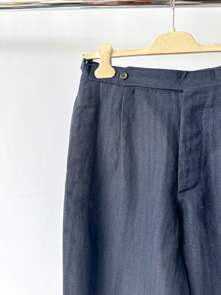 Affirmez votre style avec le pantalon Drake en mélange de laine et de lin bleu marine à chevrons. Confectionné dans un mélange unique de laine et de lin, ce pantalon offre une texture remarquable et un confort respirant. Son motif à chevrons bleu marine apporte une touche d'audace aux costumes classiques, idéal pour celles qui souhaitent afficher une allure affirmée tout en restant élégantes et décontractées.