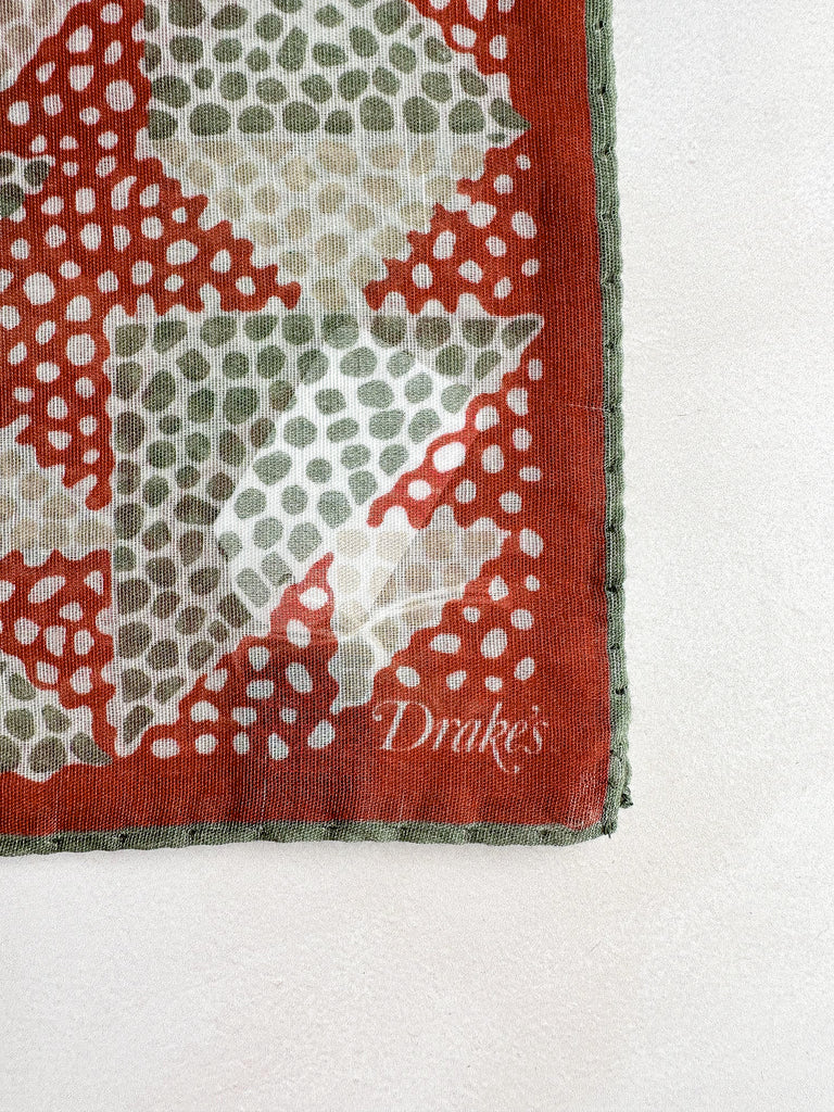 Sublimez votre style avec la pochette géométrique rouge, crème et vert de Drake, ornée d'un motif à pois audacieux dessiné à la main dans des tons éclatants de rouge, vert olive et crème. Confectionnée dans un mélange de coton et de modal de qualité supérieure, elle offre un toucher doux et une grande durabilité. Cet accessoire audacieux apporte une touche artistique et dynamique à toutes vos tenues, idéal pour celles qui souhaitent se démarquer avec assurance.