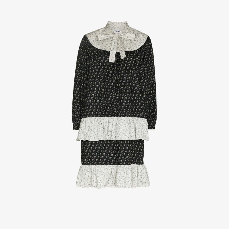 Tourbillonnez avec style grâce à cette ravissante mini-robe à volants et fleurs Batsheva Fifi ! Le contraste ludique des imprimés se dessine sur un coton doux, tandis que la coupe légèrement ample assure un confort optimal tout au long de la journée. Un charmant col noué orné d'un bouton en fausse perle ajoute une touche de fantaisie, complétée par des manches longues à poignets boutonnés. La double épaisseur de volants à l'ourlet crée un mouvement séduisant à chaque pas. Parfaite pour faire sensation en toute occasion !