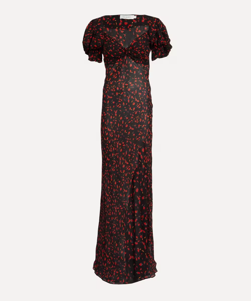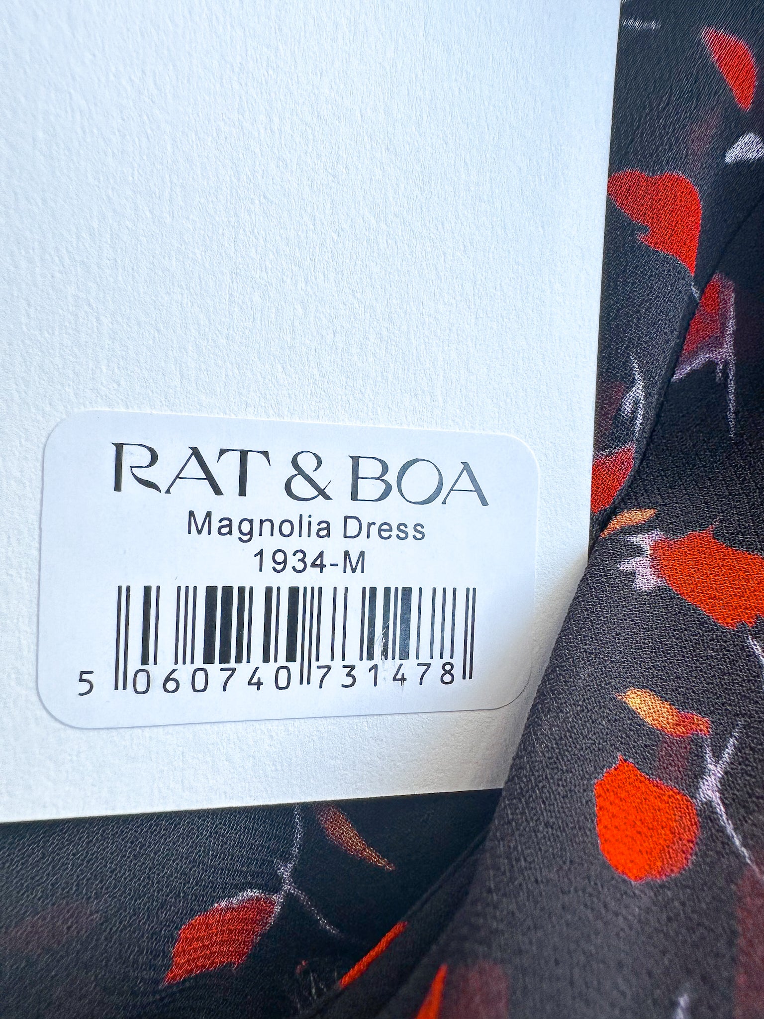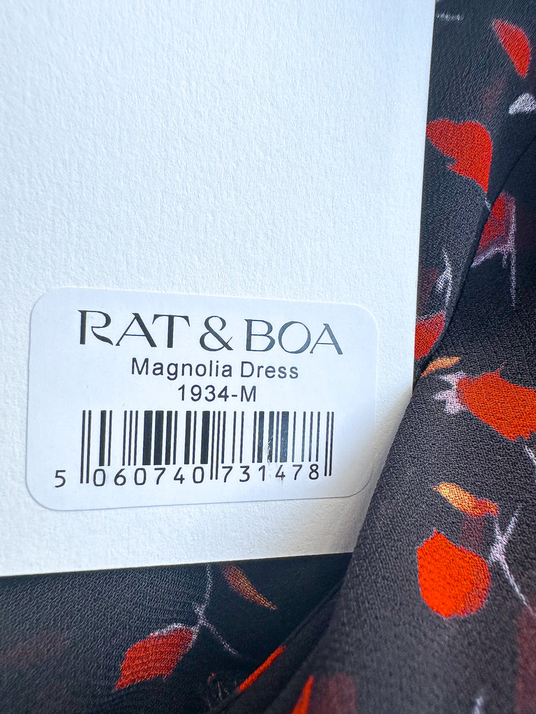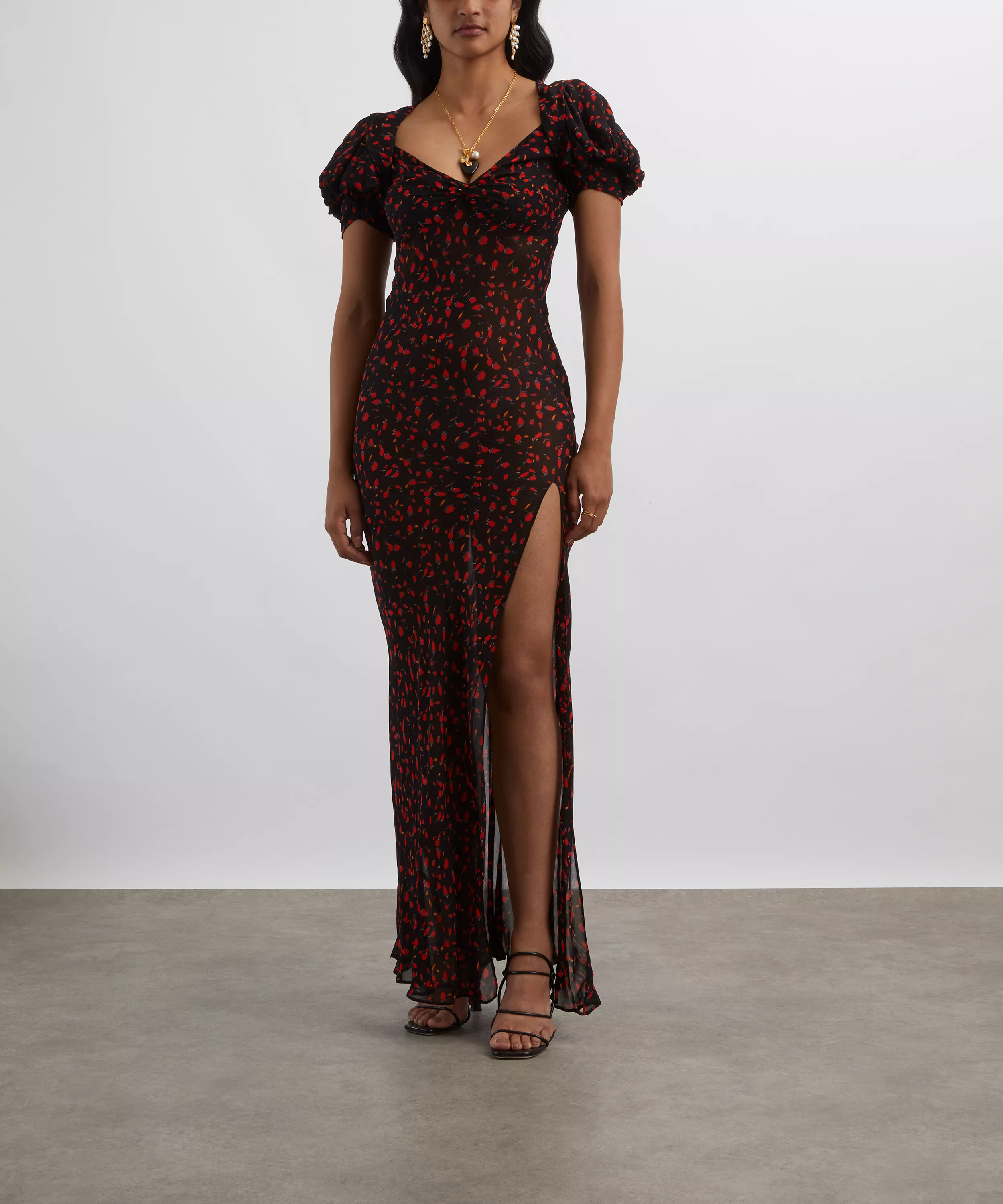 La robe longue Magnolia illustre la passion de Rat & Boa pour les imprimés éclatants, les matières riches et les coupes flatteuses. Confectionnée en georgette de viscose semi-transparente et ornée d'un audacieux motif floral rouge, cette robe longue cintrée séduit par son décolleté en cœur romantique, ses manches bouffantes espiègles et sa fente audacieuse jusqu'à la cuisse.