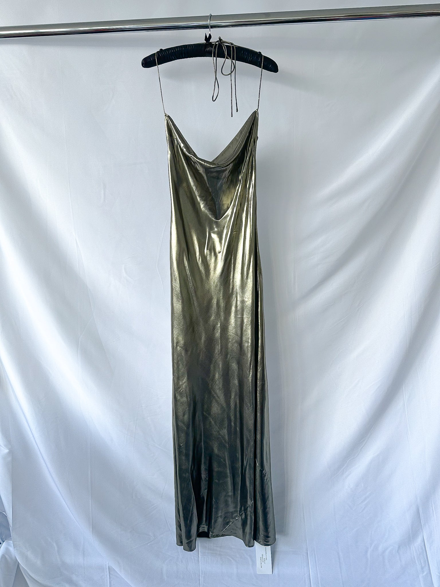 Robe longue dos nu à coupe en biais et imprimé or liquide Vénus Rat et Boa
