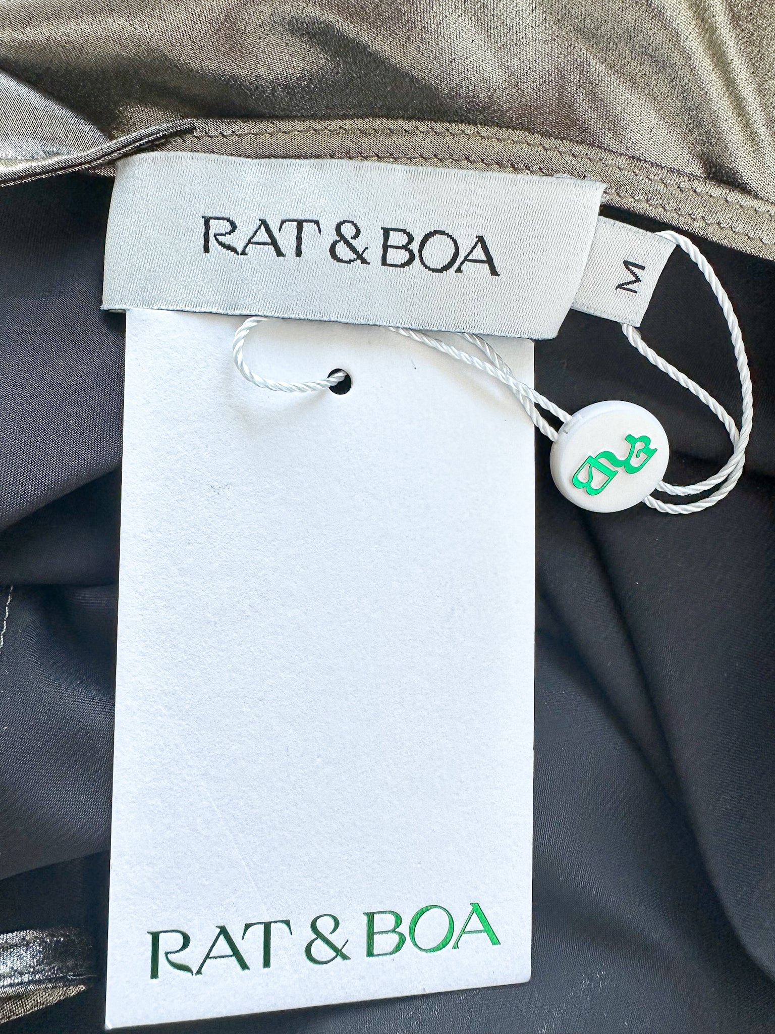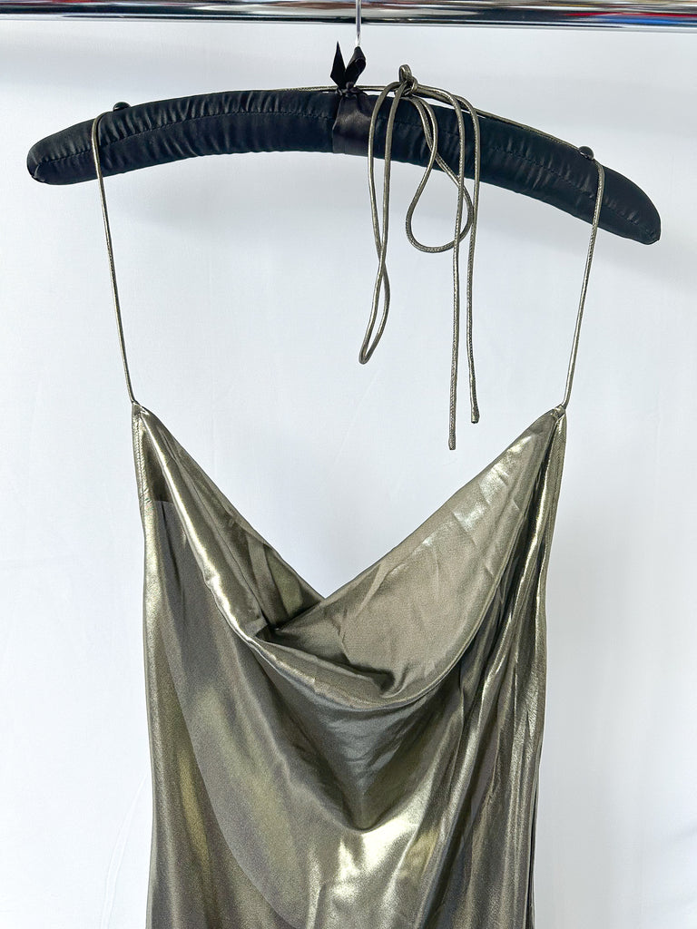 Brillez de mille feux avec la robe nuisette Venus de Rat And Boa, un rêve en lamé or liquide. Sa silhouette d'inspiration vintage, drapée en biais, épouse vos courbes avec grâce. Les liens ajustables au niveau du cou assurent un maintien parfait, pour une allure à la fois décontractée et pleine de confiance.