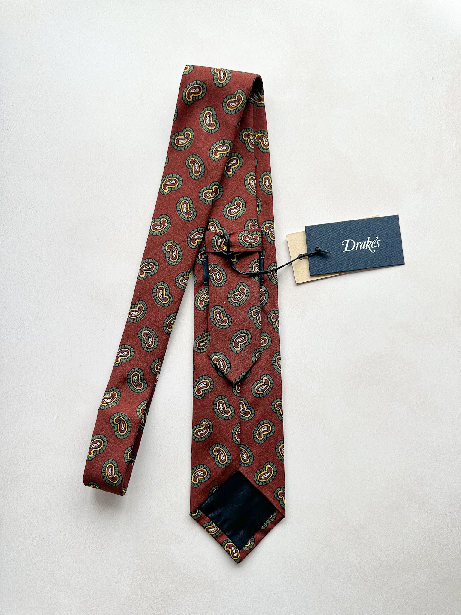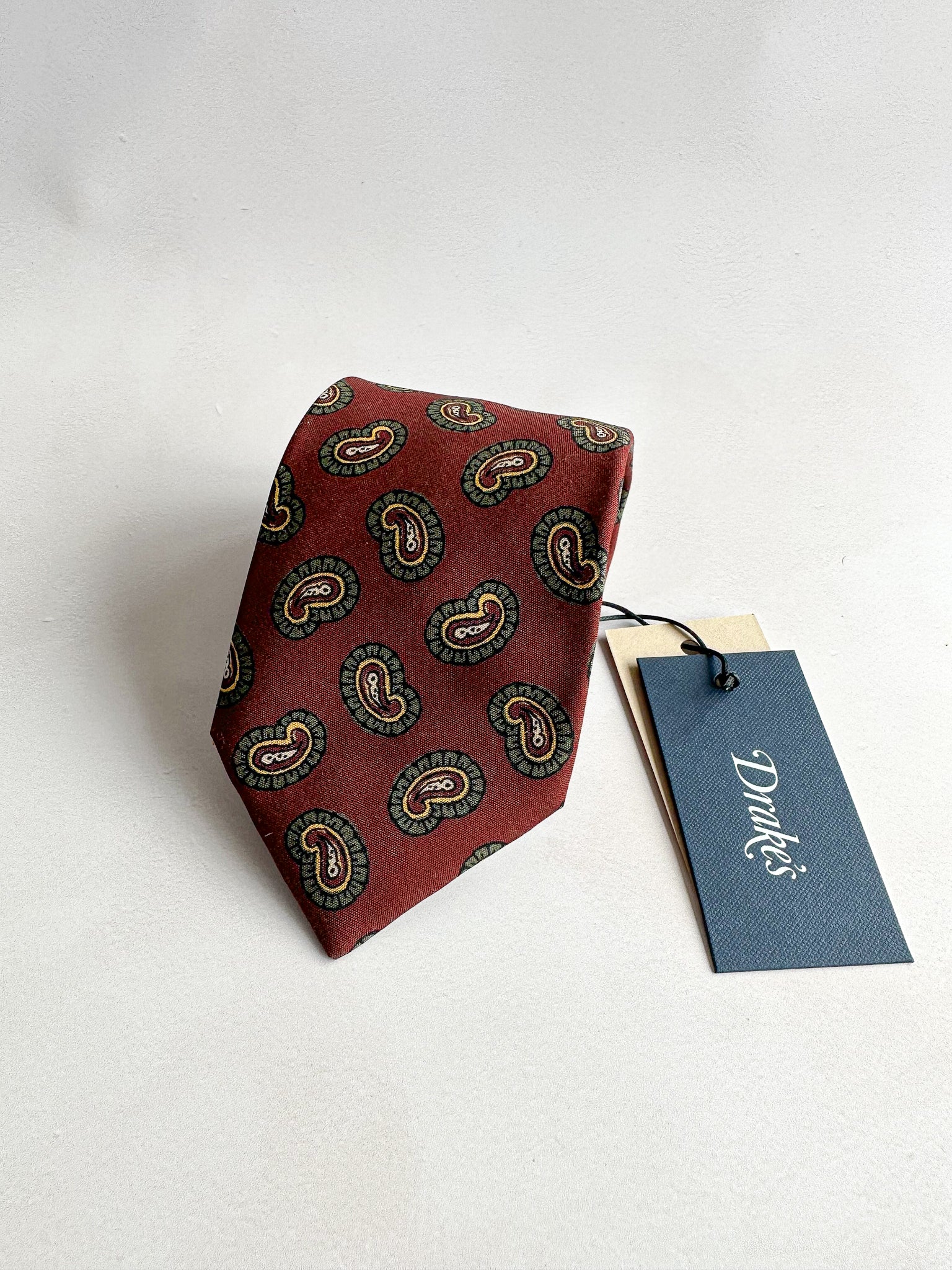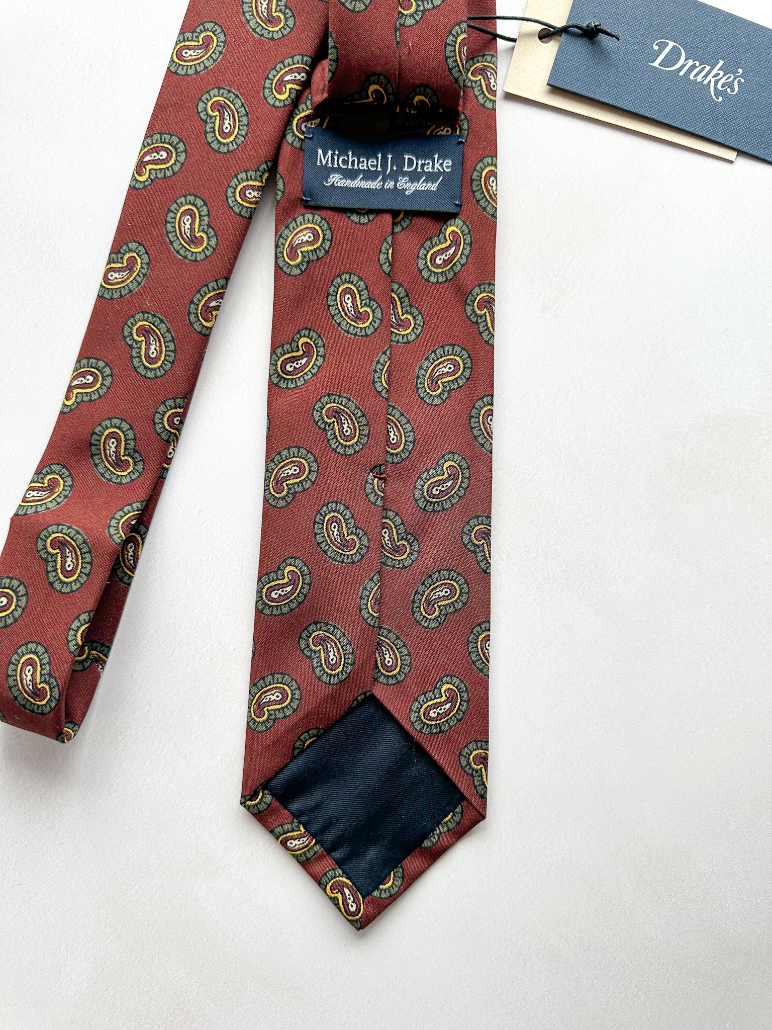 Cravate en soie bordeaux Michael J Drake de Drake, motif cachemire olive