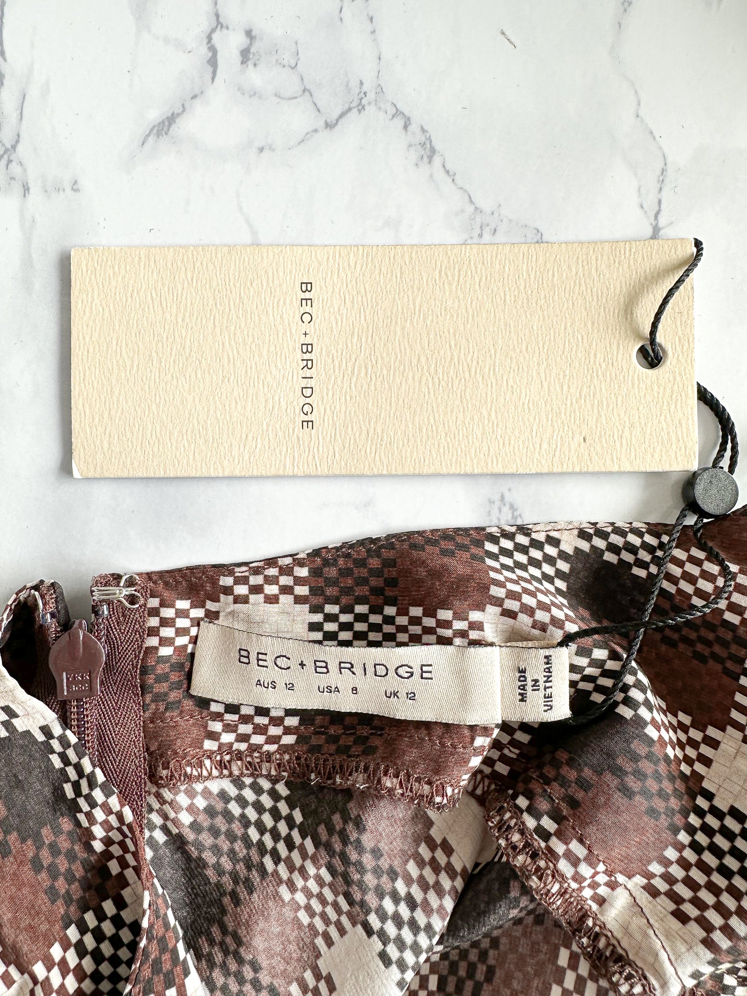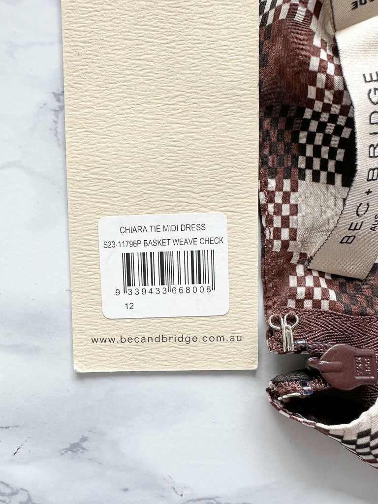 Cette robe midi à carreaux Chiara de Bec + Bridge, en natté et à nouer, présente une encolure dégagée froncée et un lien à nouer au centre devant pour un ajustement parfait. Le panneau poitrine à pinces sculptantes sublime la silhouette, tandis que la jupe coupée en biais offre un drapé élégant pour une coupe flatteuse. Dotée d'un ourlet délicat à deux plis, elle se ferme discrètement par une agrafe et une fermeture éclair invisible au dos. Parfaite pour un style décontracté avec une touche de fantaisie.