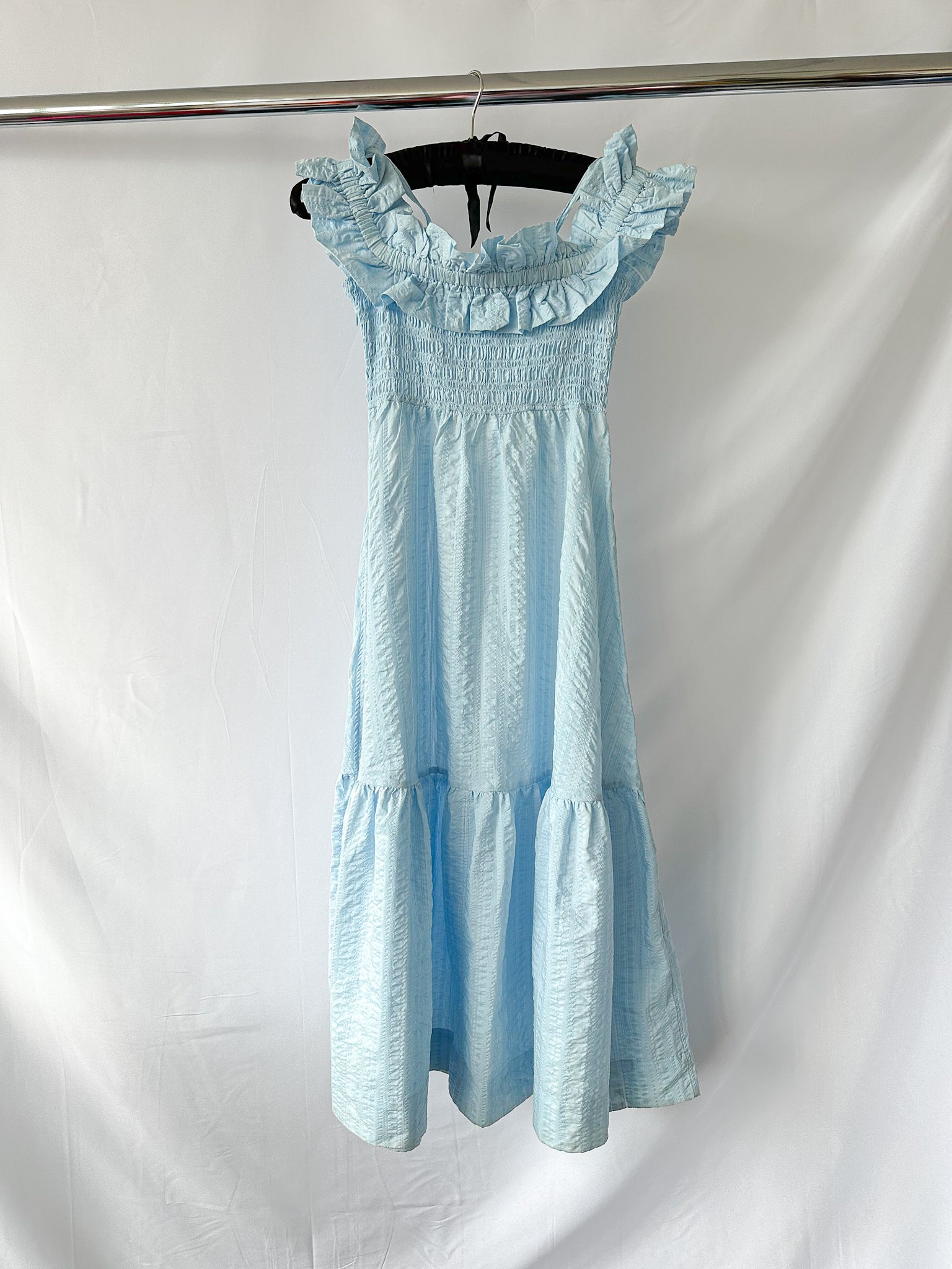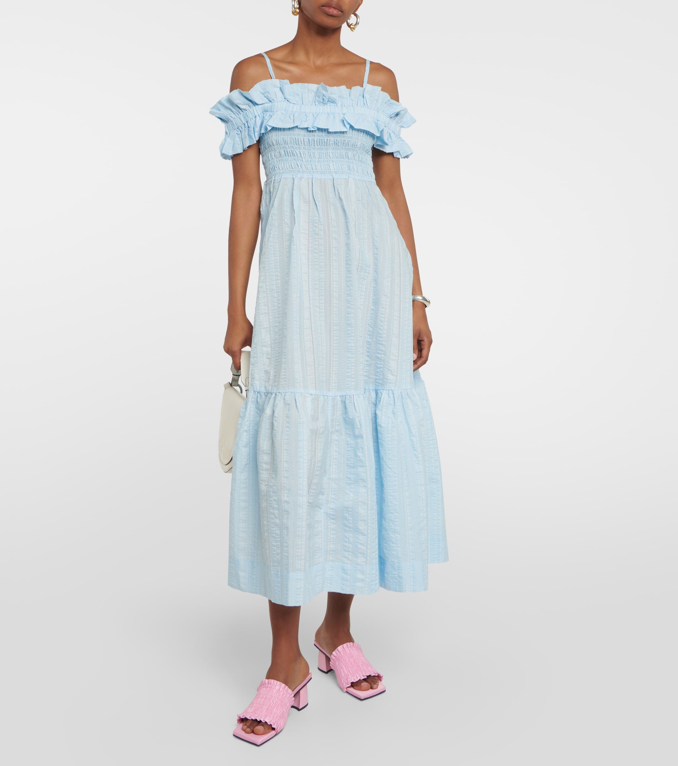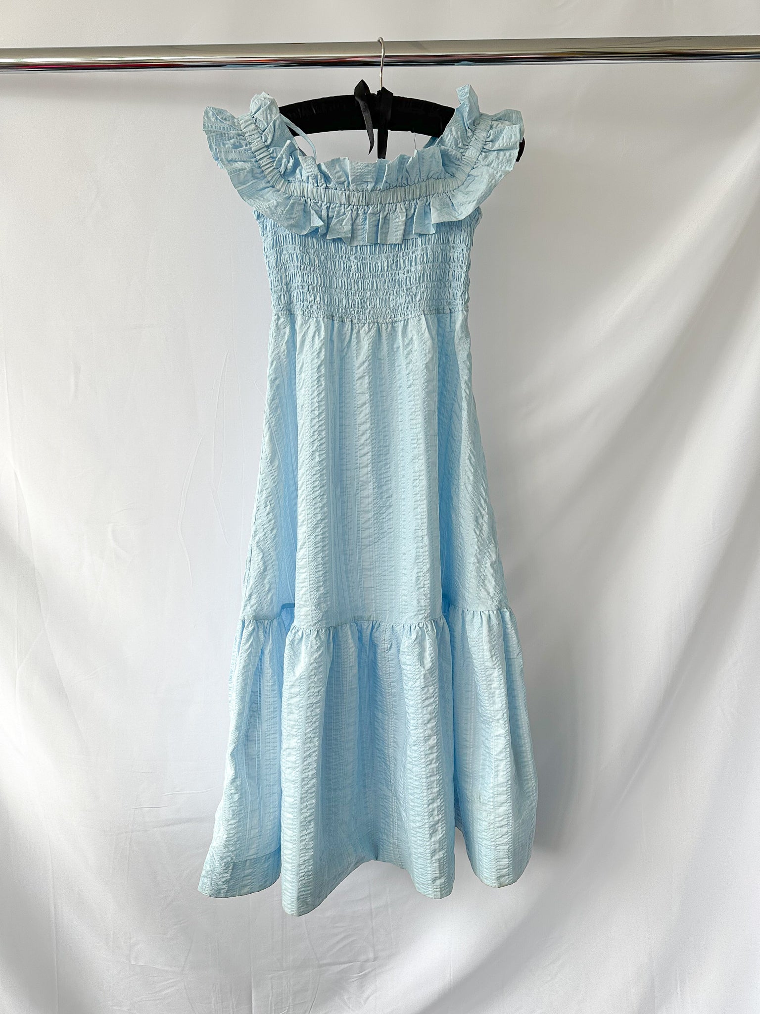 Adoptez un charme naturel avec la robe longue à épaules dénudées et smocks bleus Ganni. D'un bleu doux, son corsage à smocks et ses volants fantaisie ajoutent une touche de séduction. Confectionnée en tissu texturé, cette robe épouse une silhouette décontractée, parfaite pour les journées décontractées avec une touche d'élégance.