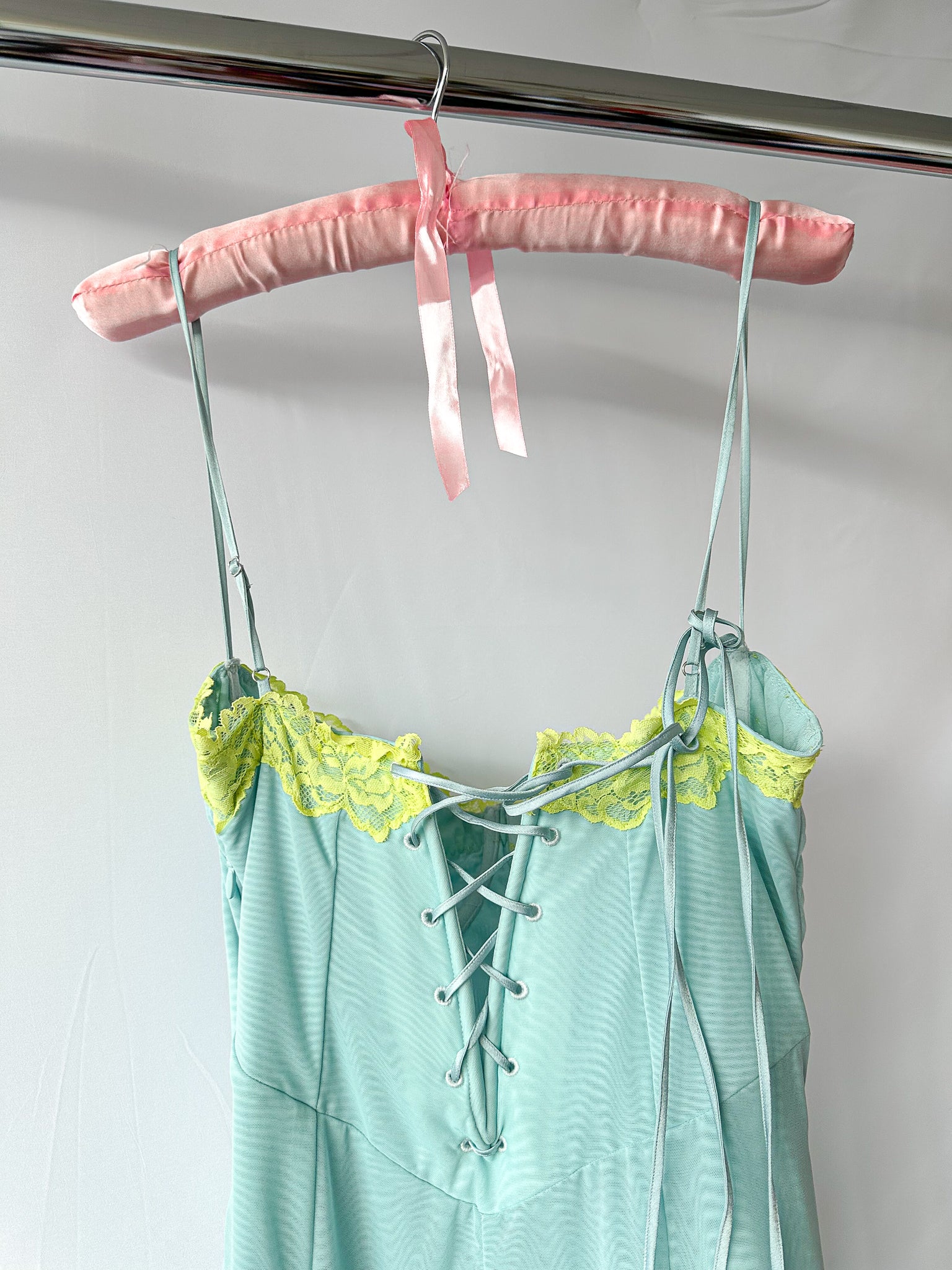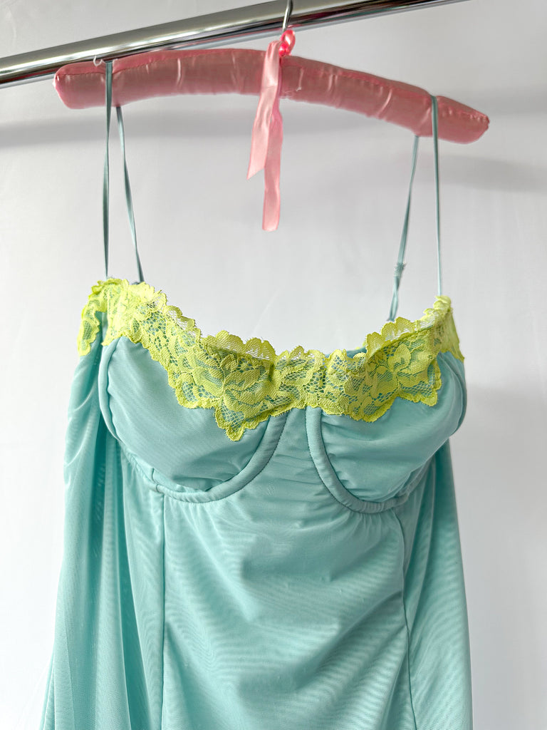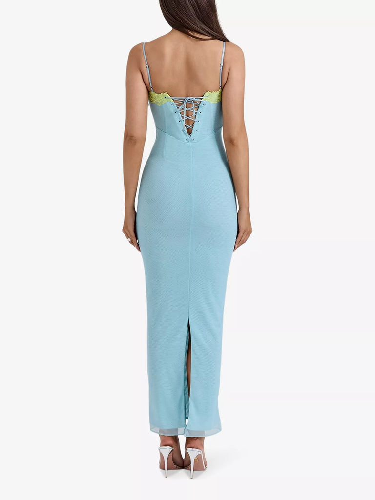 Robe longue en dentelle contrastée bleu poudré Aiza de House Of CB