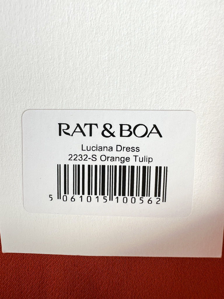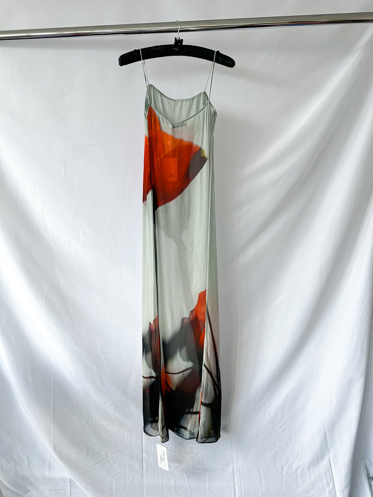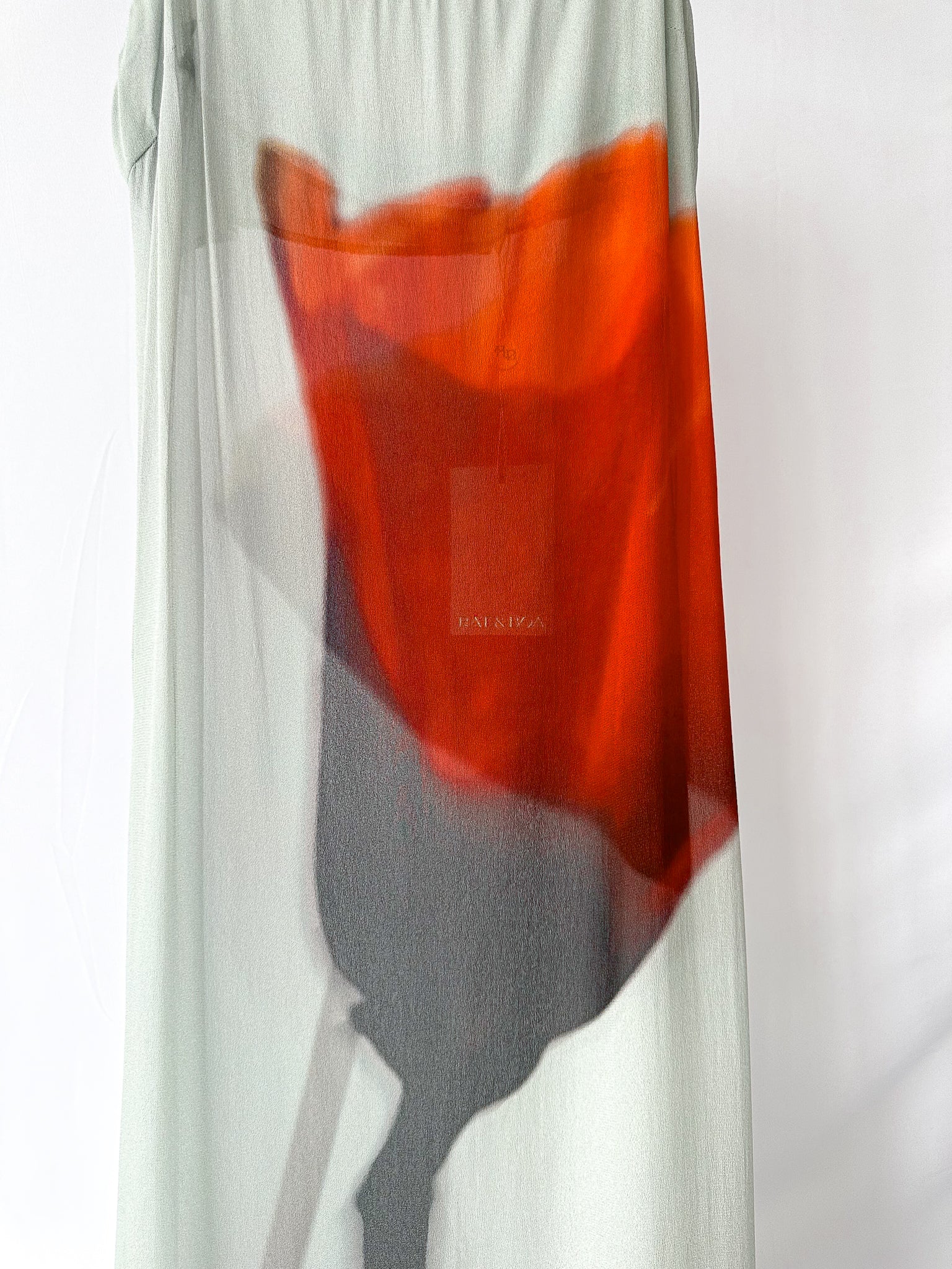 La robe longue Luciana illustre l'amour de Rat & Boa pour les imprimés accrocheurs, les tissus somptueux et les coupes flatteuses. Confectionnée en georgette de viscose semi-transparente et ornée d'un motif tulipe orange vif, cette robe offre une élégance fluide grâce à sa coupe trapèze décontractée, ses bretelles délicates et son ourlet qui glisse au sol.