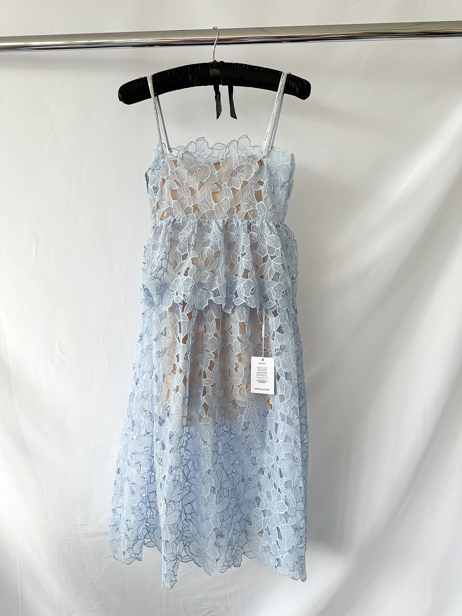 Adoptez l'élégance avec une touche ludique grâce à la robe midi en organza guipure bleu clair de Self-Portrait. Confectionnée en organza délicat, cette robe arbore de charmantes découpes et de délicates broderies florales qui dansent sur une combinaison beige pour une couverture subtile. Sa taille cintrée sublime votre silhouette et se prolonge par une jupe midi festonnée à volants qui épouse parfaitement vos mouvements. De fines bretelles ornées de cristaux scintillants apportent la touche d'éclat idéale pour une touche de fantaisie et de séduction. Idéale pour se lancer avec assurance et style dans toutes les occasions spéciales.