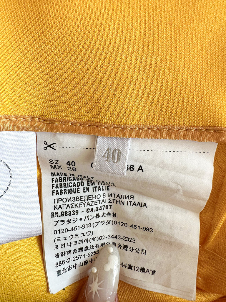 Égayez votre garde-robe avec cette mini-jupe Prada jaune à volants et patch logo. Sa teinte jaune joyeuse et ses volants ludiques lui confèrent une allure ludique et séduisante, tandis que sa taille ceinturée assure une coupe flatteuse. Ornée d'un élégant patch logo, cette jupe allie avec élégance style créateur et charme juvénile, parfaite pour faire tourner les têtes lors des journées ensoleillées ou des soirées.