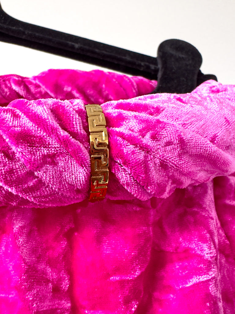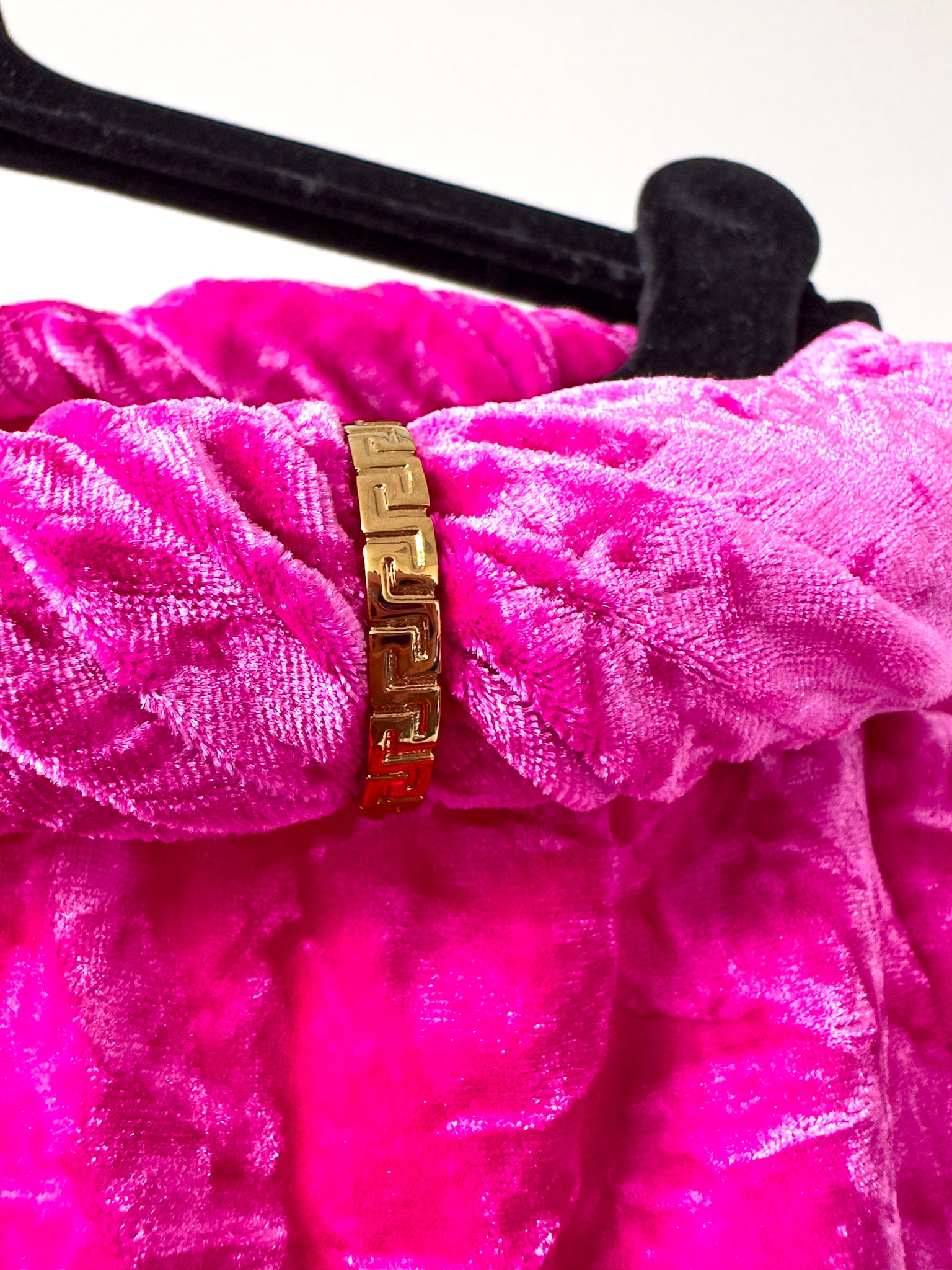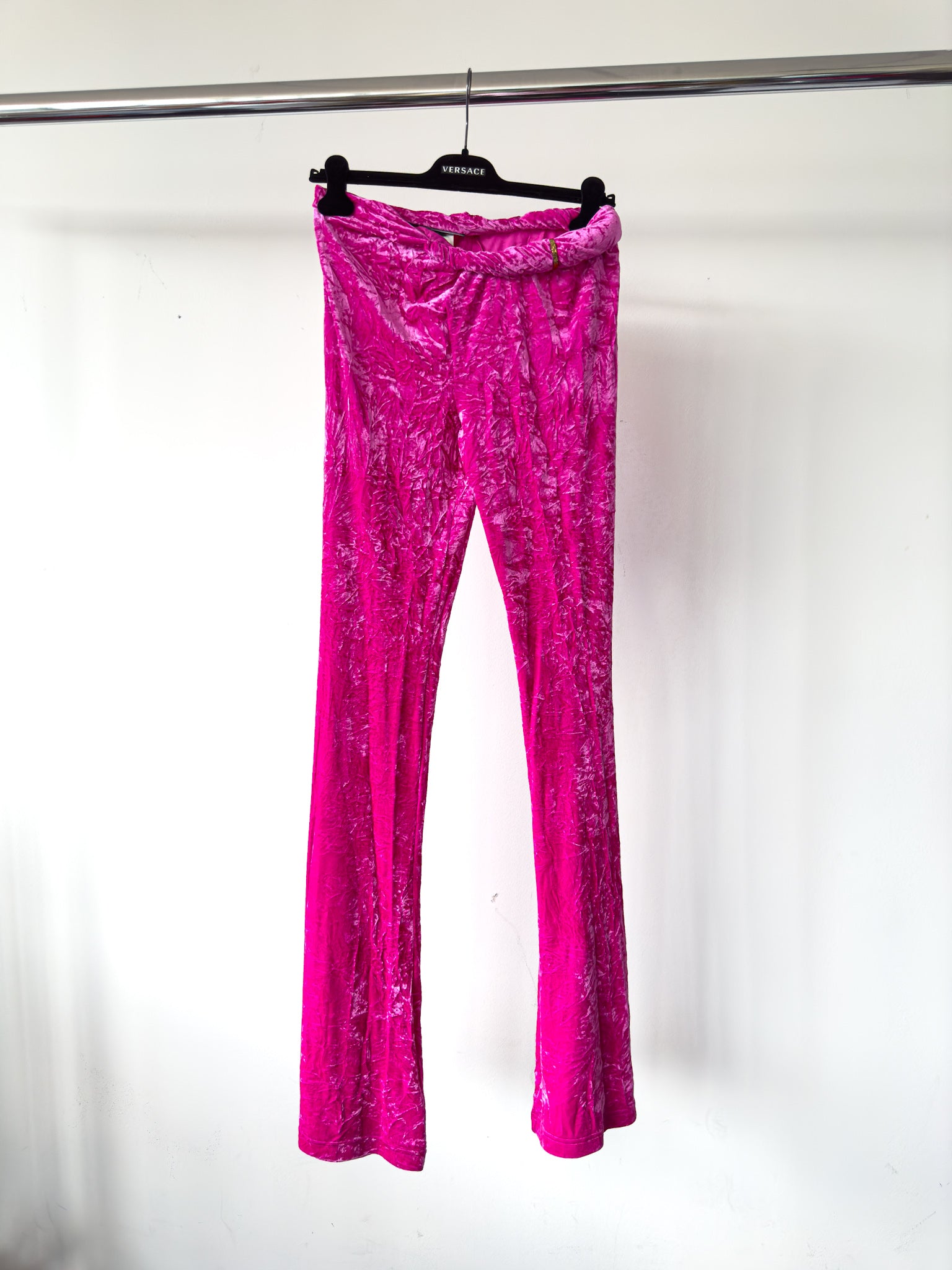 Pantalon Versace en velours rose écrasé avec détails en or et anneaux