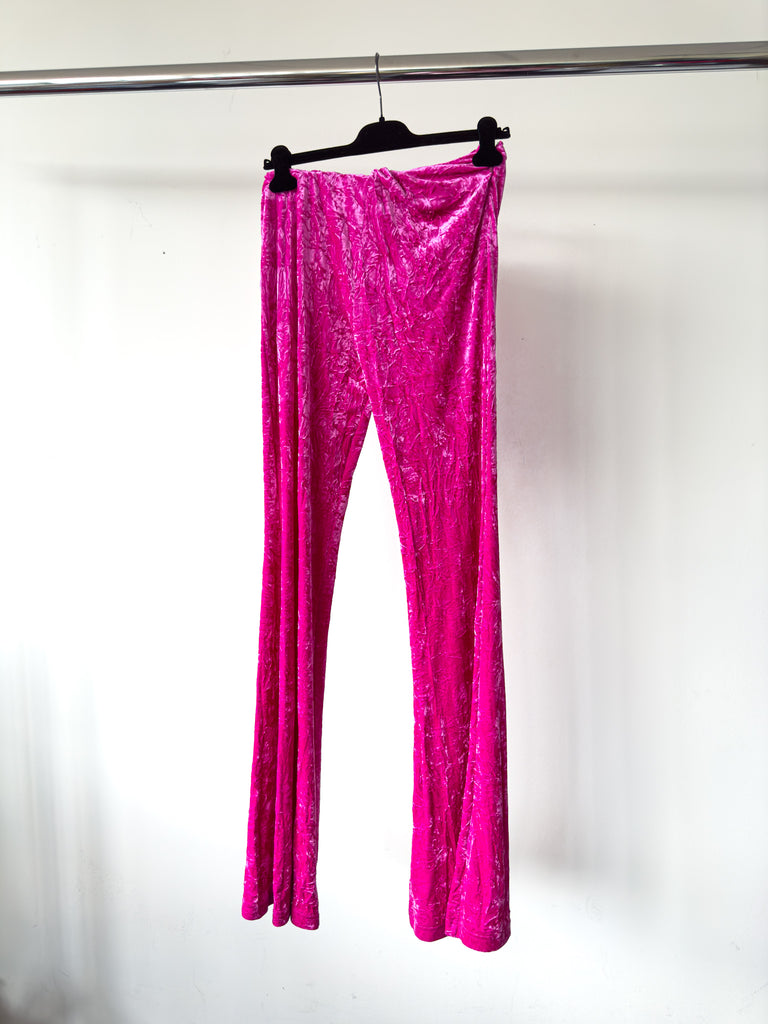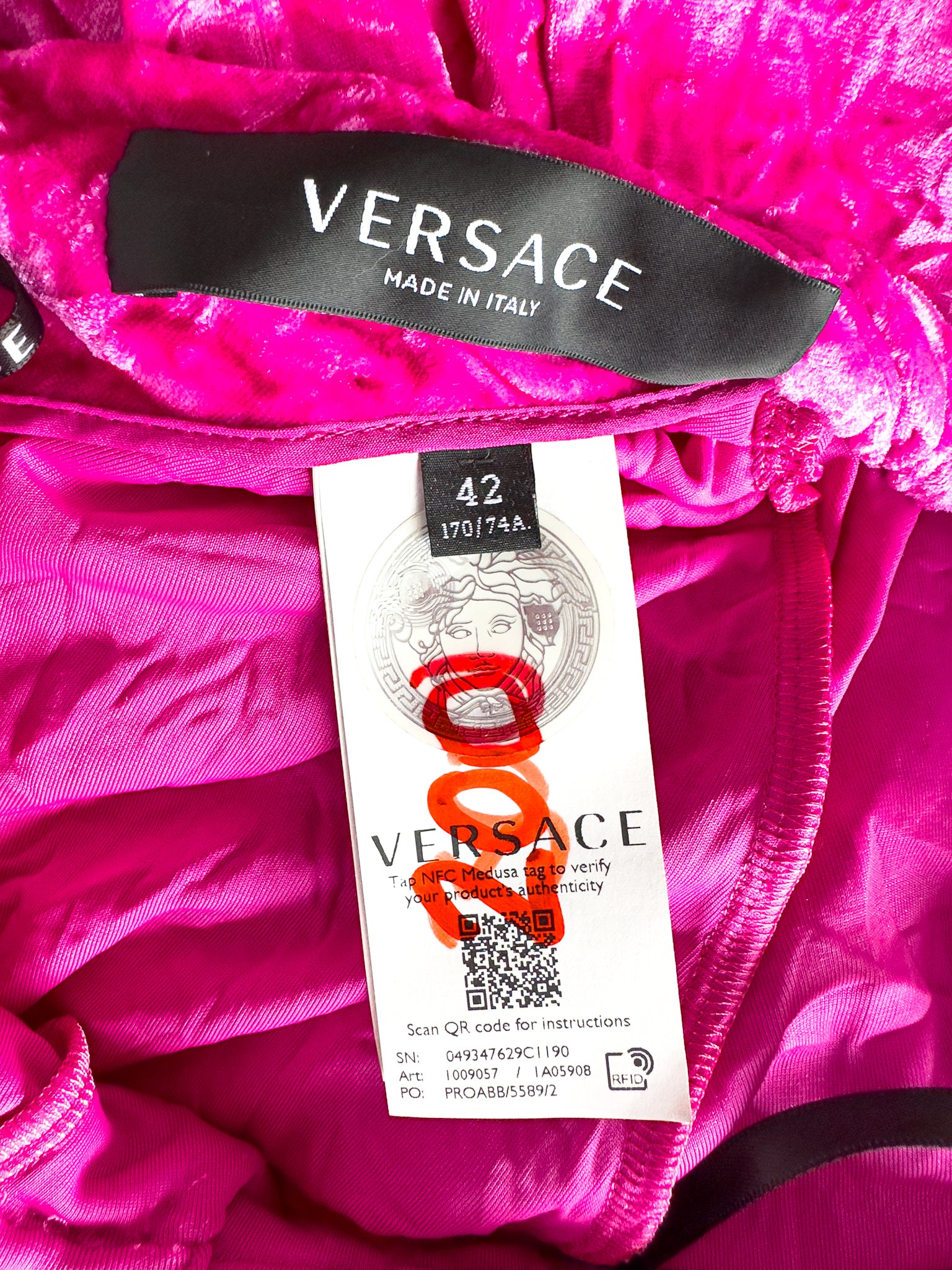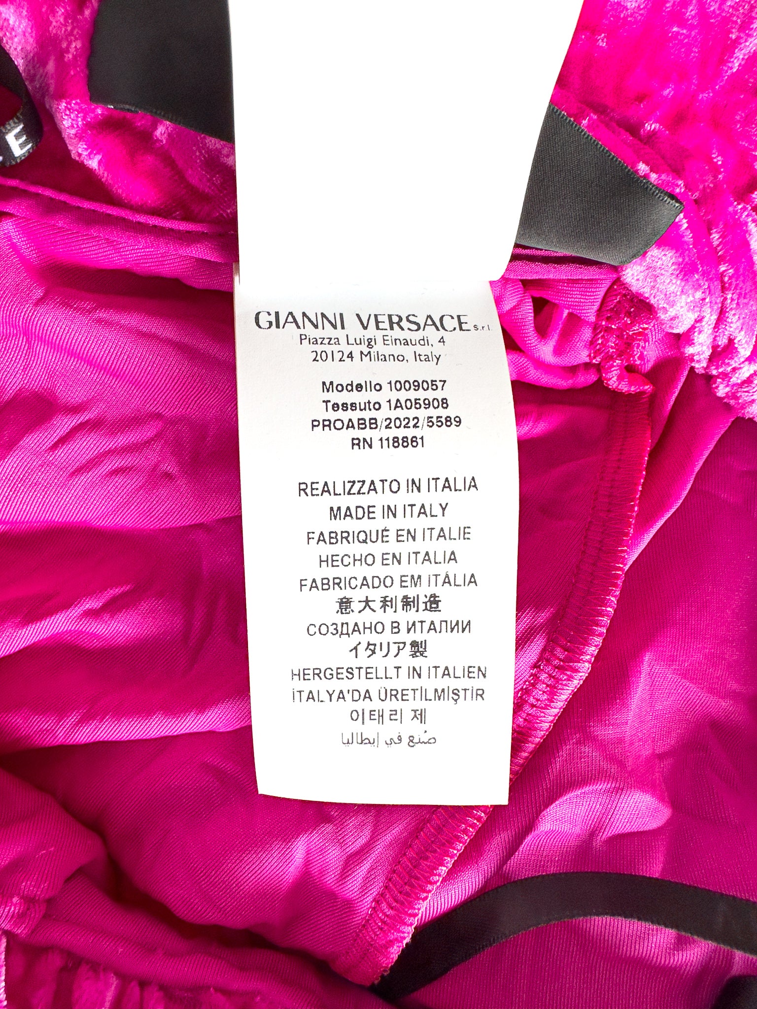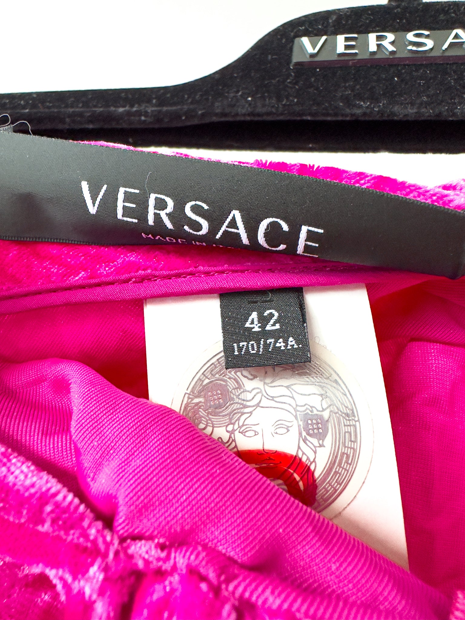 Pantalon Versace en velours rose écrasé avec détails en or et anneaux