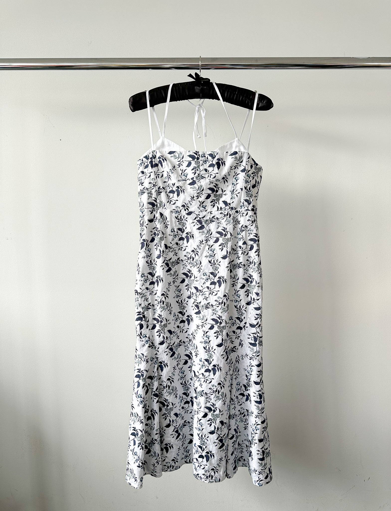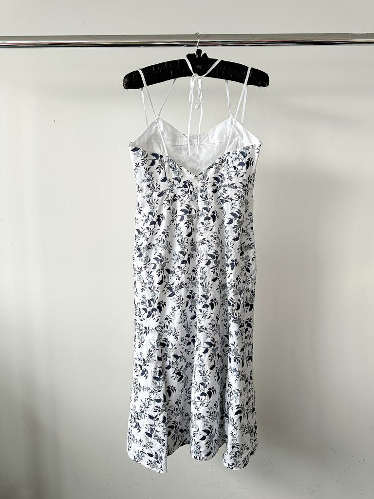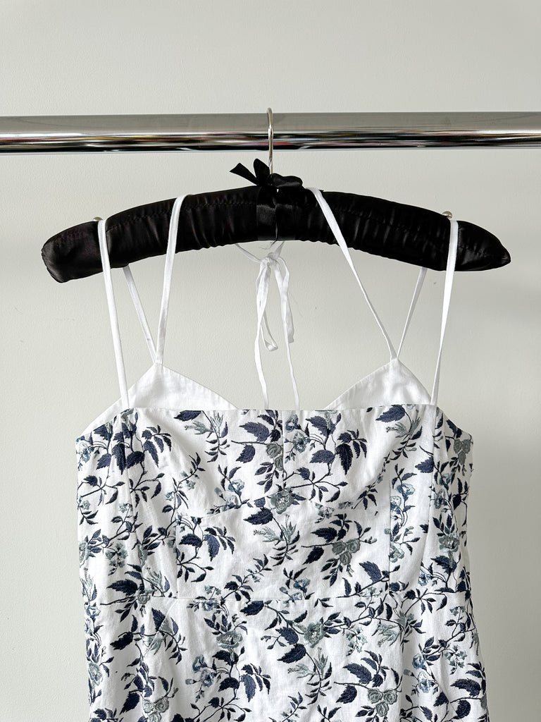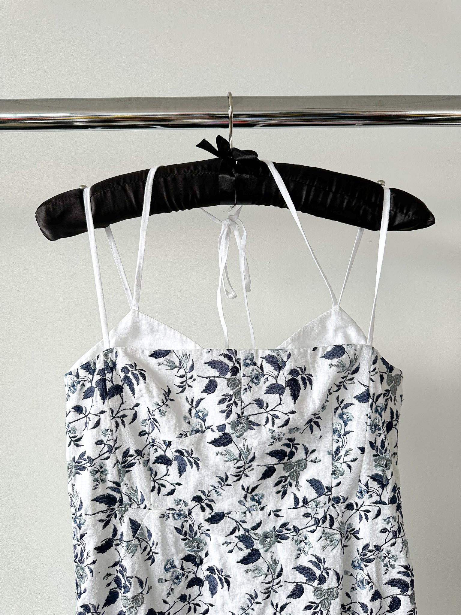 ERDEM Robe mi-longue en lin brodé à fleurs bleu blanc à bretelles