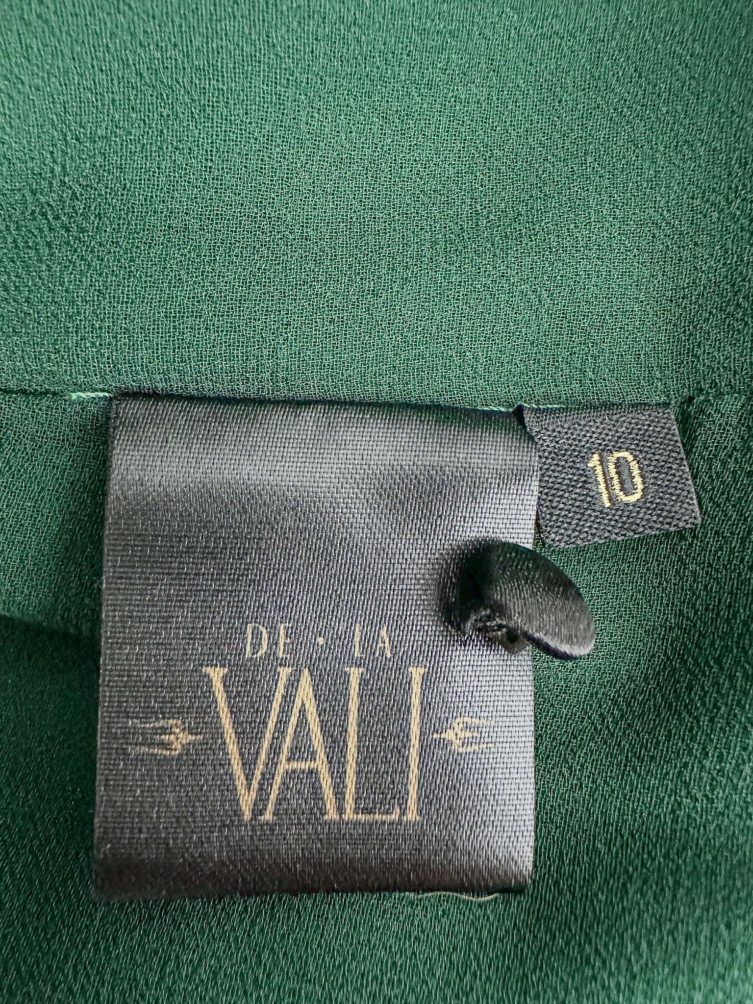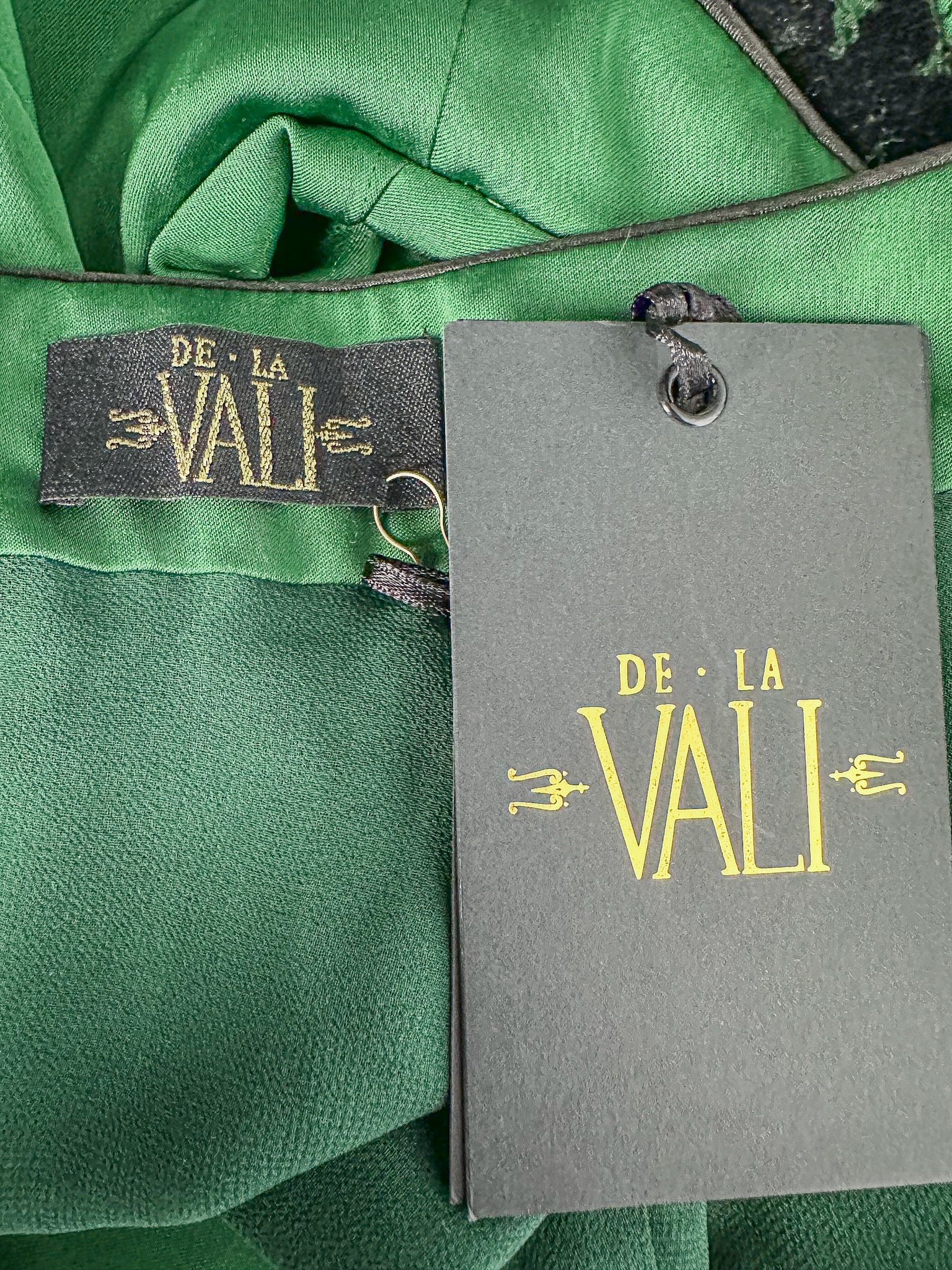 Elevate your evening wardrobe with this striking De La Vali mini dress, crafted from luxurious green satin that catches the light beautifully. The open front design paired with a refined mandarin collar creates a contemporary silhouette, while delicate lace detailing adds an unexpected touch of femininity. Perfect for sophisticated occasions, this piece balances modern minimalism with intricate craftsmanship, making it an investment piece that transitions effortlessly from dinner to cocktail events.