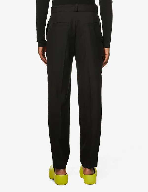 Relaxed fit, mid rise, straight leg, belt loops, two slip pockets at front, two welt pockets at back, pressed creases at front and back legs, tonal stitching, straight cuffs