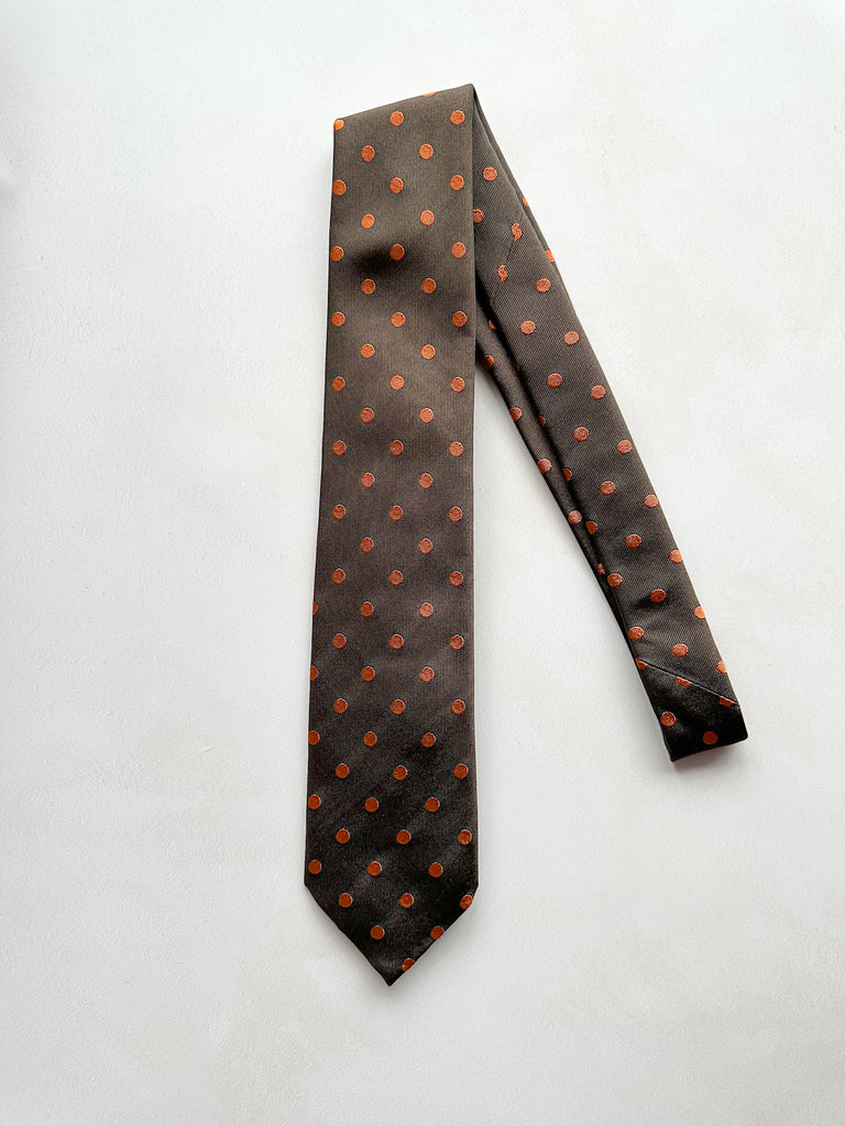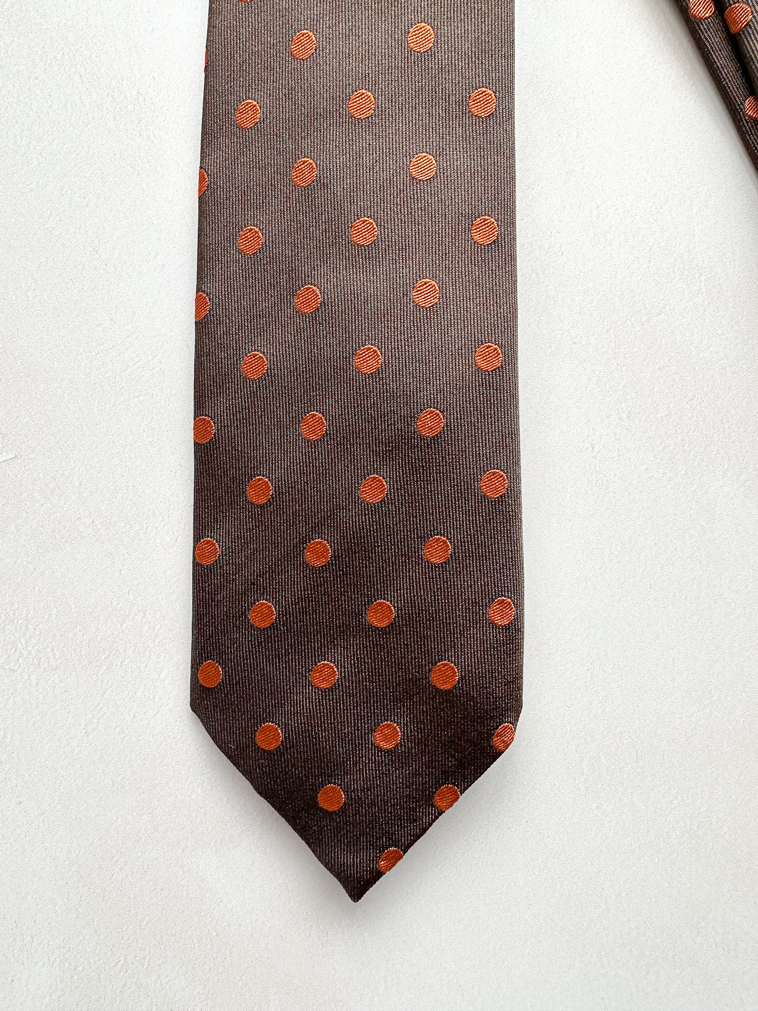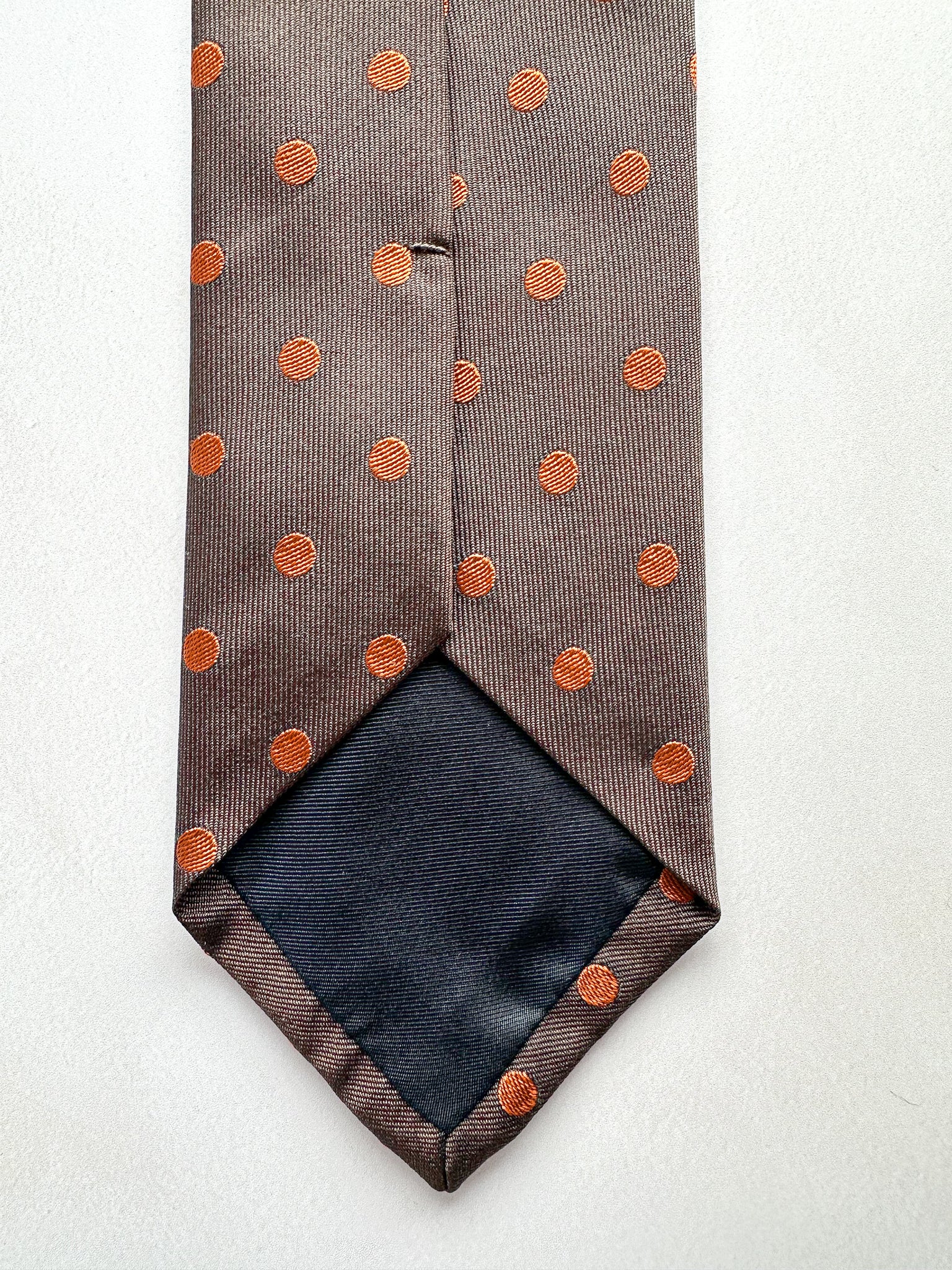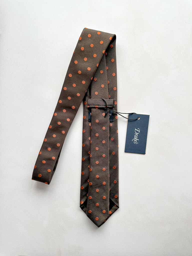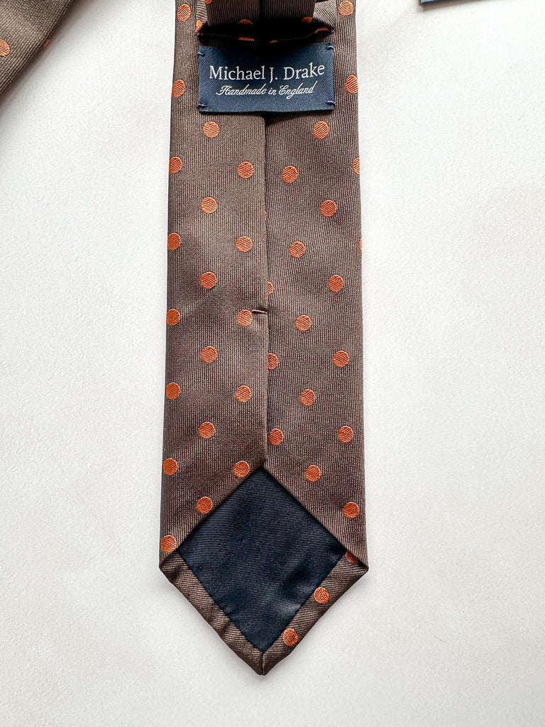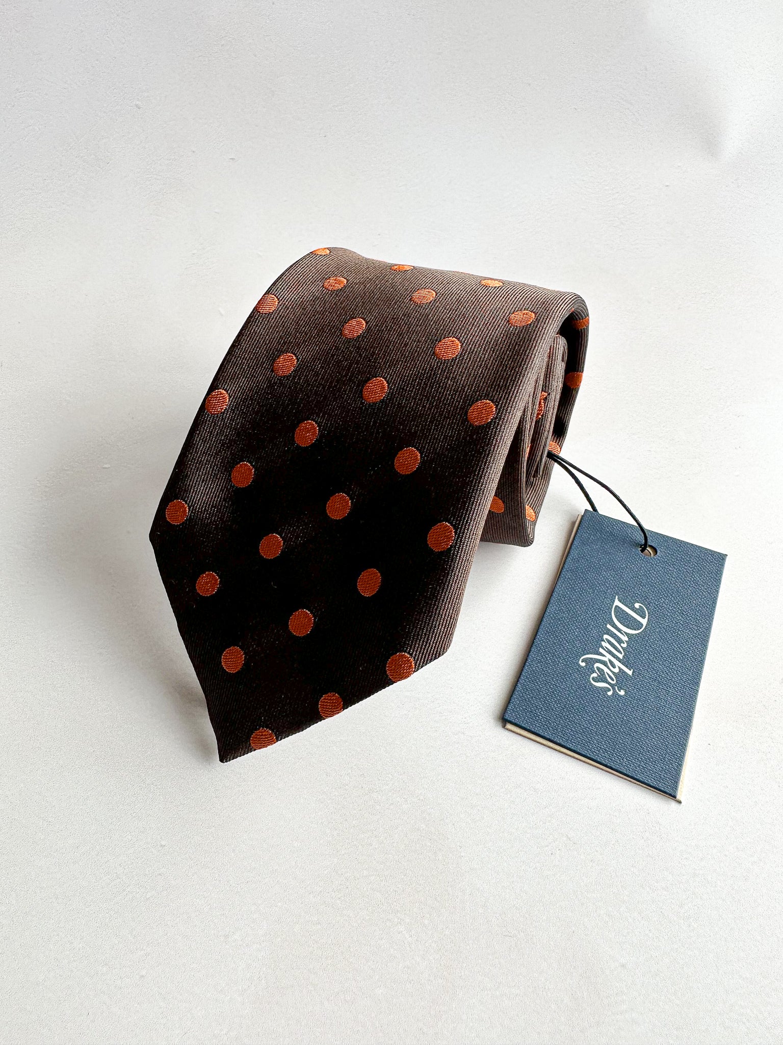 Elevate your style with Drake's Michael J Drake silk tie, featuring a bold chocolate brown base woven with striking burnt orange spots. Crafted from heavyweight silk, this daring accessory commands attention while offering luxurious texture. Handmade in England, it blends classic craftsmanship with a fearless pop of color to transform any outfit.