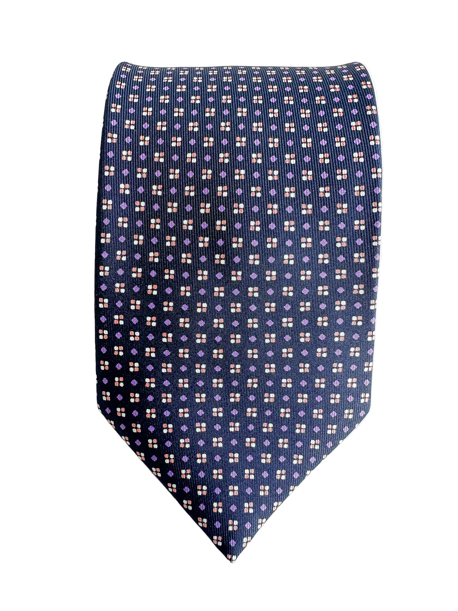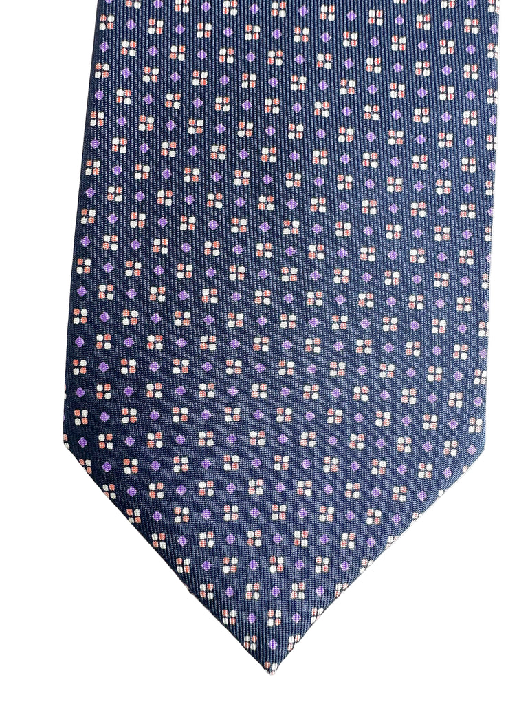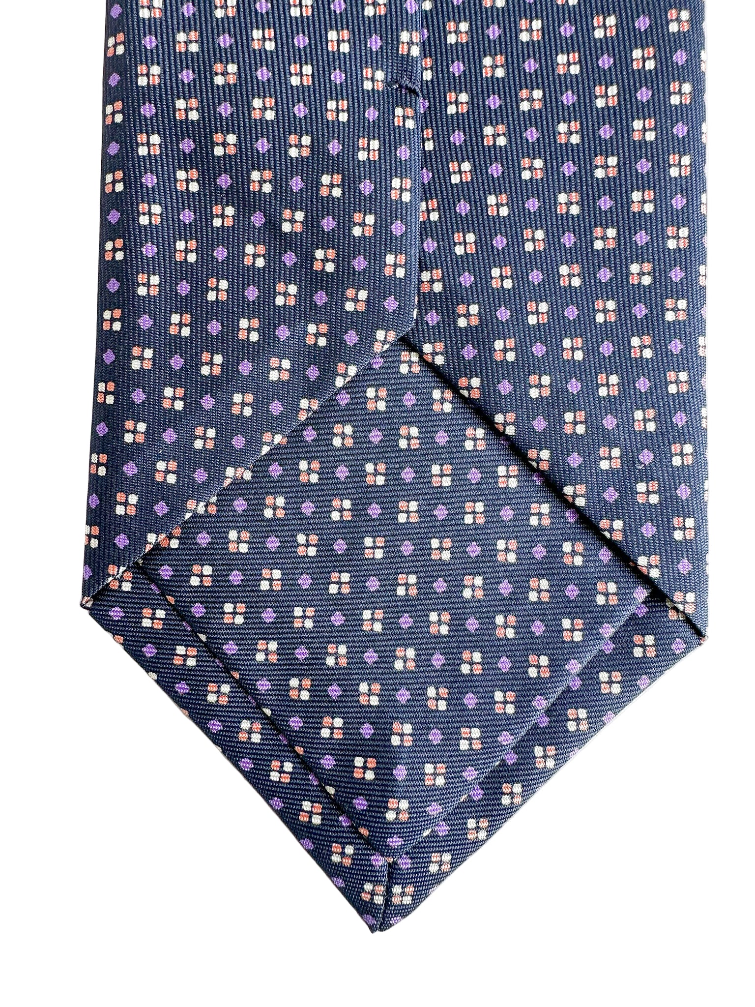Drake's Navy Silk Tie With Purple Diamond Dot Print