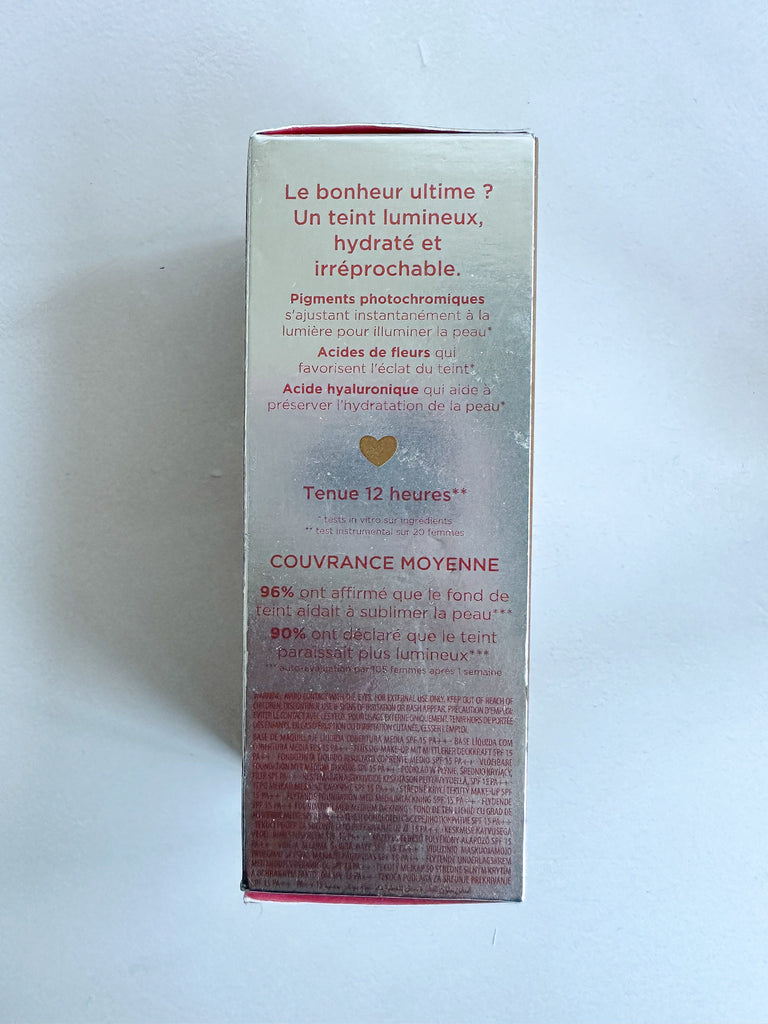 Happiness is a brighter, hydrated, flawless-looking complexion. This medium coverage liquid foundation feels lightweight, looks natural and is virtually undetectable on skin. Contains photochromic pigments that instantly adapt to brighten skin in any lighting, natural or artificial,* flower acids to help boost radiance and hyaluronic acid to attract moisture to the skin’s surface and help maintain hydration.