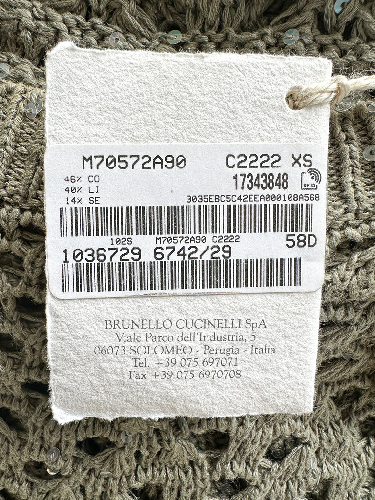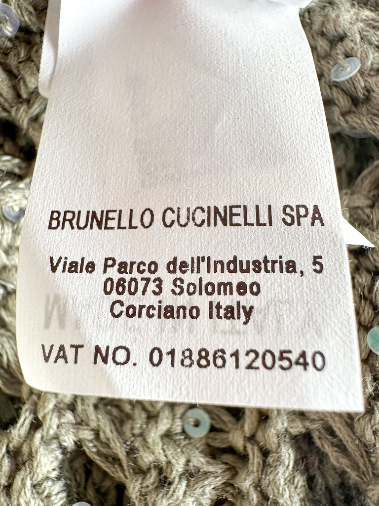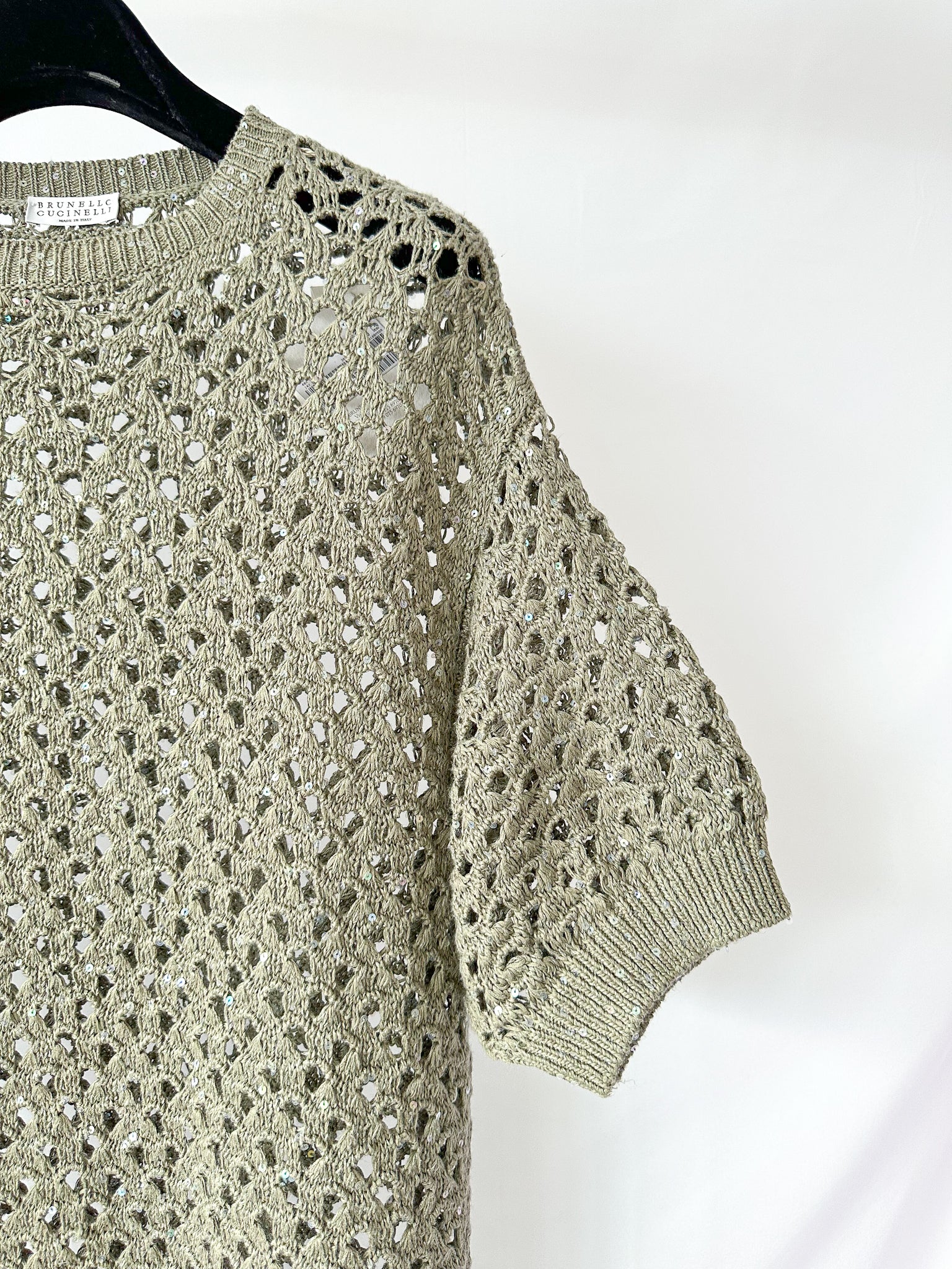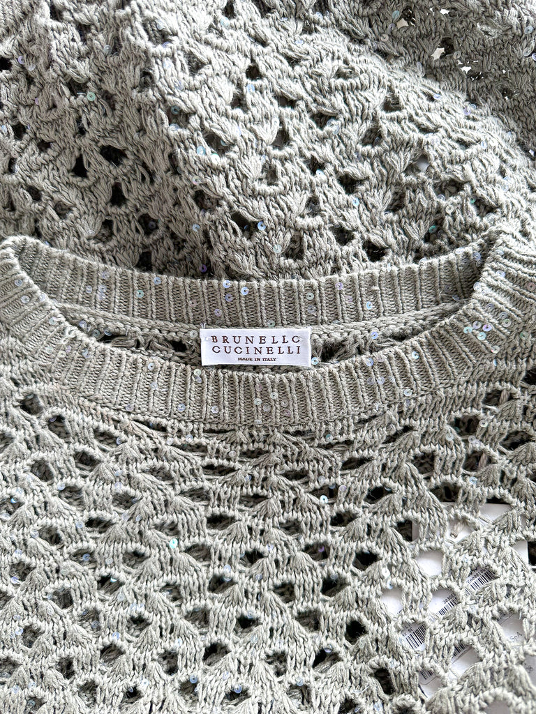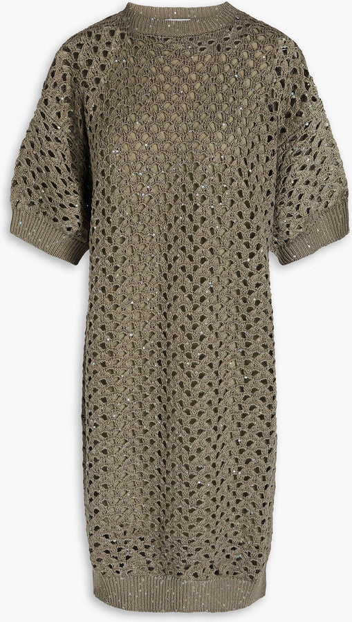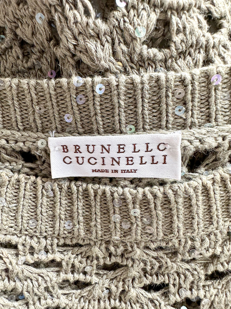 Embrace the shine with the Brunello Cucinelli Green Crochet Open Knit Dress. Made from a breezy cotton, linen and silk mix, this dress combines airy comfort with sparkling charm. Its open knit style keeps you fresh, while sequins add a fun, glittering pop. Ideal for stealing the spotlight at garden gatherings or laid-back stylish events. Let your attire sparkle and captivate!