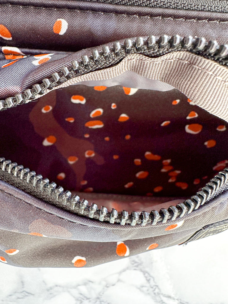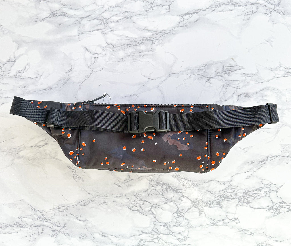 The popular PORTER STAND series "PS CHIP CAMO" is a cool and original design inspired by the chocolate chip camouflage commonly used in desert regions. The unique pattern and color palette of black and navy, with vibrant orange accents, is trademarked by PORTER. The main material is nylon twill with a soft and durable cotton bonding treatment. This series offers a variety of items, including bags and wallets, suitable for both men and women in any scenario. The waist bag is not just great for daily use, but also perfect as a sub-bag for keeping your passport, guidebook, and other essentials while on the go.