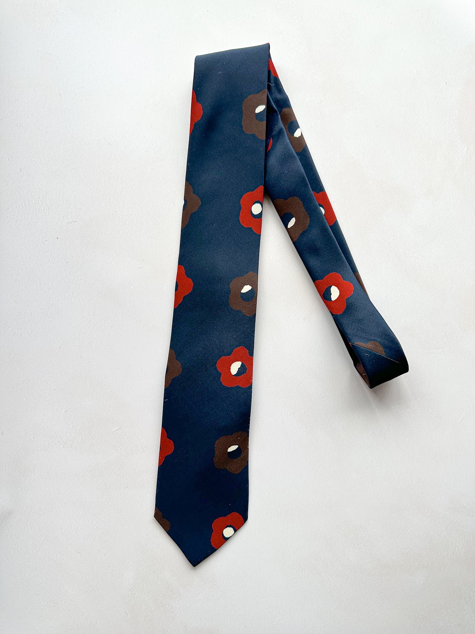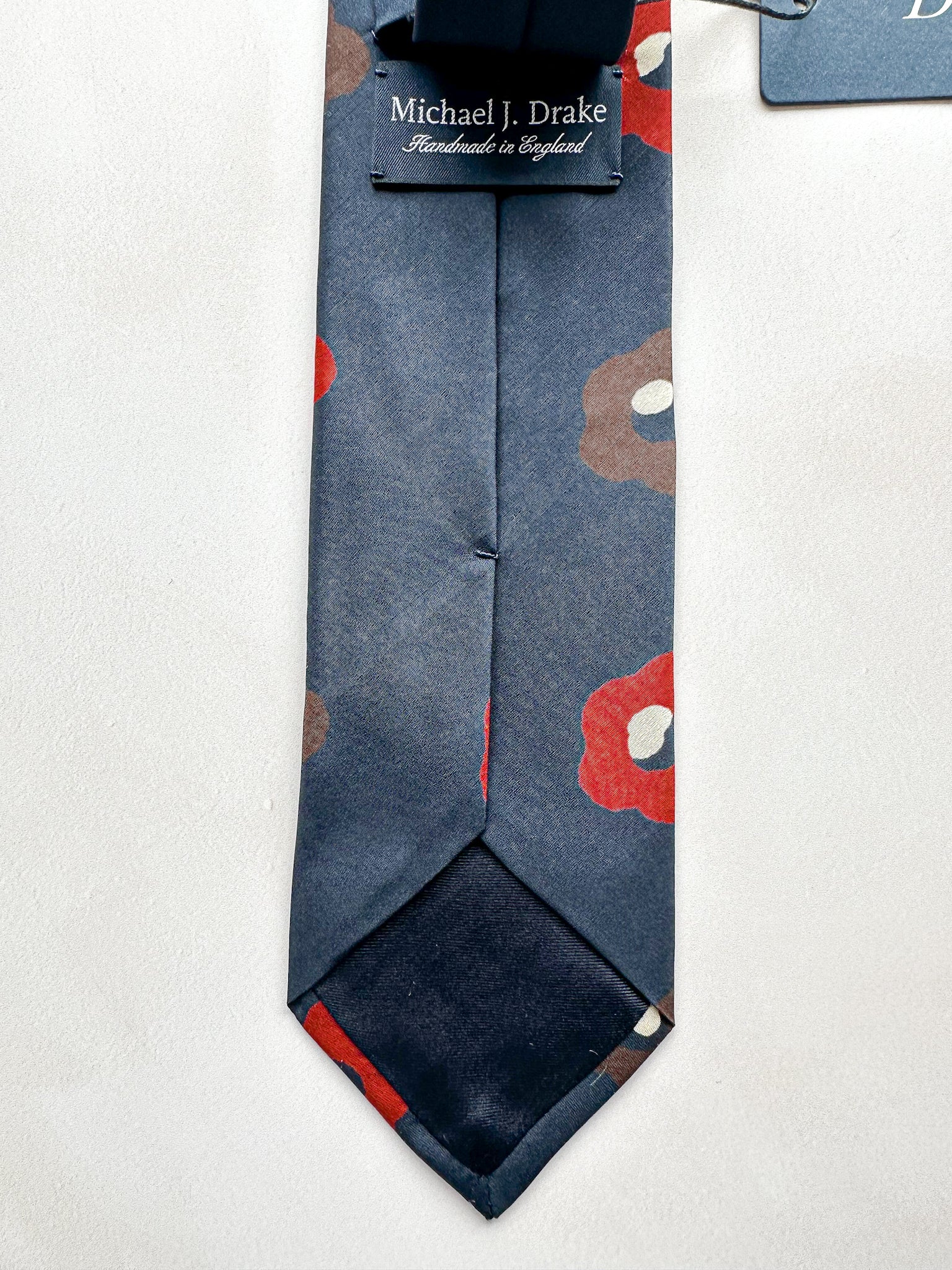Elevate your style with Drake's Michael J Drake Navy Silk Tie, featuring a bold vintage floral print in navy, raspberry, and choclate brown. Handmade in London, this daring accessory blends classic craftsmanship with a retro edge, perfect for those who want to stand out with confidence.