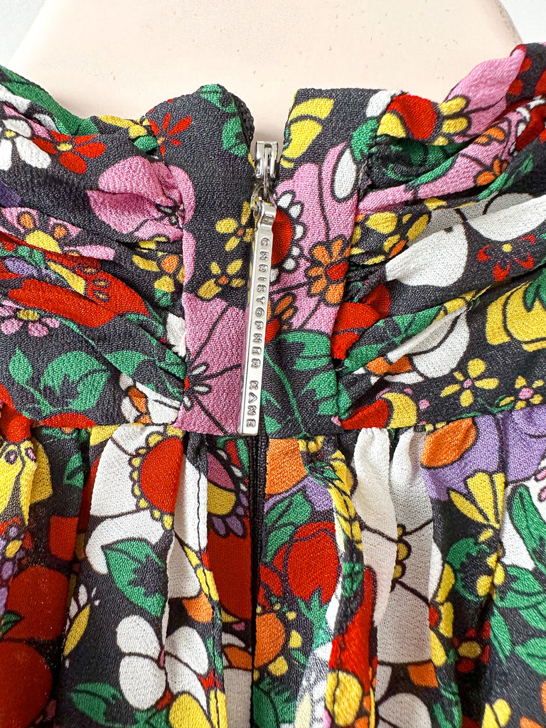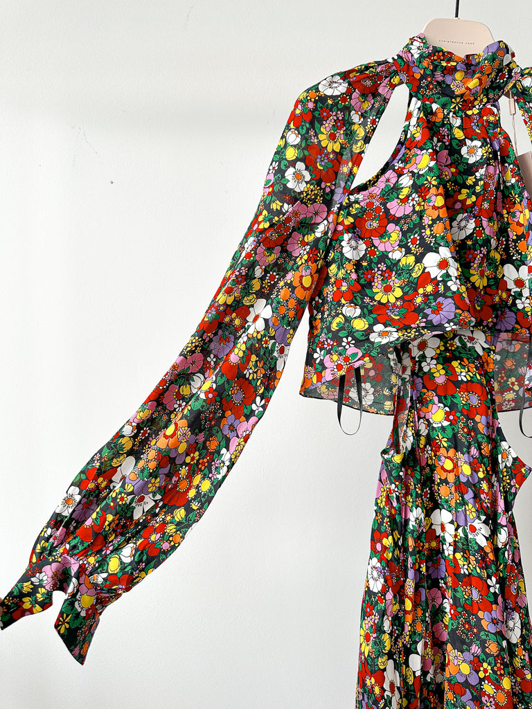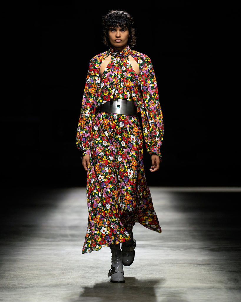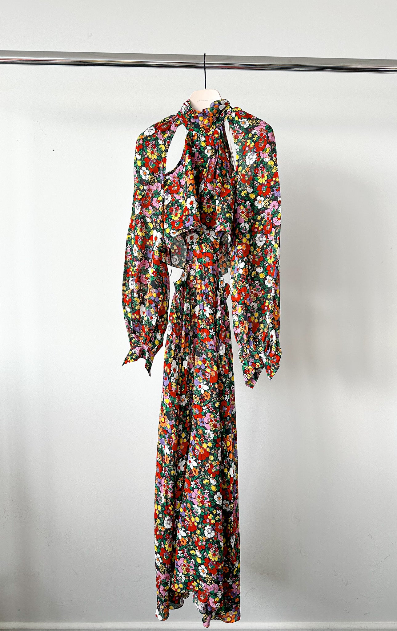 Christopher Kane brilliantly blends modern vibes with classic florals in this eye-catching midi dress. The playful design features cheeky peek-a-boo cutouts that cleverly highlight the high neckline while giving a flirty glimpse of midriff—perfect for making a fashion statement with a twist of fun!