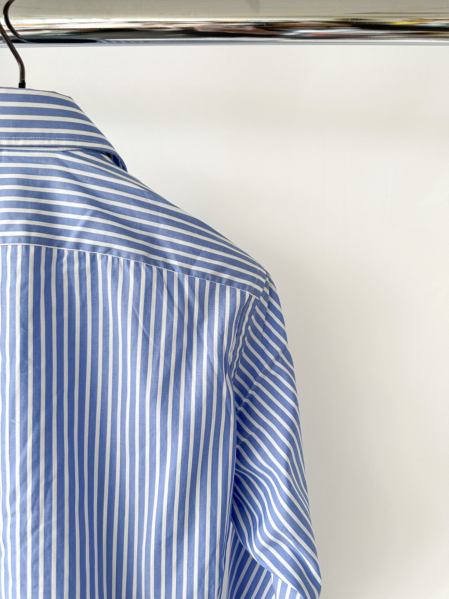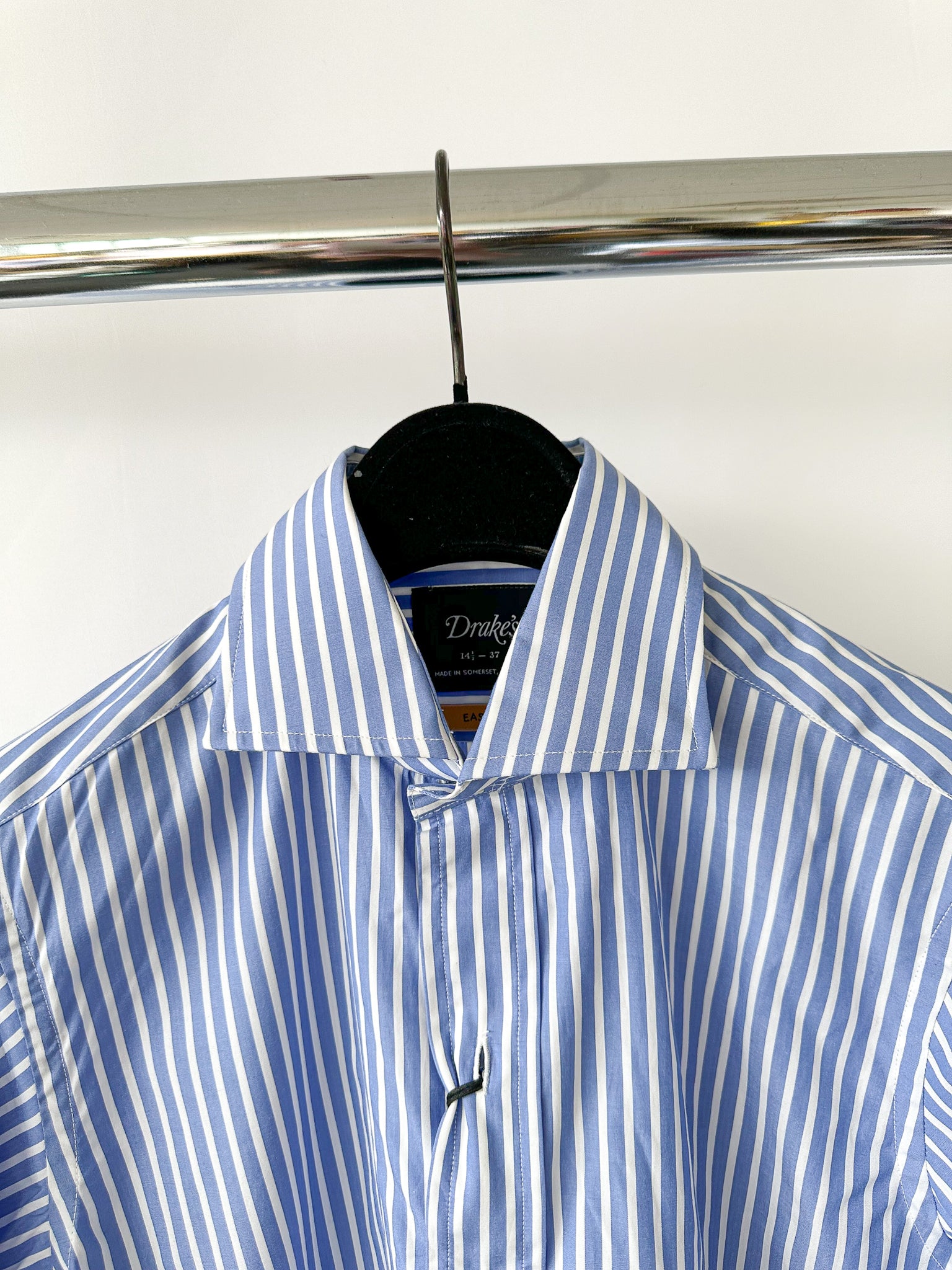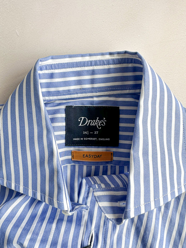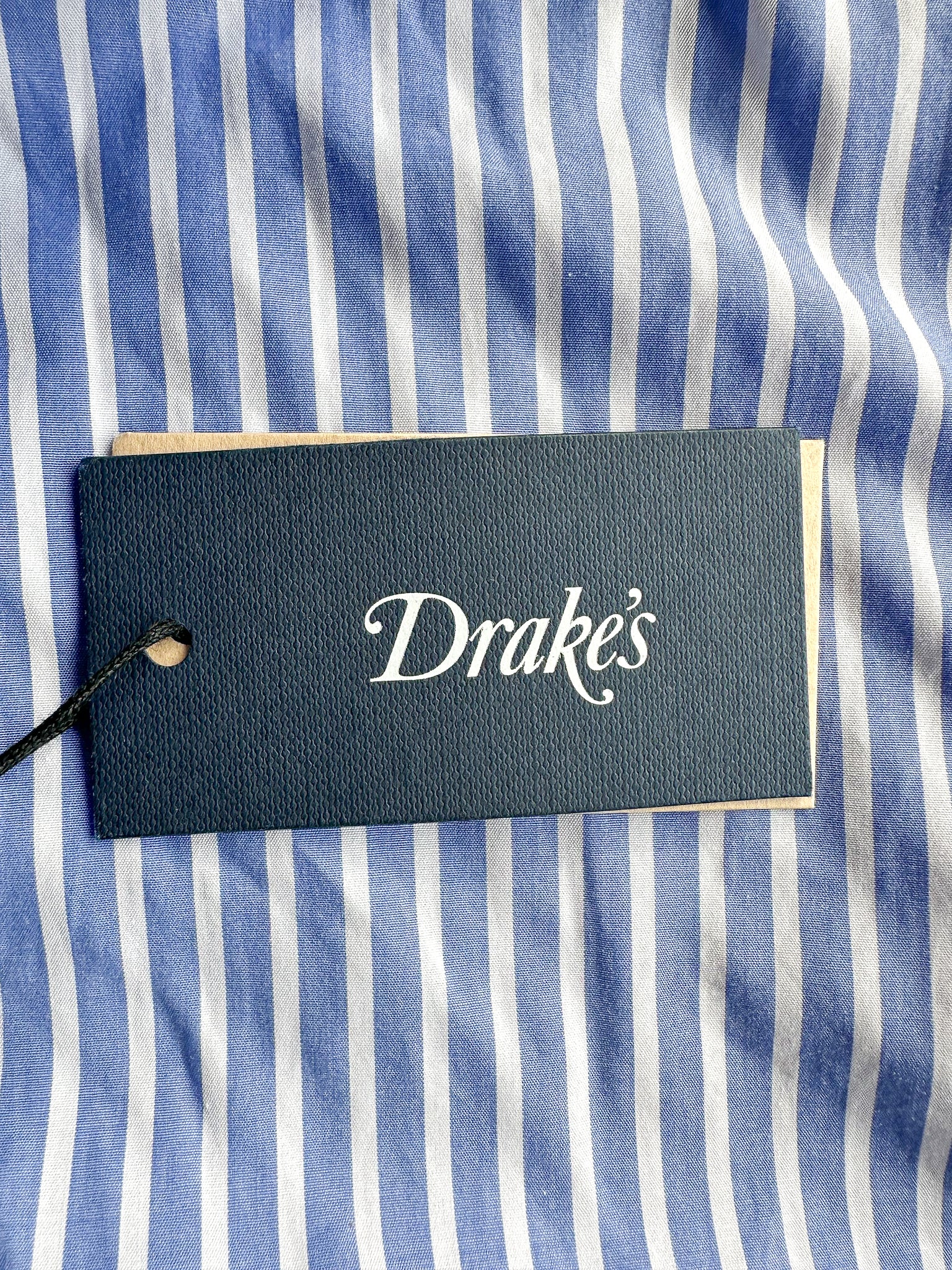 Crafted in England from fine cotton poplin, Drake's Easyday Blue White Striped Shirt offers timeless style and exceptional comfort. Its classic blue and white stripes bring a fresh, versatile look perfect for both casual and smart occasions. Lightweight and breathable, this shirt ensures all-day ease while elevating your wardrobe with effortless sophistication.