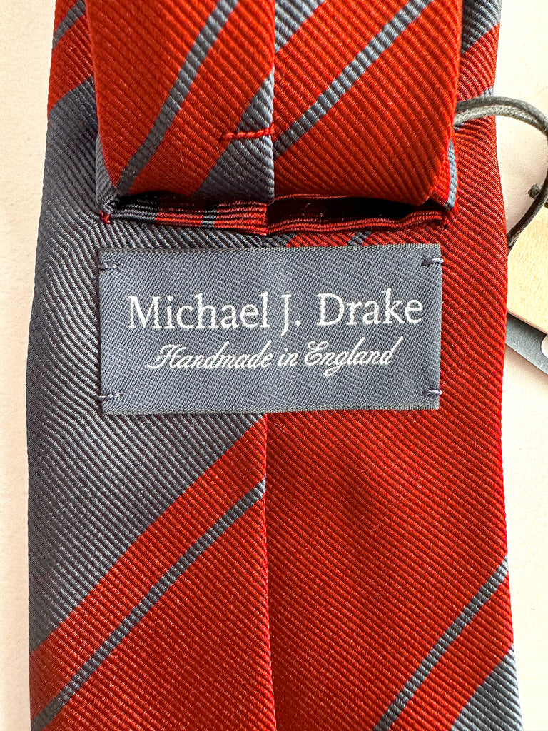 Elevate your style with Drake's Michael J Drake Red Navy Striped Ivy League Tie, a bold statement crafted by hand in England. Its striking red and navy stripes capture classic Ivy League spirit with a daring edge, perfect for those who command attention. This tie blends tradition with fearless flair, making every outfit unforgettable.